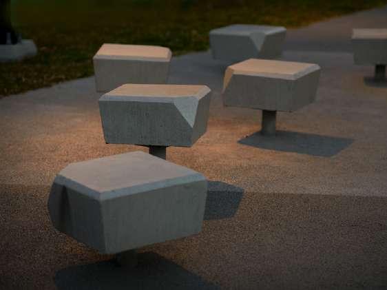 簡約的混凝土座椅錯落在公園各處提供休憩,材質呼應建築結構,也 成為照明氛圍營造的著力之處。