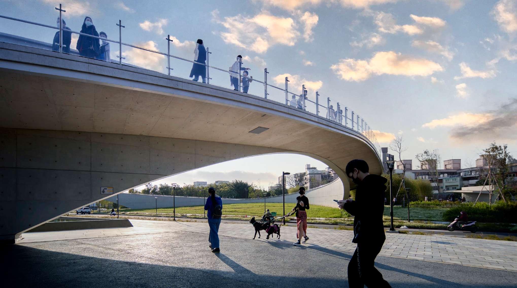 藉由轉身為紀念公園的過程,除了提點出對歷史戰事的紀念意義,最重要的議題是將基地與都市關係縫合,使之成為大眾 重要的開放空間。本次改造核心是非典型陸橋,全幅圓弧橋樑跨越兩地塊,壓縮道路尺度,使其從兩地切割線轉變為穿越 地景的景觀路徑,而分隔的兩地塊也重新聚合成為同一個場域。