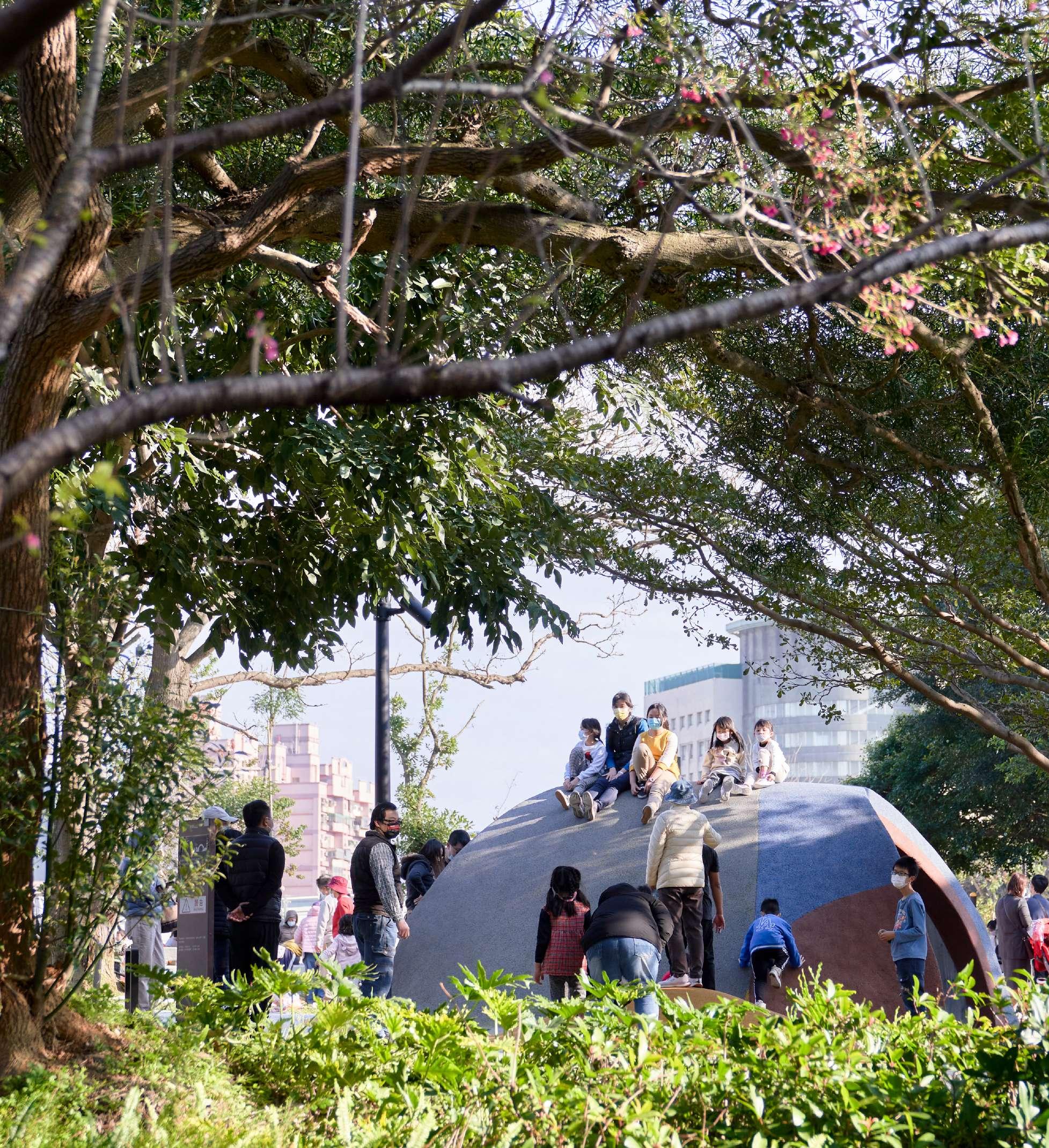 保留基地裡的大樹,融合滯洪、樹丘、遊戲場等起伏地形,提供結合都市防災、林蔭下的嬉戲 環境