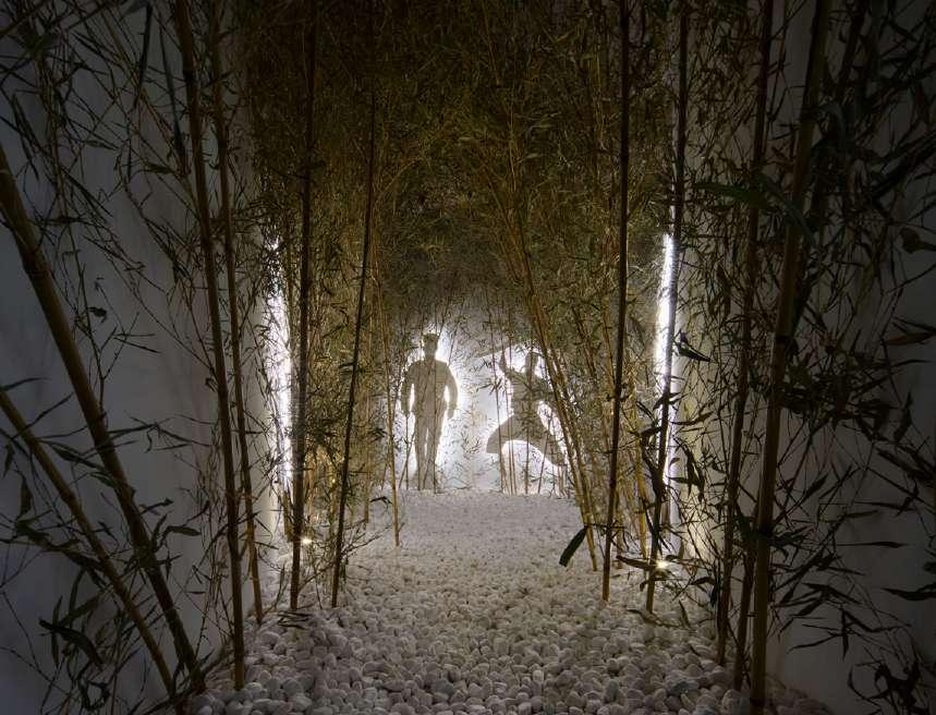 本次改造在公園內鑲嵌停車場、地下策展間、紀念碑區、服務設施等建築空間,透過路線配置,導引使用者走在一條能自然 閱讀乙未戰事敘事的路線:使用者在地下停車場停車後,第一眼先看見策展間的乙未戰事策展,在走入公園前能夠對這段土 地歷史背景;而後沿著斜坡而上,乍然出現在開闊的公園中,見到當代人們穿梭在竹叢間,彷彿百年前時空場景之延伸;走 入紀念碑區,大面積水面在喧囂都市中劃出一方平靜視野,帶來緬懷之心境;走上跨越兩基地之天橋,則伴隨帶著槍眼的高 牆,浮現公園俯瞰全景、並能遠聎都市天際,一步一步導引使用者對今昔空間對話的聯想。