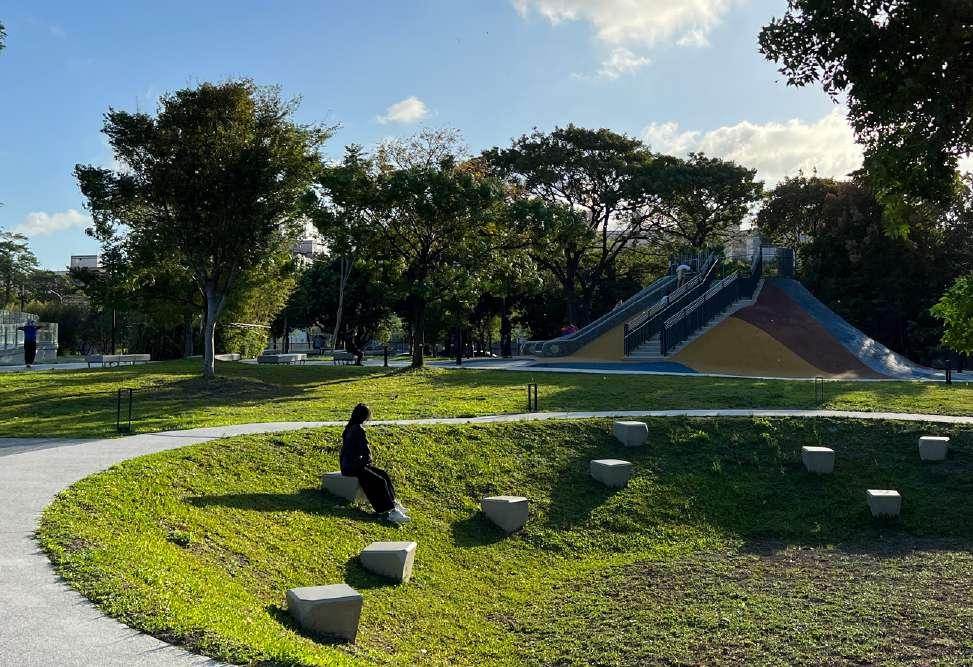 西側基地圈圍出不同形式的活動環,維持原本鄰里公園的機能,地景遊戲丘、沙坑、攀岩場、溜滑梯、地板遊戲區等多樣性及通用性,提供不同年 齡層的孩童乃至大人在此歡笑活動;而前人對土地的付出,如今化為後世以自由、融合、歡快之姿接觸共享的歷史,在笑語中延續世代的紀念。