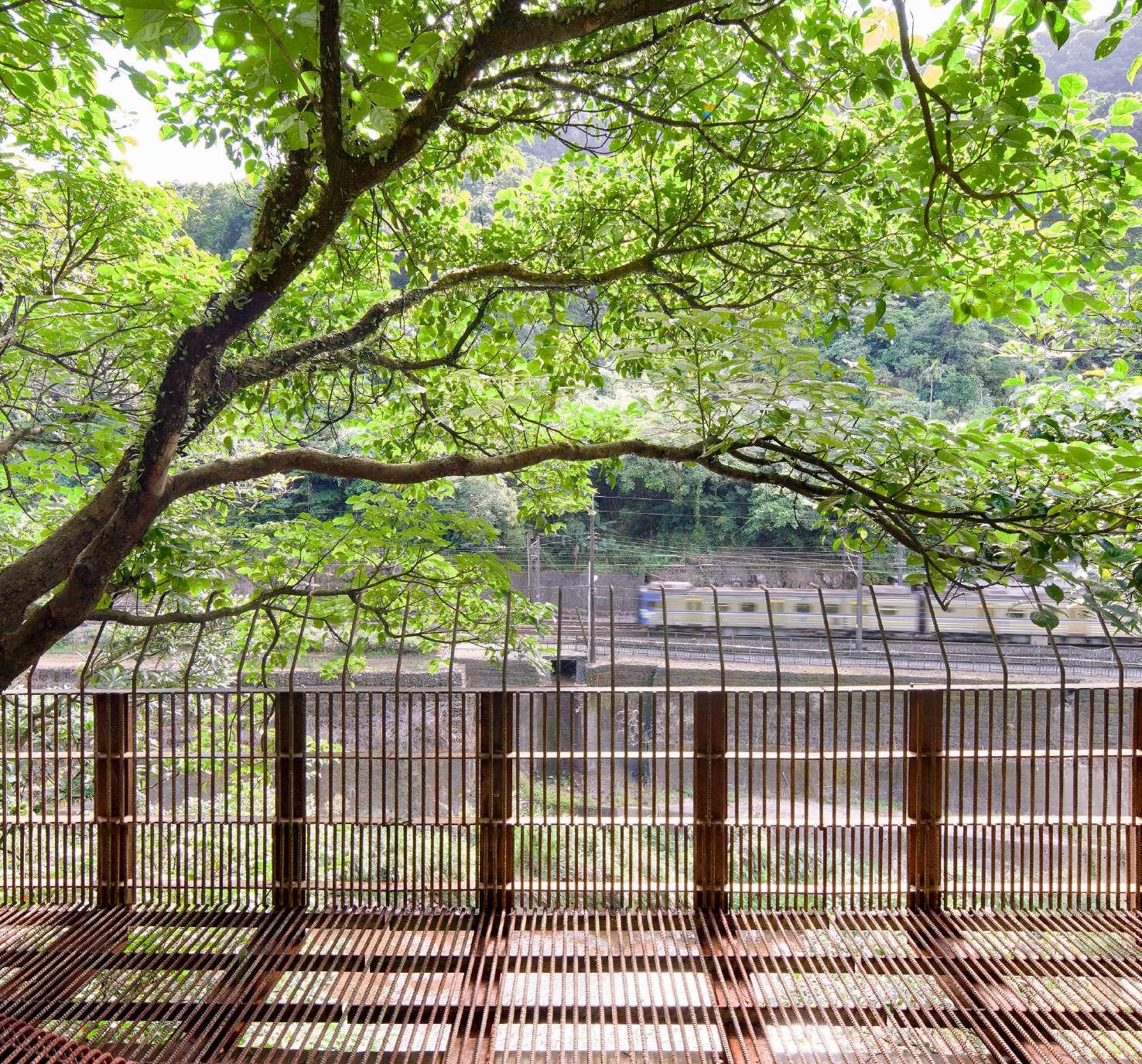 形式上以圓切線的邏輯,規律、盡可能地貼近不規則的岩壁; 步道中納入既有的樹木,也讓植物穿透、攀附,鋼筋格柵使得 視線通透,材料的重複漸變,模糊設施與植被之間的界線,在 快速移動下,下方的景色可以完整呈現。