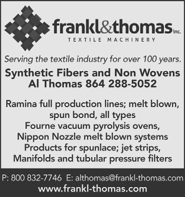 BC Technical Services Carrollton, GA 864 582-1900 Chase Machine & Engineering West Warwick, RI 401 821-8879 Allstates Textile Machinery, Inc. Williamston, SC 864 847-7757 American Superba, Inc. Dalton, GA 706 277-5400 ARC Machine Company, Inc. Henderson, KY 270 826-0339 Belmont Textile Machinery Co. Mount Holly, NC 704 827-5836 Birch Brothers Southern, Inc. Waxhaw, NC 704 843-2111 Bosch Rexroth Corp. Hoffman Estates, IL 847 645-3600 C.A. Litzler Co., Inc. Cleveland, OH 216 267-8020 CCS, Inc. Kings Mountain, NC 704 734-5100 Coker & Associates of SC, LLC Greenville, SC 864 720-9333 Crowther Machinery Ltd. Longueuil, QC 450 677-1166 CTE International, Inc. Spartanburg, SC 864 579-7760 Diversified Systems, Inc. Greenville, SC 864 271-2668 Fi-Tech, Inc. Midlothian, VA 804 794-9615 Ford, Trimble & Associates, Inc. Inman, SC 864 415-1641 Gastex, LLC Gastonia, NC 704 824-9861 Harrell Machinery Sales, Inc Dalton, GA 706 278-1511 HAS Group Martinsville, VA 864 415-9674 Independent Machine Co. Fairfield, NJ 973 882-0060 Industrial Fabricators Cheraw, SC 843 537-5431 Lang Ligon & Co., Inc. Greenville, SC 864 288-7993 Marsh Bellofram Newell, WV 800 727-5646 McCoy Machinery Company, Inc. Monroe, NC 704 289-5413 Menzel LP Spartanburg, SC 864 576-5690 Morrison Berkshire, Inc. North Adams, MA 413 663-6501 Pad Print Machinery East Dorset, VT 802 362-0844 Parker Hannifin Corp. Cleveland, OH 800 272-7537 Pawtucket Mill Supply Co. Pawtucket, RI 401 722-0950 Pinnacle Converting Equipment Charlotte, NC 704 376-3855 Rockwell Automation, Inc. Milwaukee, WI 414 382-2000 Selco, Inc. Spartanburg, SC 864 574-6699 Symtech, Inc. Spartanburg, SC 864 578-7101 TubeTex / Navis Tubetex Lexington, NC 336 956-6444 Tuftco Finishing Systems Dalton, GA 706 277-1110 United Textile Machinery Corp. Fall River, MA 508 676-8247 Van De Wiele - IRO, Inc. Ooletwah, TN 423 551-8901 Zimmer America Corporation Cowpens, SC 800 458-3194 ACIDS AIC Framingham, MA 800 238-0001 Arkema, Inc. King of Prussia, PA 610 205-7000 Ashland, Inc. Willmington, DE 302 995-3000 Avantor Performance Materials Inc Center Valley, PA 610 573-2600 Brenntag Mid-South Durham, NC 919 596-0681 Brenntag Mid-South Lenoir, NC 828 754-0980 Command Chemical Corp. Fairfield, CT 203 319-1857 First Source Worldwide LLC Neenah, WI 920 886-0444 Hexion, Inc. Columbus, OH 614 986-2497 Jarchem Industries Inc. Newark, NJ 973 344-0600 Kolene Corporation Detroit, MI 313 273-9220 Lenmar Chemical Dalton, GA 706 277-9505 Marlowe-Van Loan Corp. High Point, NC 336 886-7126 Momentive Performance Materials Waterford, NY 614 986-2495 Solutia, Inc. St. Louis, MO 314 674-1000 Special Materials Company New York, NY 646 366-0400 Spectra Colors Corp. Kearny, NJ 800 527-8588 Water Services, Inc. Knoxville, TN 800 251-4705