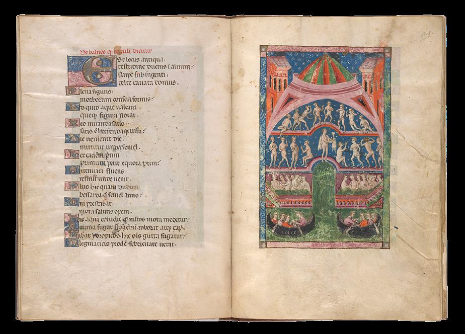 2. Peter of Eboli (fl. 1196-1220), Baths of Pozzuoli. Southern Italy, ca. 1400. Morgan Library & Museum, MS G.74, fols. 20v-21r. Gift of the Trustees of the William S. Glazier Collection, 1984.
