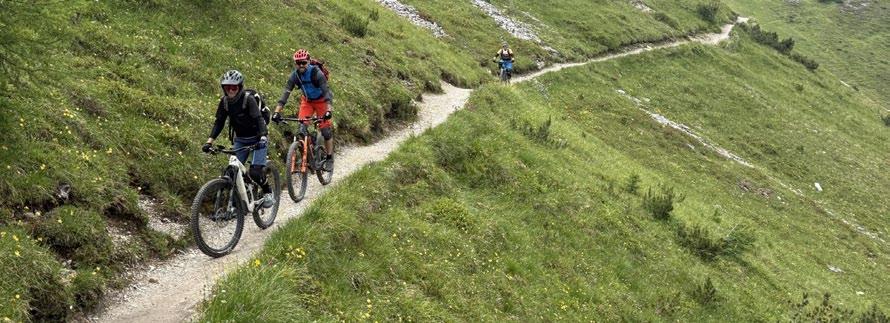 Gruppe Zwei (drei Radler) setzt sich ein ambitioniertes Ziel: Das Traum-Panorama auf der 2300 m hoch gelegenen Starkenburger Hütte. Die 1100-Hm-Trailabfahrt von da ist eine der schönsten in der Gegend, jedoch fordernd – aber alle meistern sie natürlich mit Bravour.