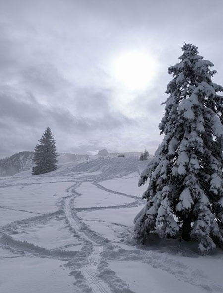 Am letzten Tag sind wir unsicher, was wir unternehmen sollen. Keiner hat Lust, sich noch einmal durch das Bachbett zu quälen. Wir beschließen deshalb auf die Weißlahn zu gehen. Das ist ein schattseitiges Kar mit ca. 1.000 Hm. Man kommt auf keinen Gipfel. Die Tour endet da, wo man die das Kar umgebenden Felswände erreicht. Das erste Stück kämpfen wir uns durch ein Latschenfeld, aber dann wird es schnell besser. Weiter oben finden wir besten Powder und es hat auch eine bessere Unterlage. Wir freuen uns über die mit Abstand besten Schneeverhältnisse des Wochenendes und ziehen unsere Spuren in den Pulverschnee. Und weil man von oben ganz toll sieht, dass es eine breite Schneise durch das Latschenfeld gibt, können wir mit Ski sehr passabel direkt bis fast zum Parkplatz abfahren.
