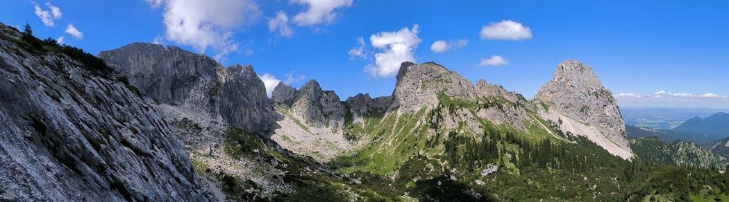 Am zweiten Tag geht es auf die Hochbrunner Schneid. Das ist eine recht lange Tour mit ca. 1.600 Hm. Los geht es über ein Bachbett, in dem viel zu wenig Schnee liegt. Sehr mühsam und anstrengend wursteln wir uns die erste Stunde durch Felsen und Latschen hoch, bis das Bachbett endlich breiter wird. Weiter geht es über eine angenehm zu gehende, breite Schlucht bis wir das „Innere Loch“ erreichen. Das ist ein langes, verstecktes Kar, das zum Schluss hin immer steiler wird und an einem Felsriegel endet. Wir machen dort Skidepot und dann geht es die letzten 250 Hm durchaus anspruchsvoll zu Fuß bis zum Gipfel. Die Landschaft ist wieder grandios und auch der Schnee scheint ganz passabel zu sein. Oben in der Sonne ist es eher firnig, weiter unten im Schatten hat es fast nicht verspurten Pulverschnee. Zum Schluss müssen wir dann durch das Bachbett zurück. Ob man so etwas mit Ski befahren kann? Bis zum Bachbett gings trotz zahlreicher Aufsetzer recht gut. Aber dann wurde es ernst. Mühsam rutschen wir auf Ski bergab. Dass wir mit Ski kaum