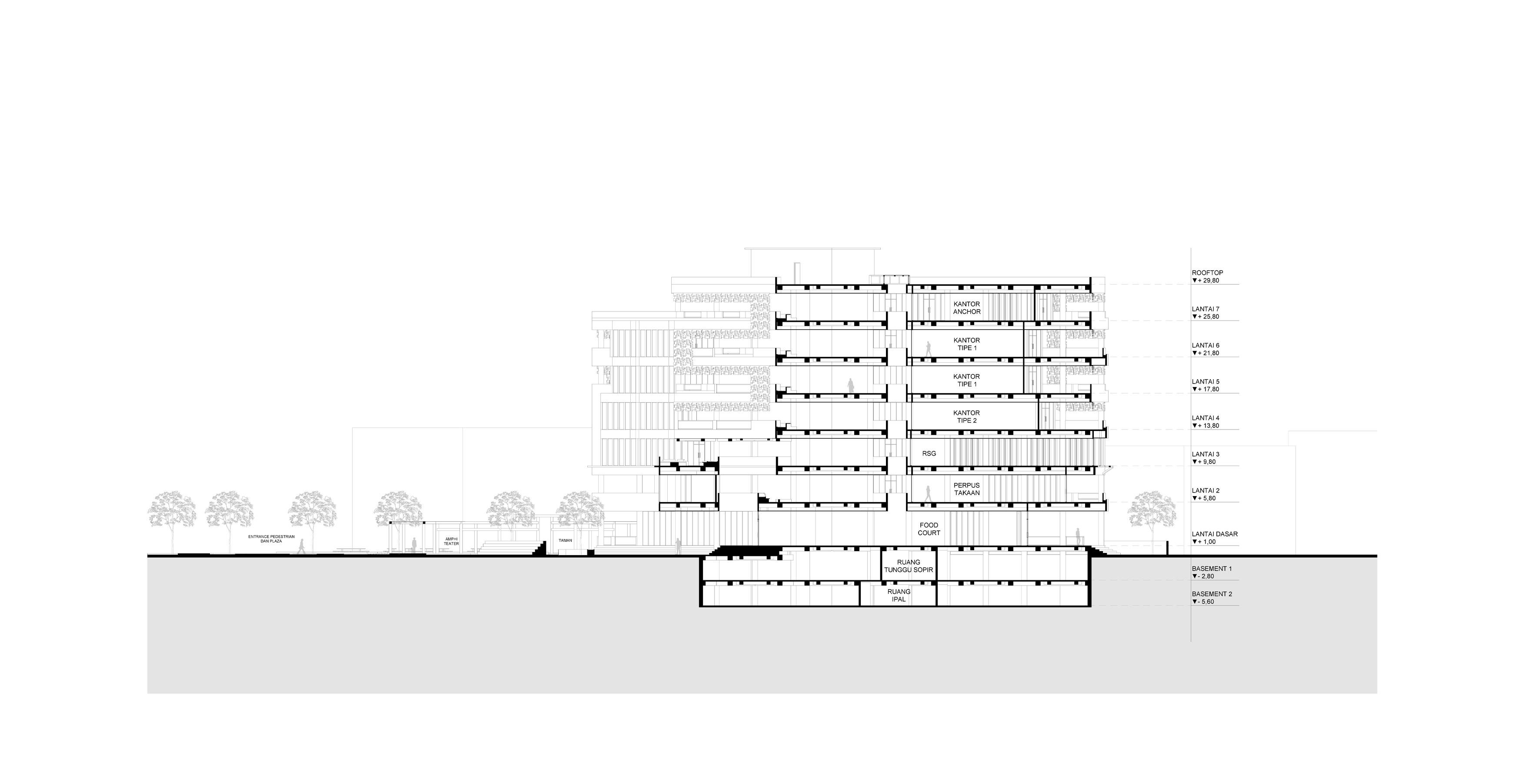 Terdiri atas atrium, plaza, taman, co-working space, amphiteater.