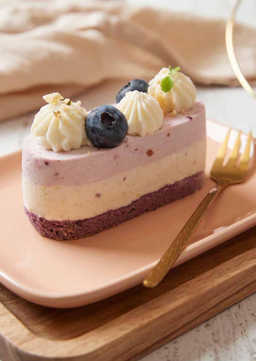 Roer Dawn Fond Neutraal Vegan, sojadrink, Dawn Compound Yuzu en water door elkaar tot een gladde massa. Werk hier de lobbige Vegantop in 2 etappes door. Strijk ca. 700 g yuzu bavaroise op de afgekoelde cake en vries in.