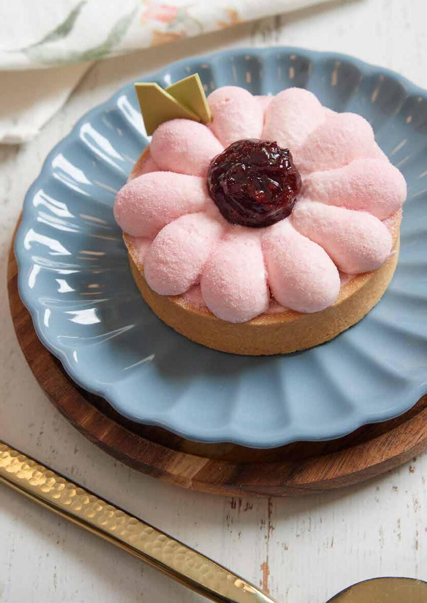 Gebruik voor dit recept tartelettes naar eigen recept. Spuit een spiraal van ca. 20 gram Royal Steensma Abrikozenjam in een tartelette van 8 cm ø.