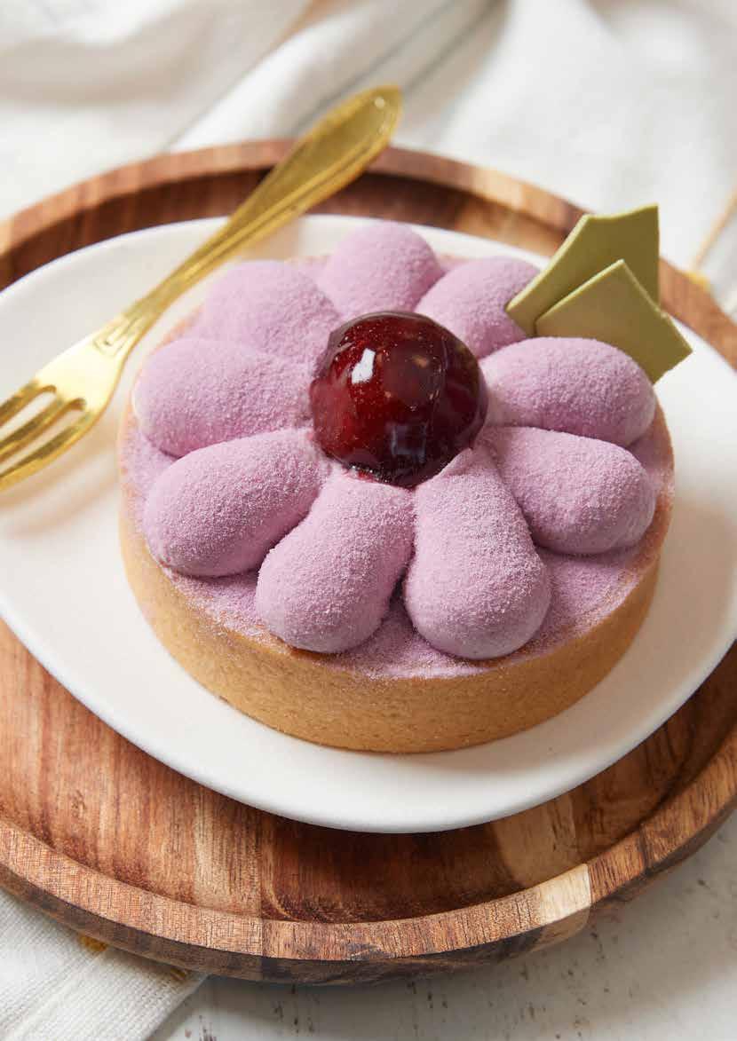Laat de buns afkoelen. Mix Royal Steensma Comfortgelei Neutraal met wat paarse kleurstof en geleer hier de buns mee af. Slap Dawn Fondant Sublime Wit af met 1,5% water en wat paarse kleurstof en breng dit aan op de afgeleerde buns. Werkt tot slot af met bosbessen en gevriesdroogde framboos.