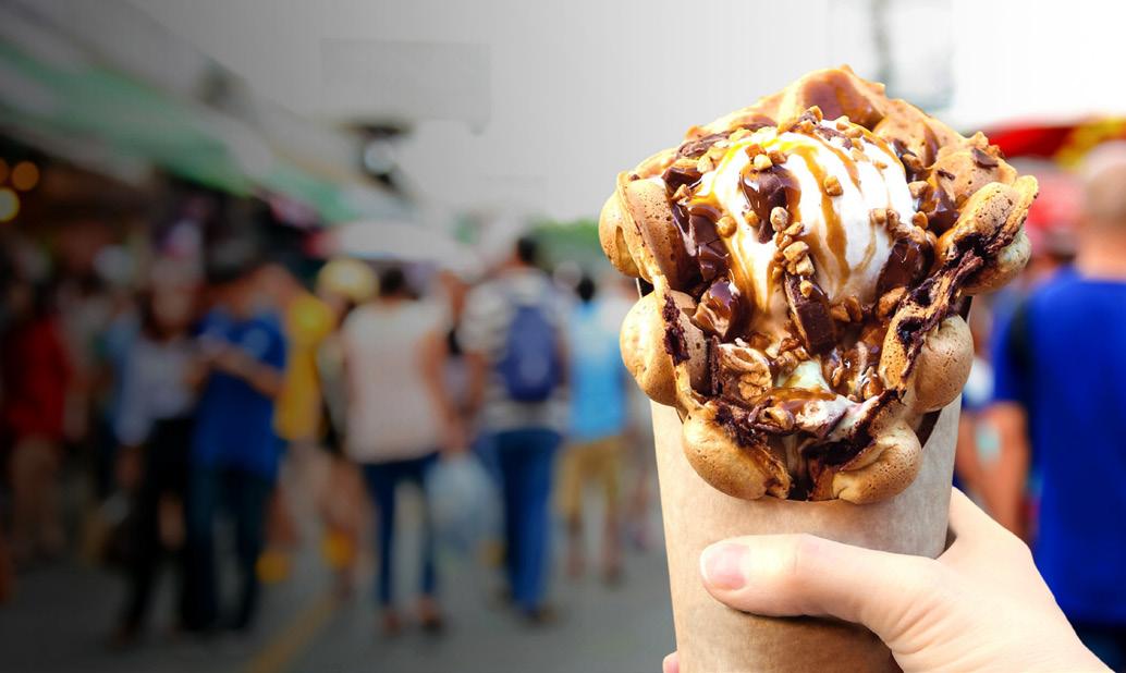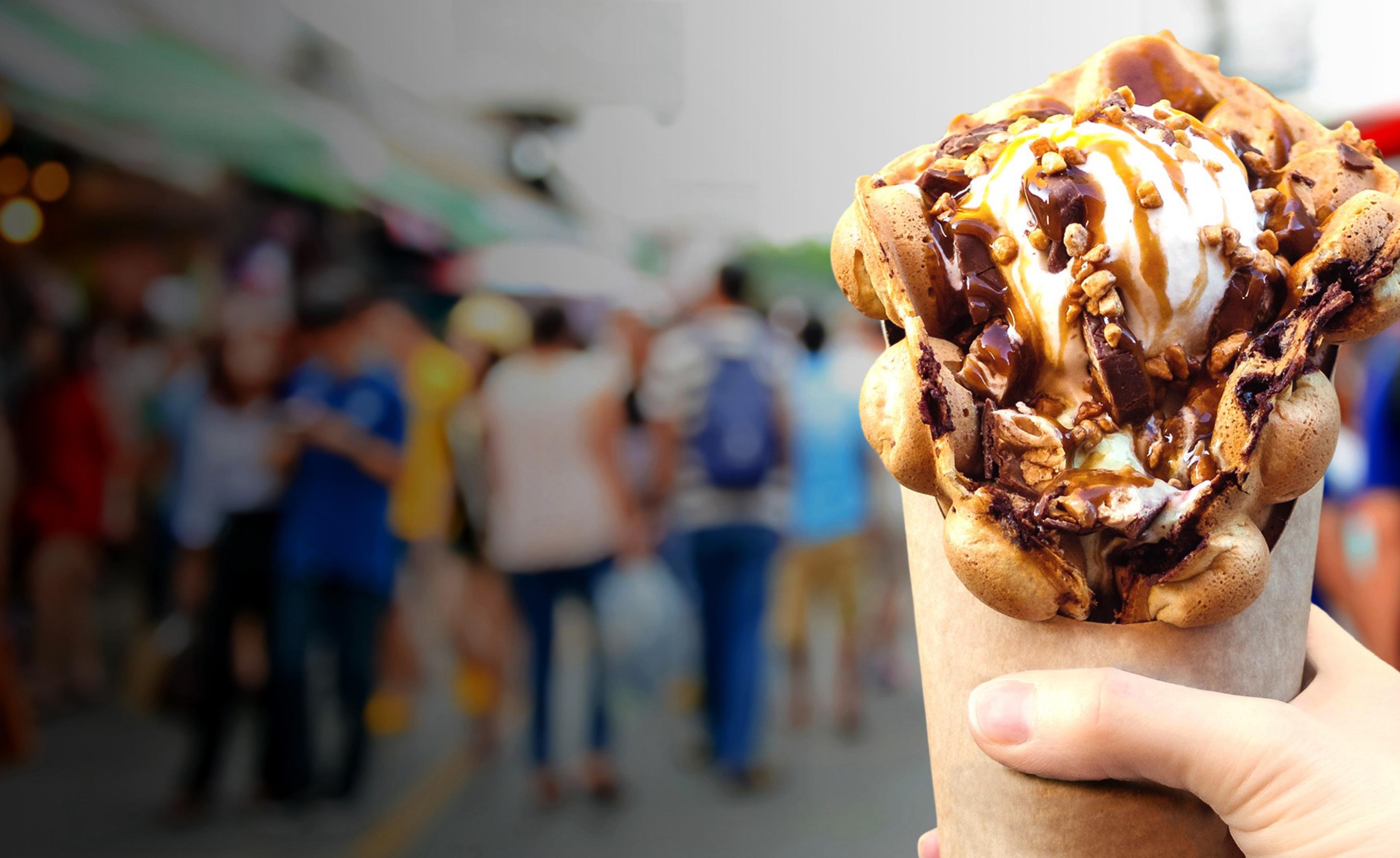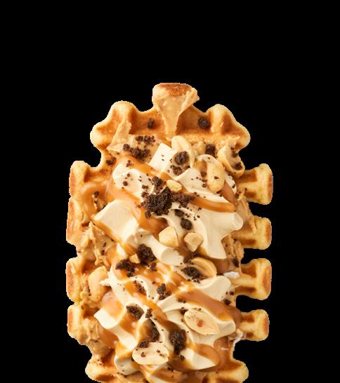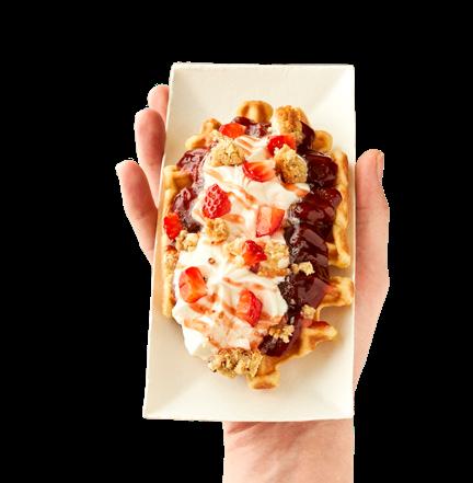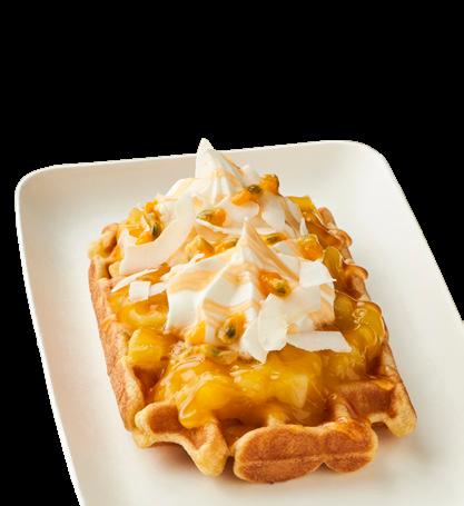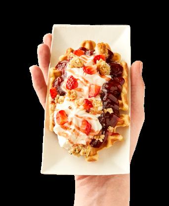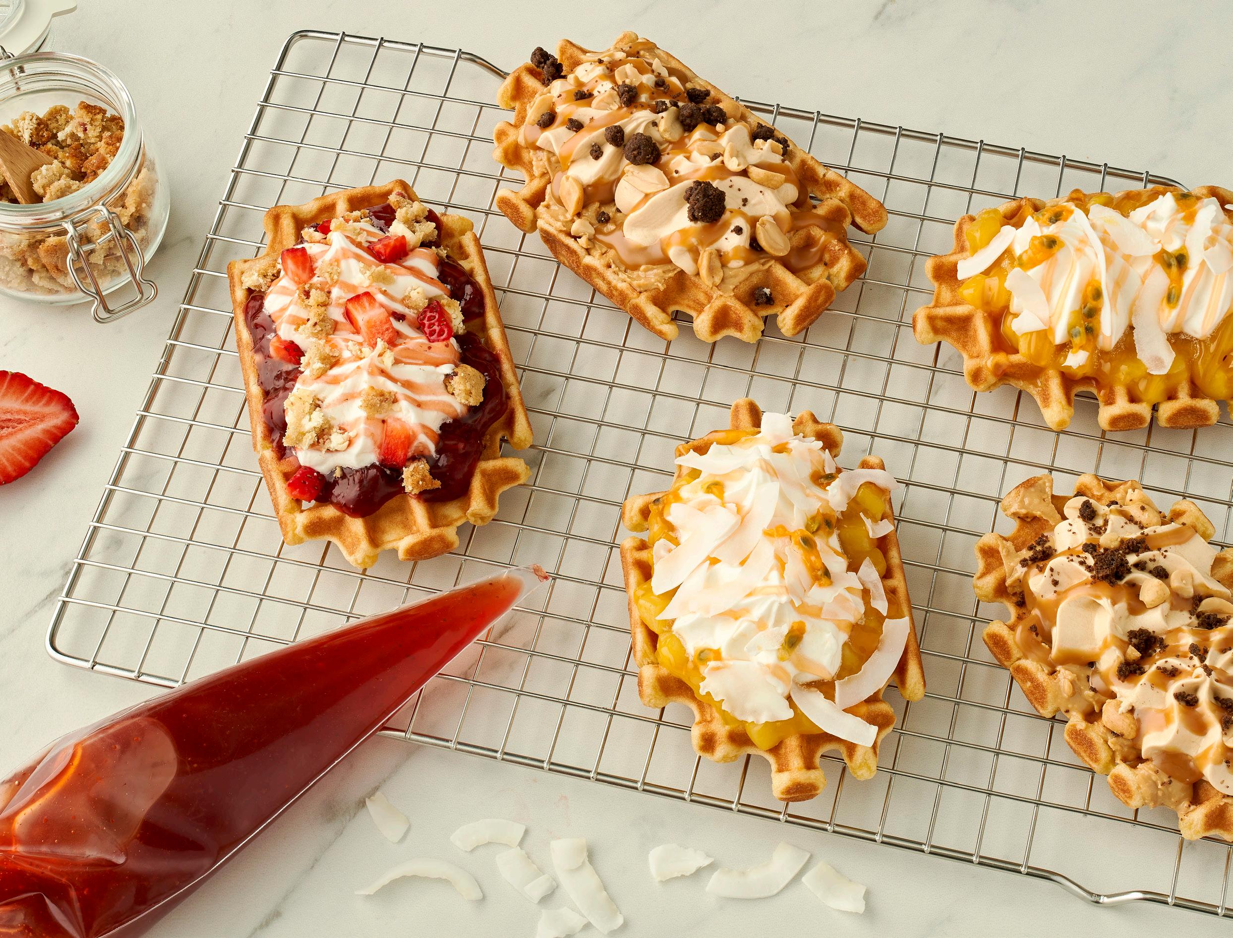 If possible, make your waffles fresh to order. Allowing your customers to see the baking process adds to the overall eating experience. Be inspired by seasonal fruits and holiday flavour classics. Add different textures like crunchy peanuts or smooth salted caramel. While I have suggested three different toppings on this recipe page, the possible combinations are endless.