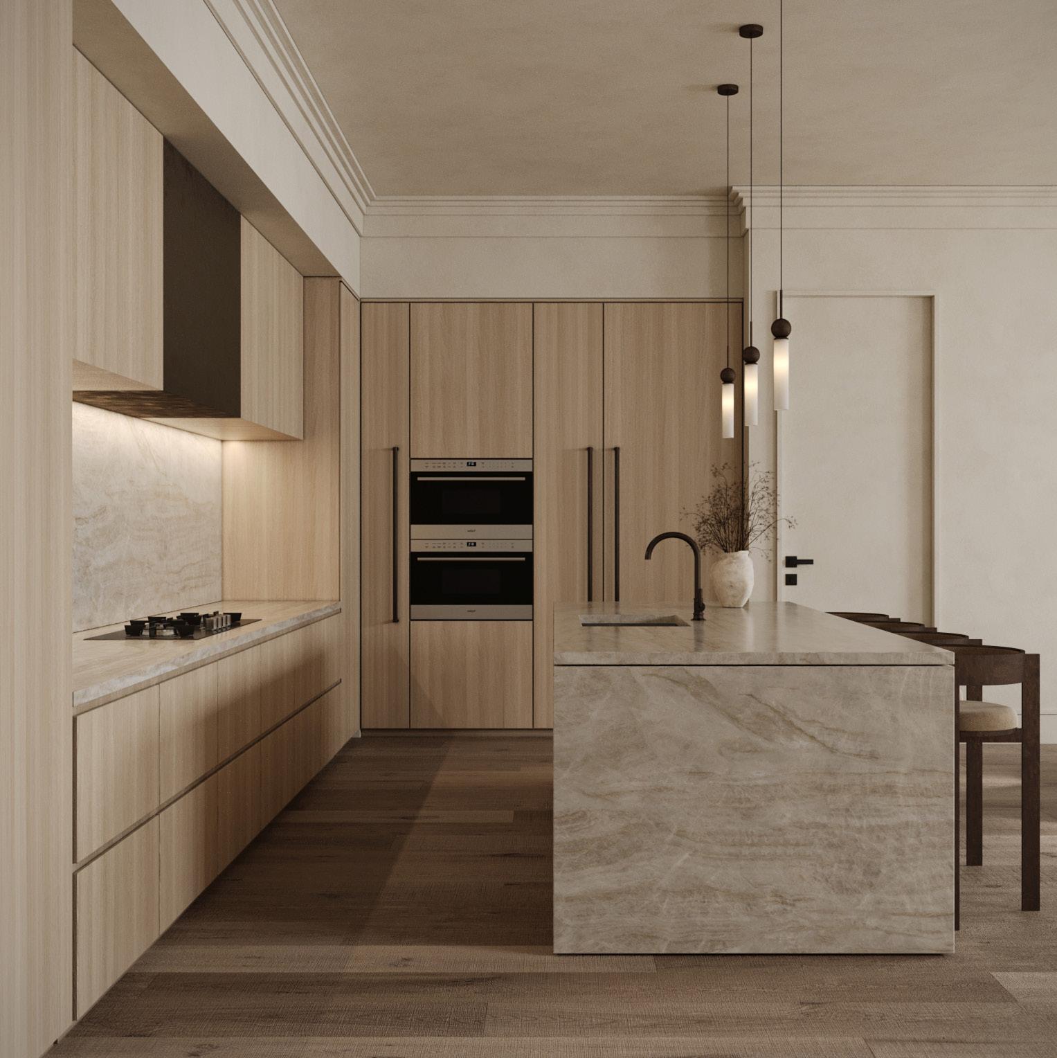 • Expansive Stone Surfaces – Large islands and full-height stone backsplashes for a bold, cohesive aesthetic.