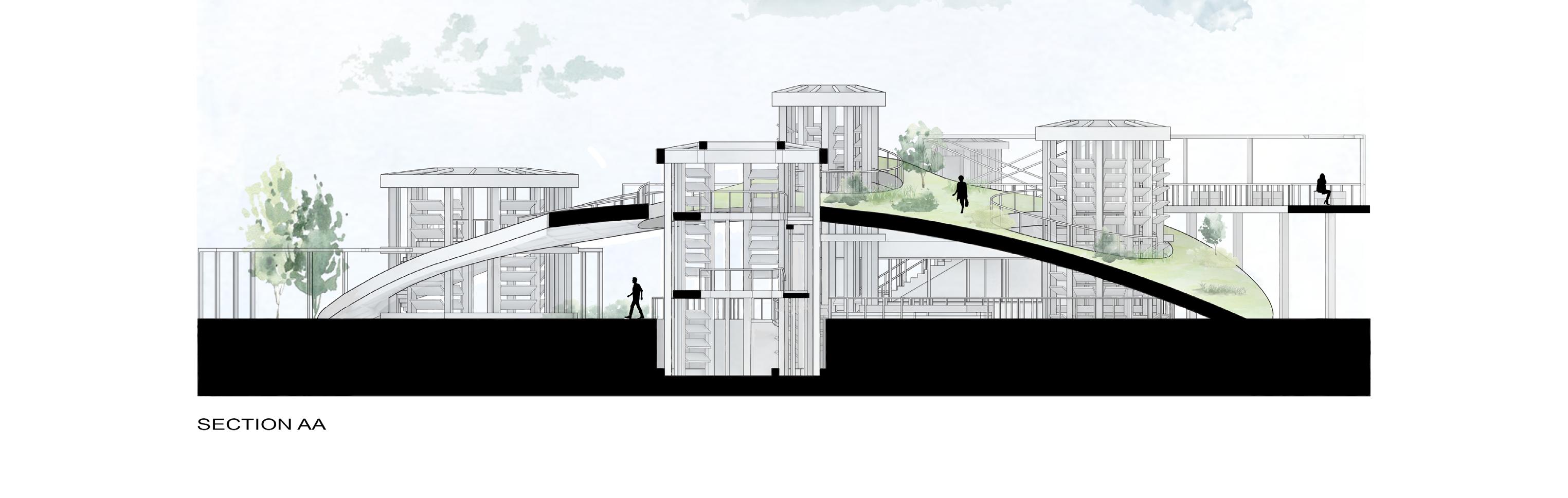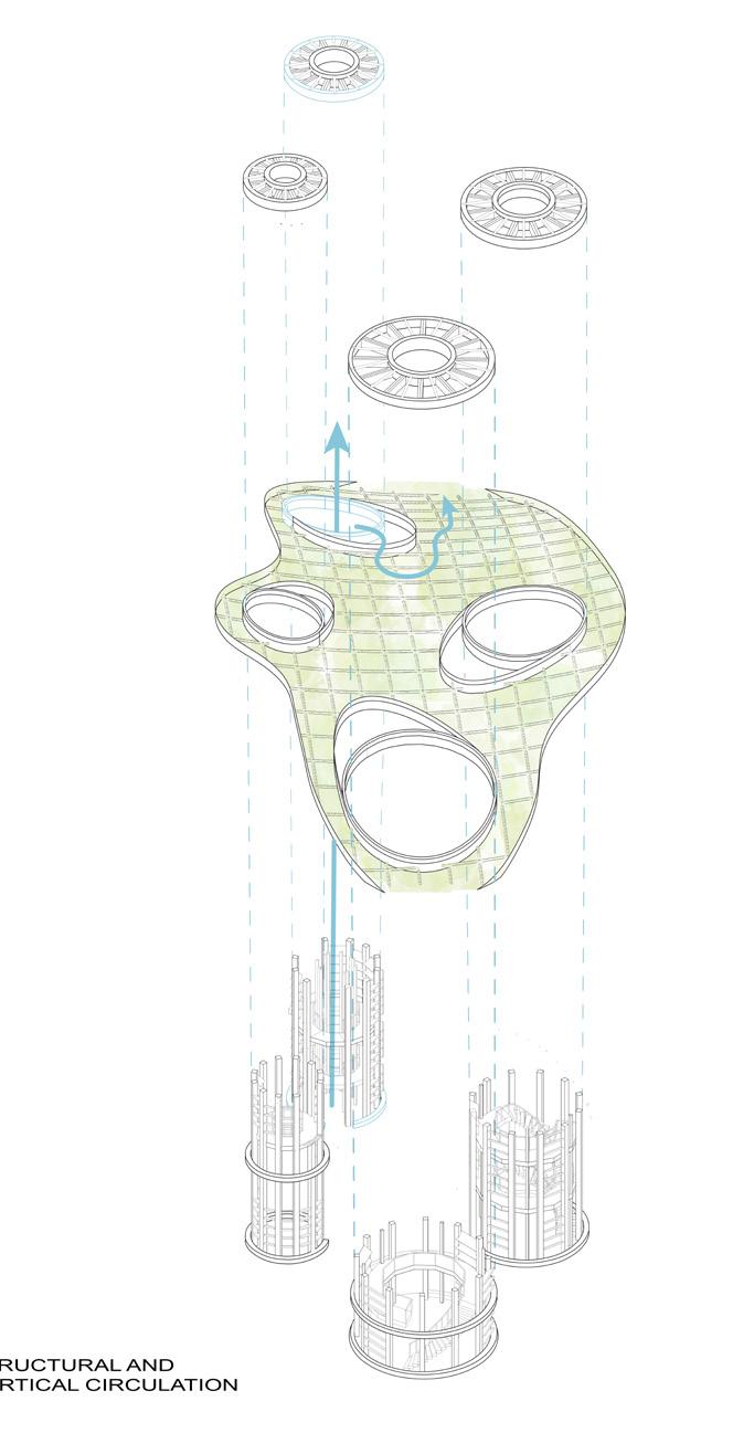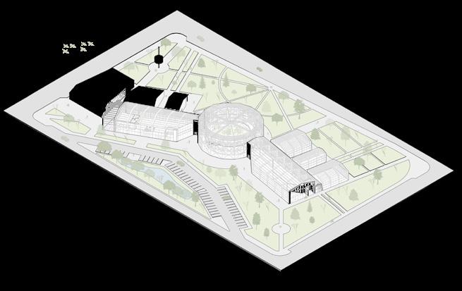 An organic green-roof mound shelters program below it with cylindrical growing spaces rising through openings in the ceiling. This mound shape mimics nature and protrudes out of the surrounding buildings that are very rigid. The abrupt curves are meant to make a stark contrast against a very linear surrounding area. The natural elements are intended to draw visitors from Main Street and beyond. This farming center focuses on aeroponic farming techniques that take place within cylinder greenhouses.