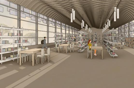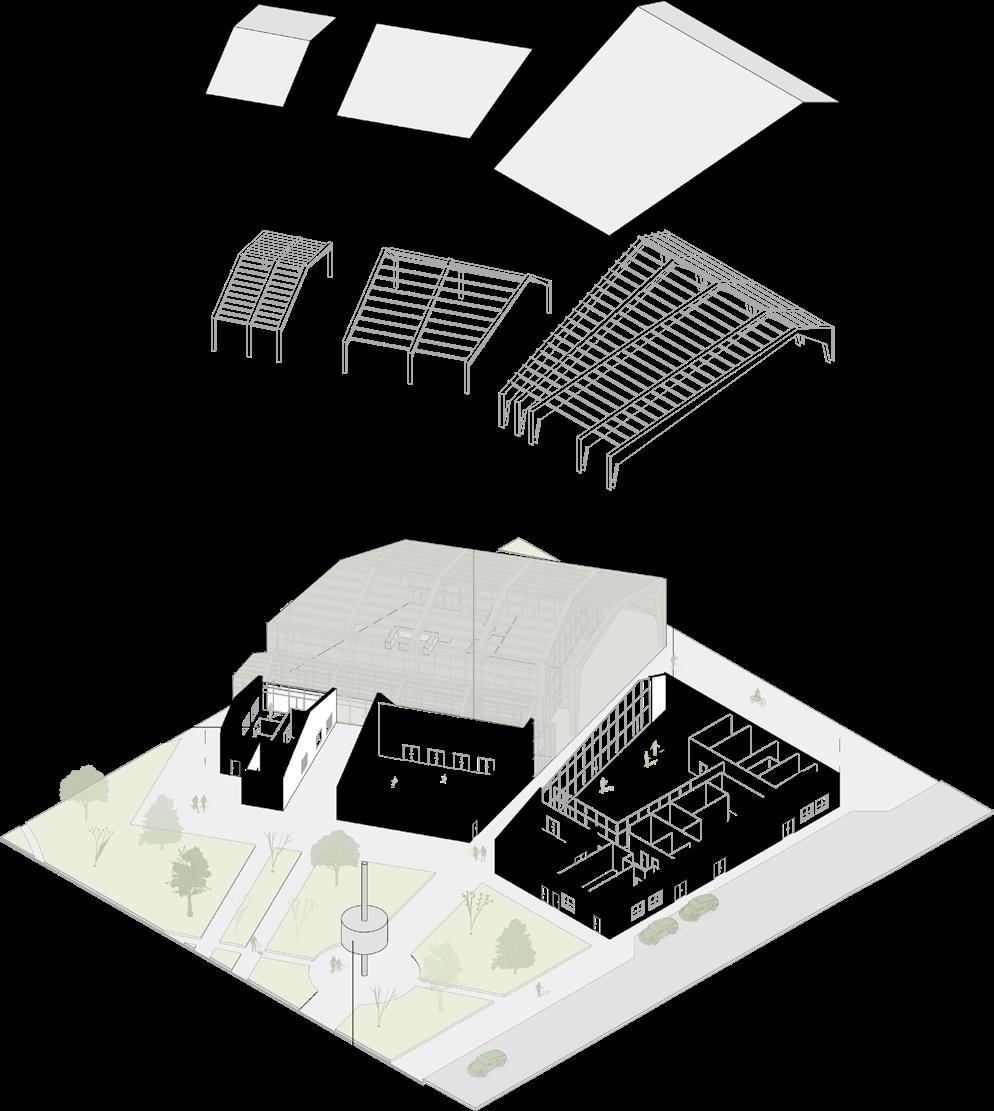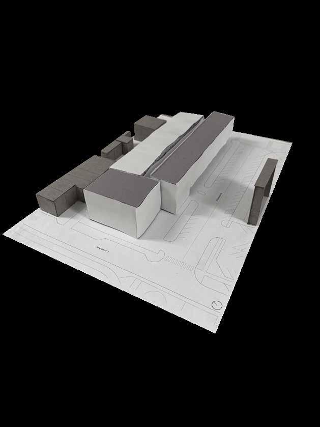 Four programmatic towers are latched onto the east side of the Fred Jones Art Center to streamline interior efficiency and provide more square footage for the college. These towers have variations of angled roof structures, which allow desirable northern light to enter studio spaces and create double-height space for those fourthfloor senior studios. Three new vertical circulation paths have been added, while classrooms, studios, and offices are situated in their own respective portions of the building. The original concrete structure of the building will be preserved, and the new structure will be heavy timber to contrast the new and old. The towers also frame a new East entrance that connects the school to the heavily trafficked North Oval, allowing guests to discover the building as they arrive from campus corner or the Boyd House parking lot. The new modern design integrates the visual arts school with the Fred Jones Jr. Museum of Art and creates a new identity for art on campus.