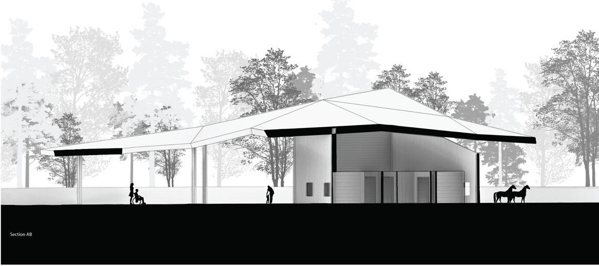 The design of the Equestrian Center is intended to frame the turnout pasture and the therapeutic riding area. These areas are circular in form naturally, and the building follows that same pattern. The rest of the Equestrian center is very geometric. The circular outdoor areas juxtapose against the rectilinear indoor spaces.