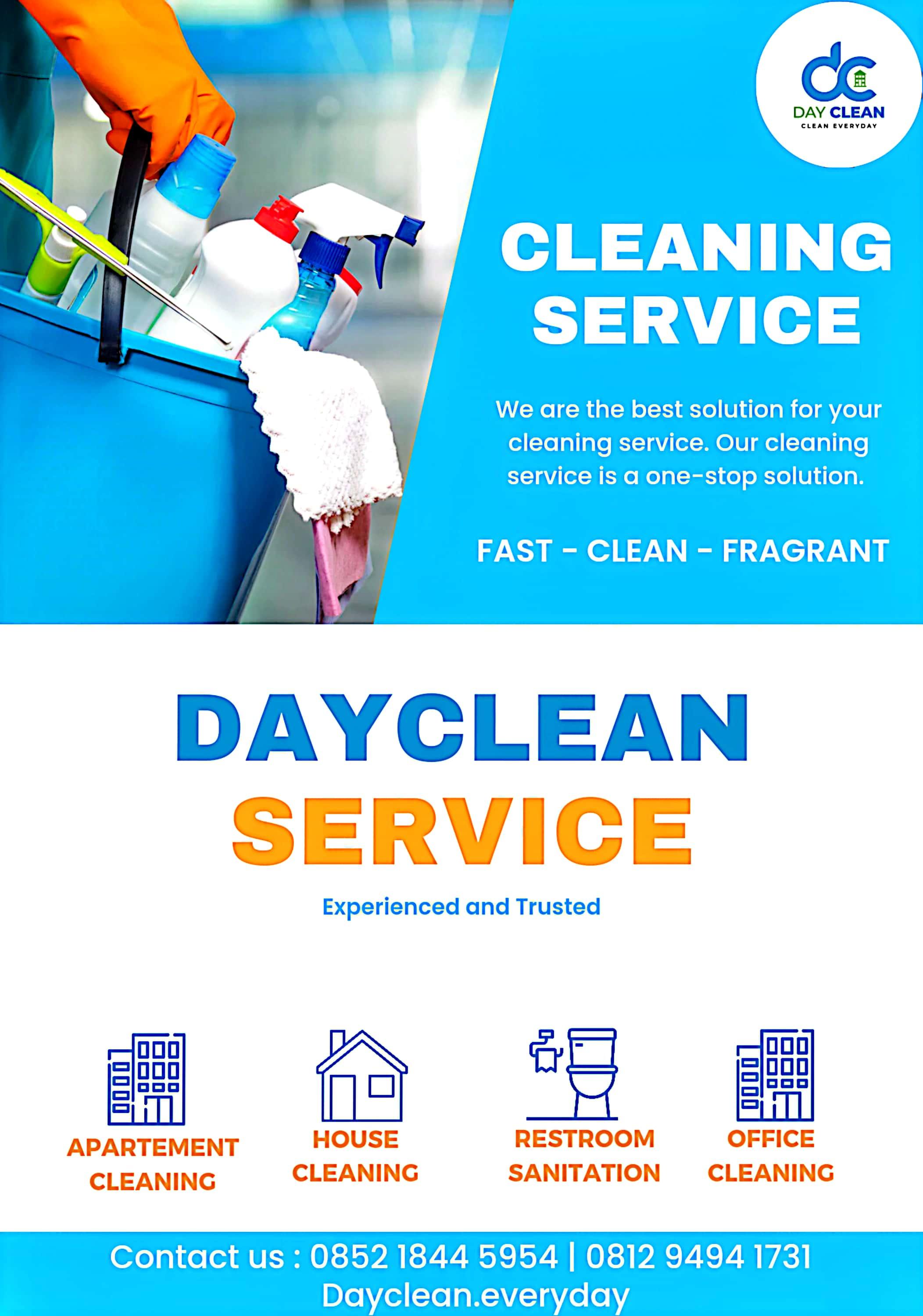Dayclean adalah layanan jasa kebersihan rumah, apartemen, kantor, gedung, gudang, tempat kost, dll.