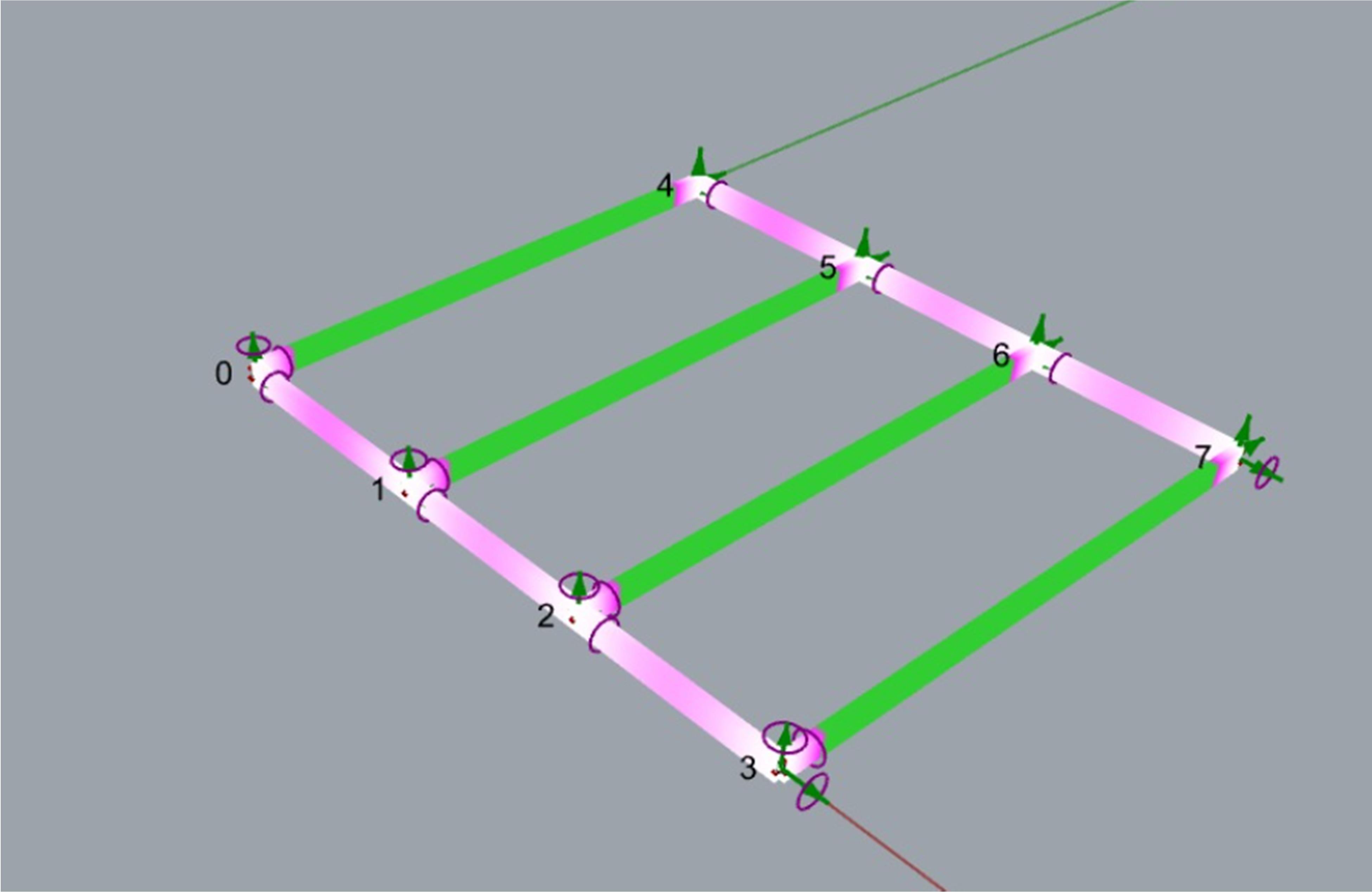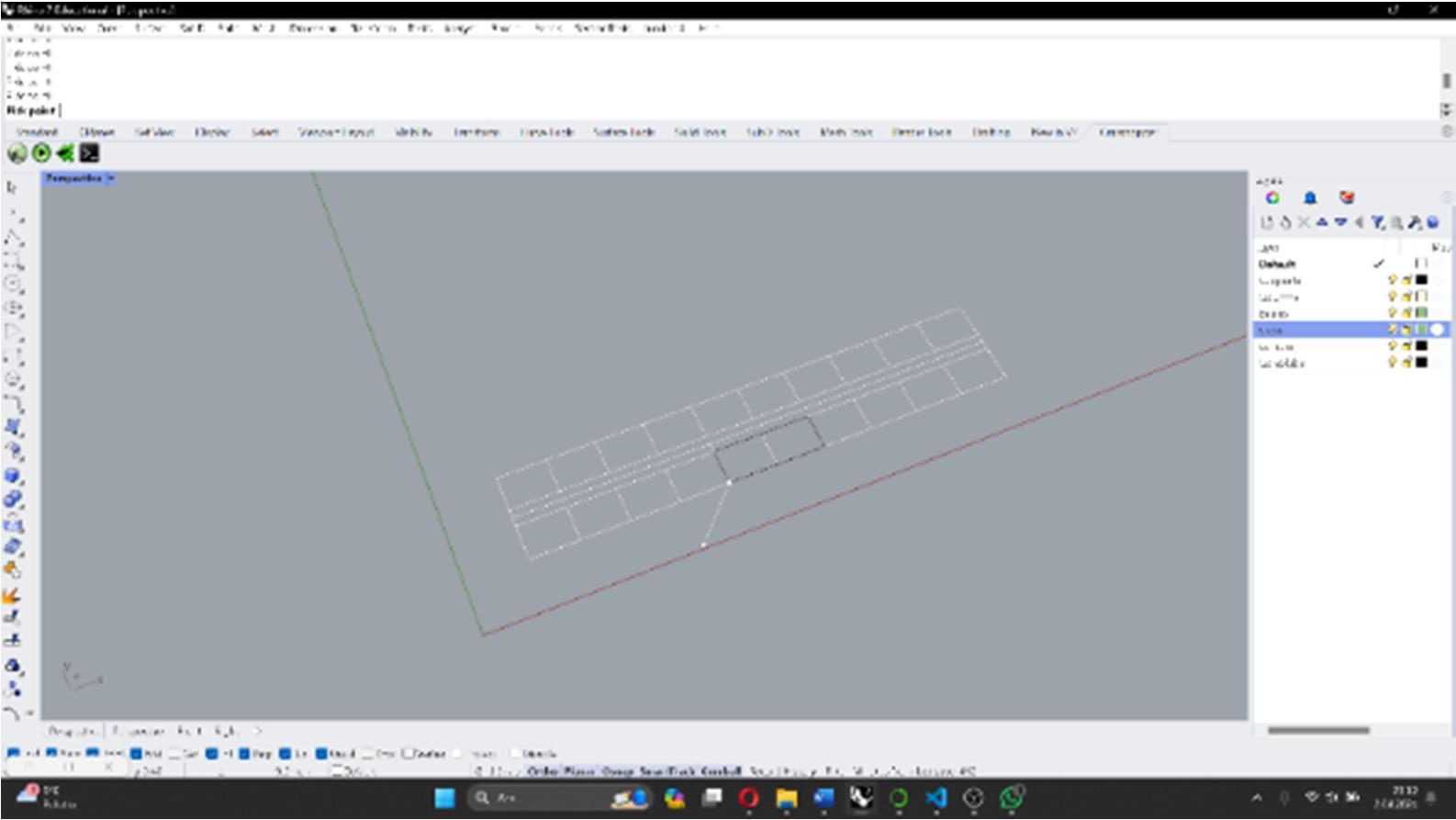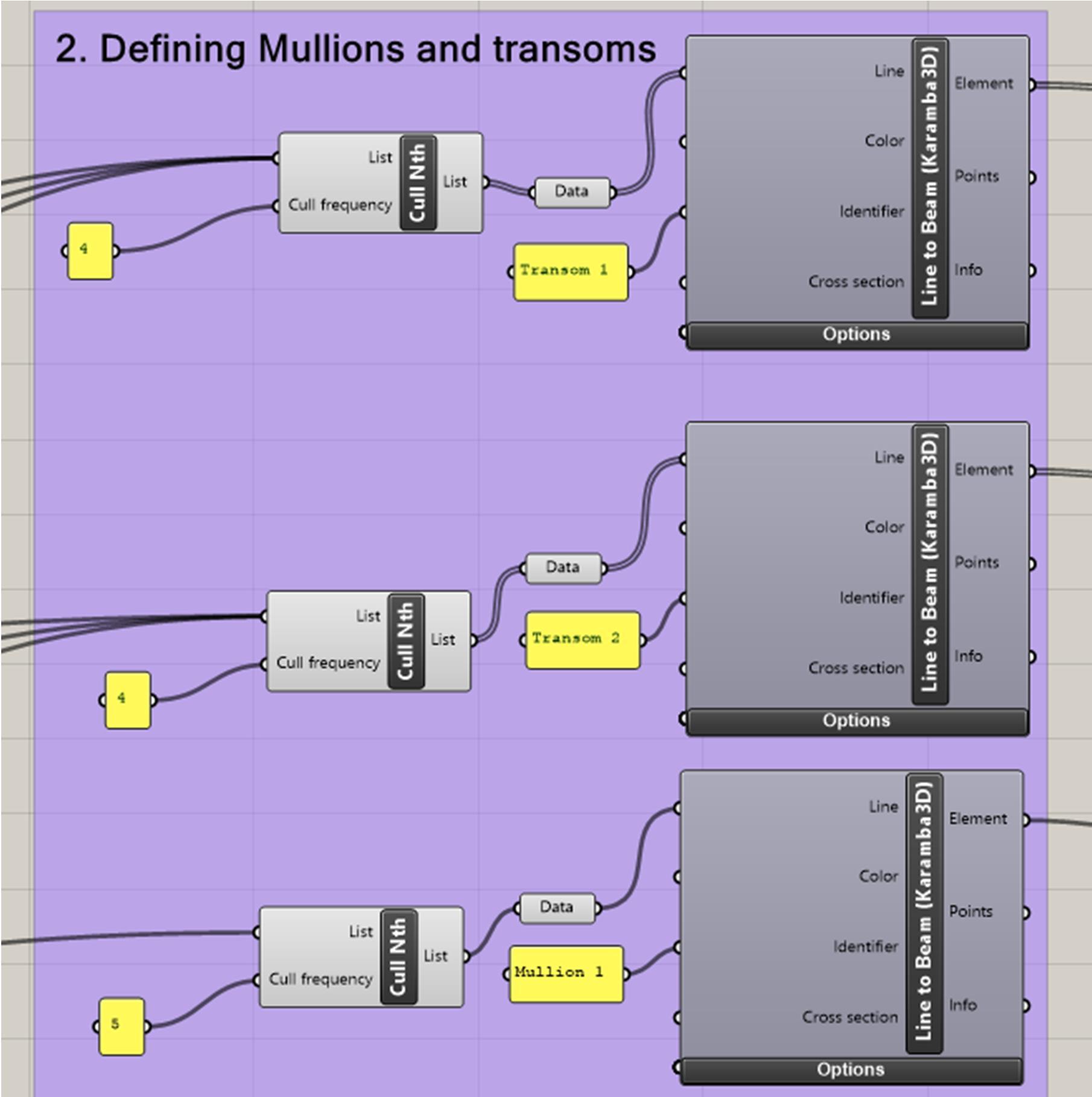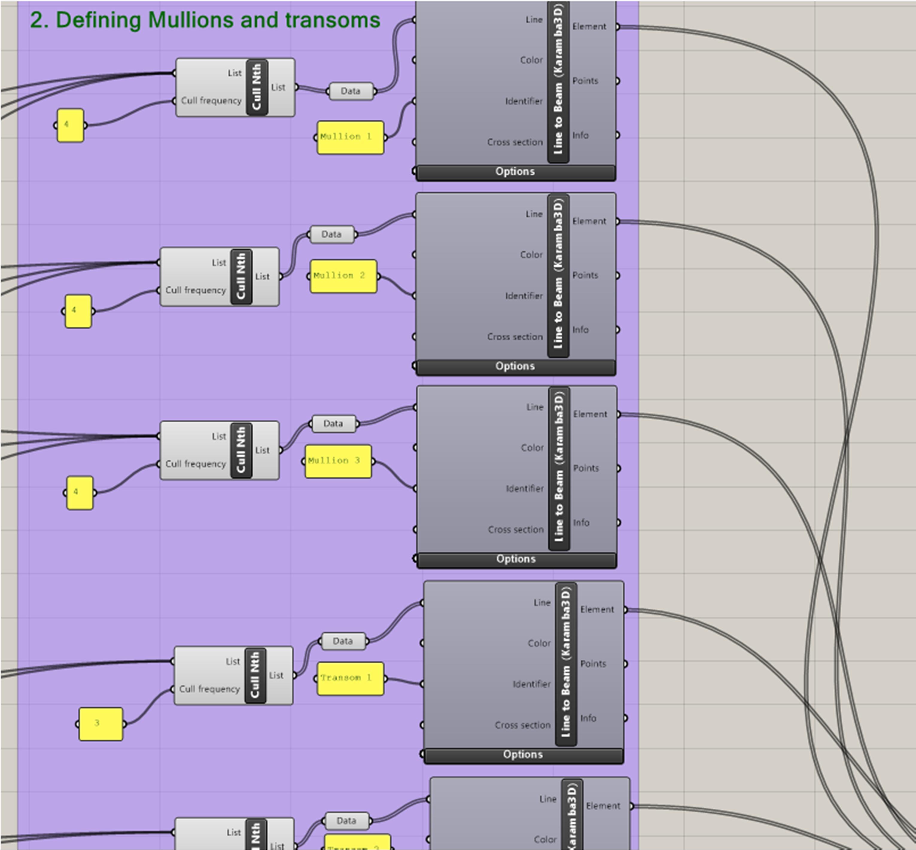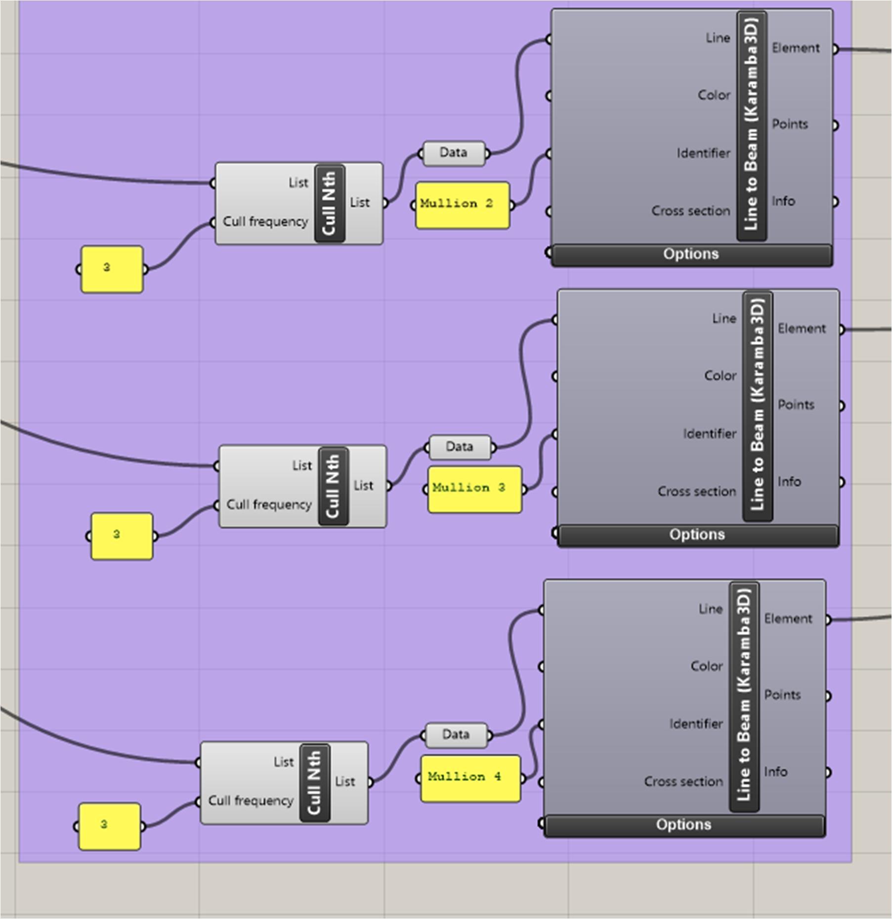 mull1 = rs.CopyObject(mull, [(length_transom+0.05)*i,0,0]) mullions.append(mull1) for j in range(0, 16):