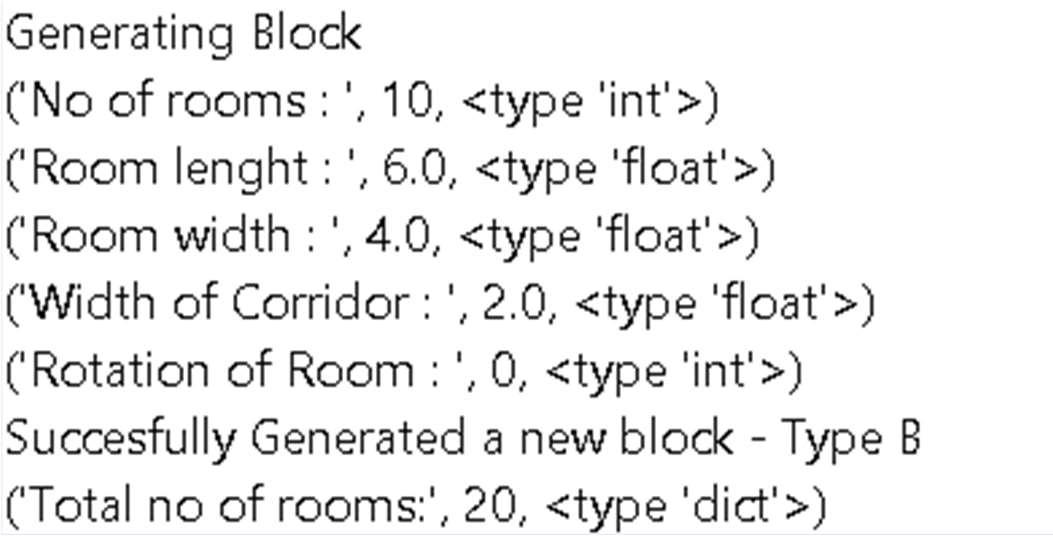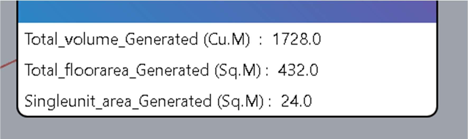 self.area_singleunit_textbox.Text = str("Singleunit_area_Generated (Sq.M) : ") + str(unit_area[0]) self.area_generated_textbox.Text = str("Total_floorarea_Generated (Sq.M) : ") + str(sum(area_generated_list))