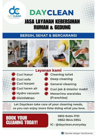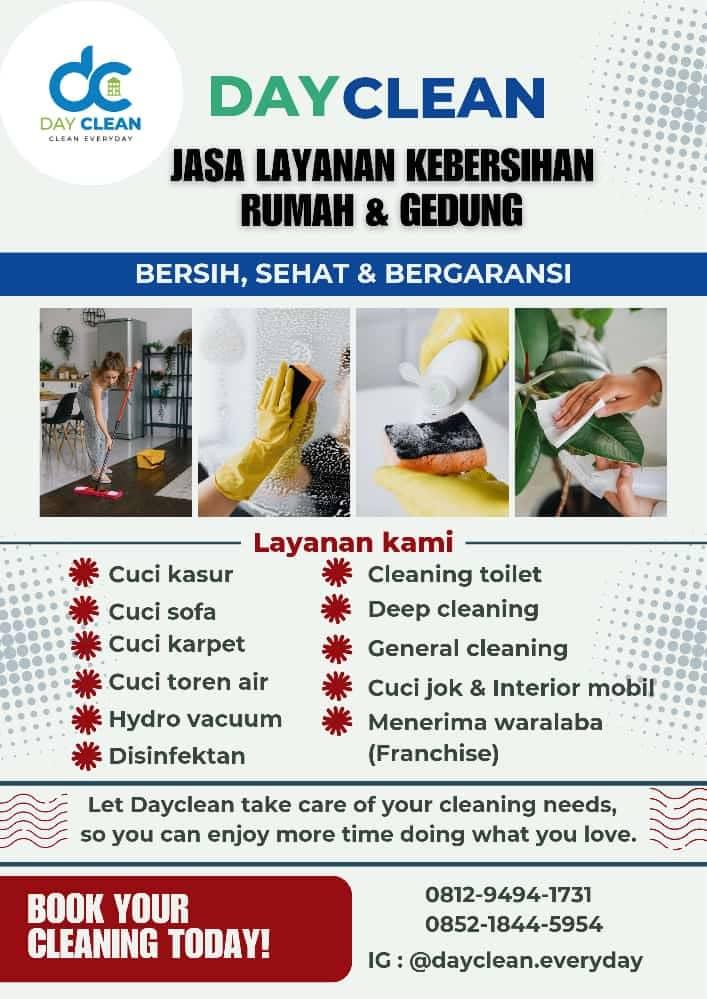 Dayclean adalah layanan jasa kebersihan rumah, apartemen, kantor, gedung, gudang, tempat kost, dll.