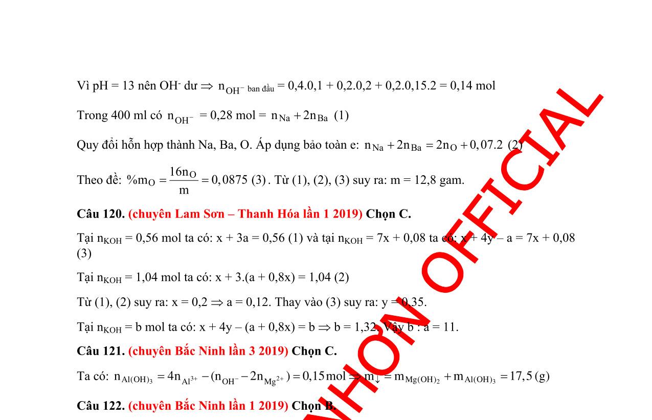 Giá trị của m là A. 36,90. B. 28,50. C. 40,65. D. 44,40. Câu 11(THPT Thái Phiên Lần 1): Hòa tan hoàn toàn m gam hỗn hợp X gồm Na, K, Na2O, Ba và BaO (trong đó oxi chiếm 20% về khối lượng) vào nước, thu được 300 ml dung dịch Y và 0,448 lít (ở đktc) khí H2. Trộn 200 ml dung dịch Y với 200 ml dung dịch gồm HCl 0,2M và H2SO4 0,3M, thu được 400 ml dung dịch có pH = 13. Giá trị của m là (coi H2SO4 phân ly hoàn toàn).