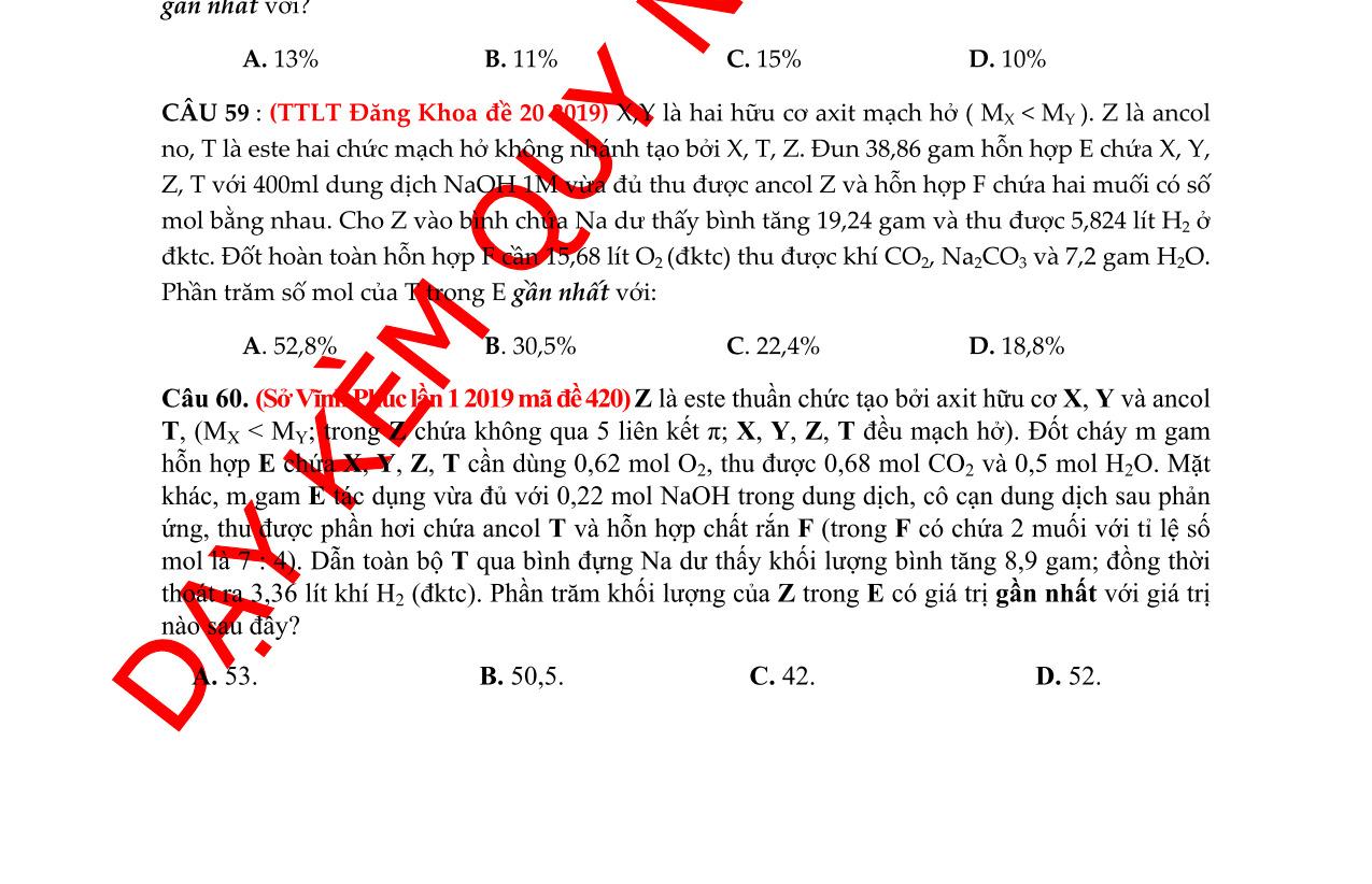 Câu 58: (Yên Lạc 2 – Vĩnh Phúc lần 3 2019) Đốt cháy hoàn toàn 7,576 gam hỗn hợp các este thuần chức bằng O2 dư, sau khi kết thúc phản ứng thấy thu được CO2 và 0,25 mol H2O. Đem toàn bộ sản phẩm cháy hấp thụ hết vào dung dịch nước vôi trong dư thấy có m gam kết tủa xuất hiện. Mặt khác, khi cho 7,576 gam hỗn hợp este này tham gia phản ứng với NaOH thì thấy có 0,1 mol NaOH phản ứng. Giá trị của m là A. 3,23 gam. B. 33,2 gam. C. 23,3 gam. D. 32,3 gam. Câu 59: (Phú Bình – Thái Nguyên lần 1 2019) Cho các chất hữu cơ: X, Y là hai ancol có cùng số nguyên tử cacbon trong phân tử, Z là axit no, mạch hở (MZ > 90) và este T (phân tử chỉ chứa chức este) tạo bởi X, Y với một phân tử Z Đốt cháy hoàn toàn 0,325 mol hỗn hợp E gồm X, Y, Z và T thu được 20,16 lít CO2 (đktc) và 17,55 gam H2O. Phần trăm số mol của T trong E gần nhất với giá trị nào sau đây?