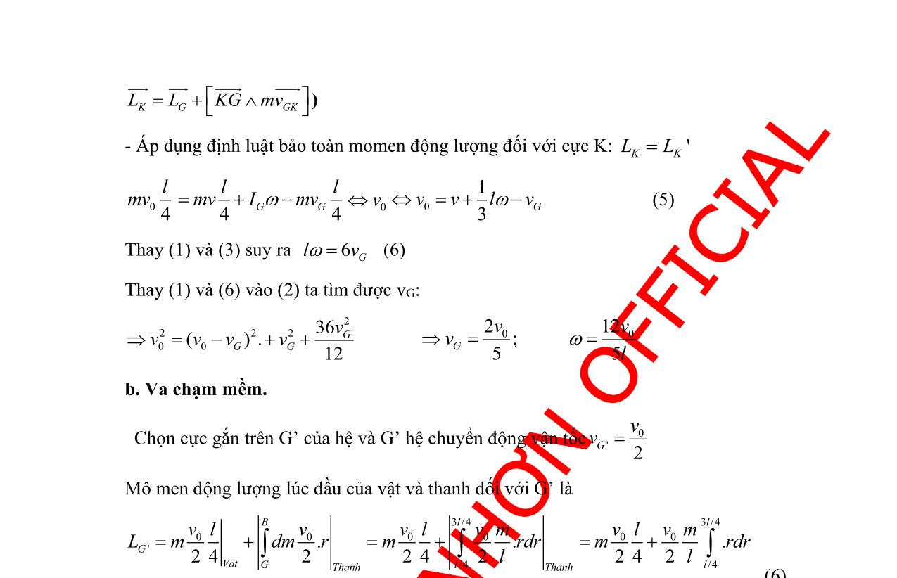 /4. + Vận tốc góc của hệ tại thời điểm m 1 ở vị trí x: 2 0 222222 (0)2 2(2)2(2)2 LLl mlxlxmlxlxlxlx === ++++++ ; => gia tốc góc là: 2 0 222 2(2) .' (2) dLxL x dtLxLx + ==− ++ Áp dụng định luật bảo toàn cơ năng: Cơ năng ở O bằng ở A: E0 = EA 2222 2222 0000 .9 2 222.32 mvmlml EIml =+=+= . Vận tốc của các quả cầu tại vị trí bất kỳ là: ( )2 2222 111 ('). nt vvvxx =+=+ , ( )2 2222 222 (')(). nt vvvxxl =+=++ (Chú ý là do dây không giãn nên v1n = v2n = x’) 2 2'222'222 (3)11(9)(4) 2.322 AAA mL Emxlmxl =++++ 2 2'2'2 0 11 222AnA mL mxmx =++ 2 2'2'222 000 11 2 222 AAnA mL EEmxmxml =++= 0 3 2 Ax vl = Gia tốc khi quả cầu m2 tới A là: 2 0 56 64 A =− 2 0 0,2 Xét trong hệ quay chiếu không quán tính gắn với ống OA, chiều dương của Ox hướng ra ngoài. Phương trình chuyển động của quả cầu m2 : " 2mx = T +m(x+L)2 . Phương trình chuyển động của hệ : "''22 12 ()() mxxmxmxl+=++ Vì " Nx = " M x 2 2 mL T = . Khi quả cầu tới A: 2 0 32 AA mL T ==