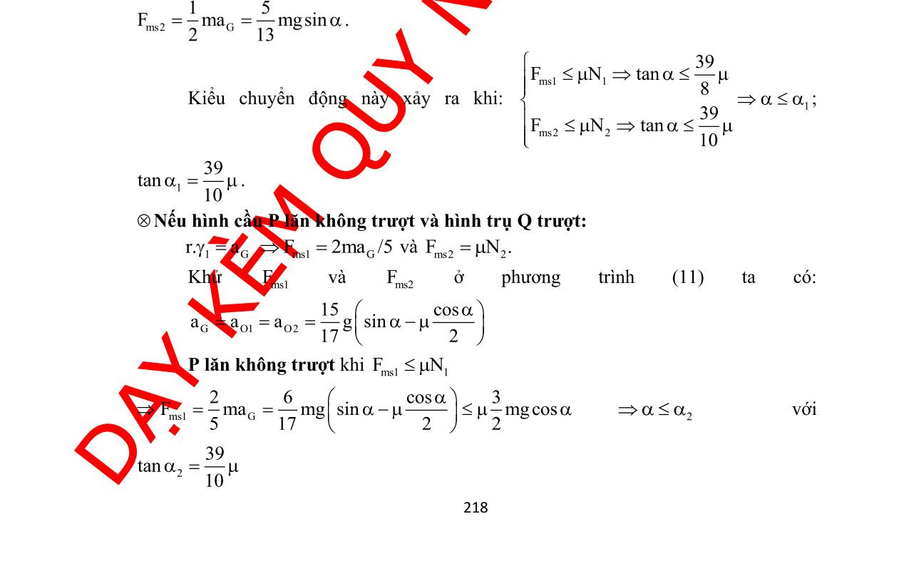 DẠYKÈMQUYNHƠNOFFICIAL 196 Cái nêm cố định nếu ms00 Fk.N 1 kktan0,176== . 2) Giả sử k > k1 và cái nêm đứng yên trên sàn xe. Ở thời điểm ban đầu t = 0, xe tải khởi động với gia tốc không đổi a > a1 a) Định luật II: Gms maFNmgma =++− Gms maFmgsinmacos =−−+ (1) 0Nmgcosmasin =−− (2) Phương trình động lực học của ống đối với G 2 ms I.mRR.F == (3) Khi ống lăn không trượt thì: G aR= (4) Từ (3) và (4) ta có: msGFm.a = , thay vào (1): G 1 a(acosgsin) 2 =− (5) b) Chứng tỏ ống chỉ có thể lăn không trượt nếu 2aa , tìm 2a . Từ (5) ta có: ms 1 Fm(acosgsin) 2 =− (6) Từ (2) ta có: Nm(gcosasin) =+ (7) Chúýrằng: 1 sin aagtang cos == acosgsin0 − ,điềukiện đểống lăn không trượt là: ms 1 |F|m(acosgsin)k|N|km(gcosasin) 2 =−=+