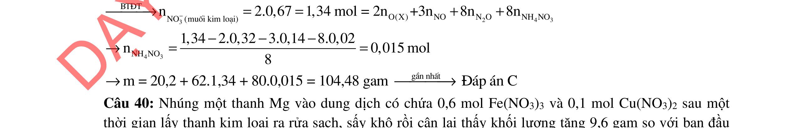 D5.3. Cho m gam X gồm Mg, Fe tác dụng hết với dung dịch HNO3 thu được dung dịch A chỉ chứa các muối và 1,792 lít ĐKTC hỗn hợp X gồm N2, NO, N2O, NO2 trong đó N2 và NO2 có % thể tích bằng nhau có tỉ khối của Z so với heli bằng 8,375 (không còn sản phẩm khử nào khác). Điện phân dung dịch A đến khi catot bắt đầu có kim loại bám thì dùng điện phân, thể tích khí thu được ở anot 0,224 lít đktc. Nếu cho m gam X vào dung dịch E chứa FeCl3 0,8M và CuCl2 0,6M thì thu được dung dịch Y và 7,52 gam rắn gồm 2 kim loại. Cho dung dịch AgNO3 dư vào Y thu được 29,07 gam kết tủa. a/ Tính m? b/ Nhúng thanh Mg vào dung dịch E, sau một thời gian lấy thanh Mg ra cân lại thì thấy khối lượng tăng thêm 1,2 gam. Tính khối lượng Mg đã phản ứng? …………HẾT…………