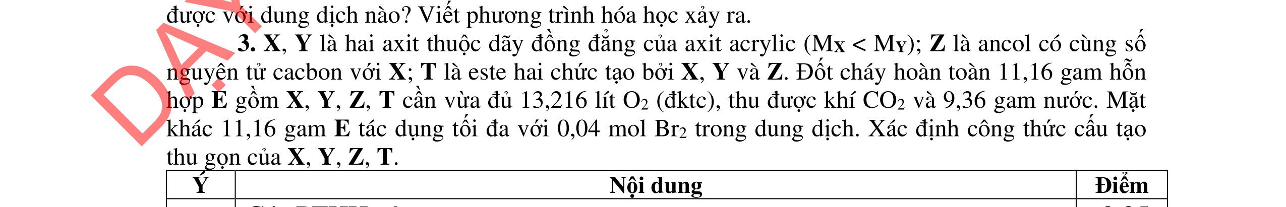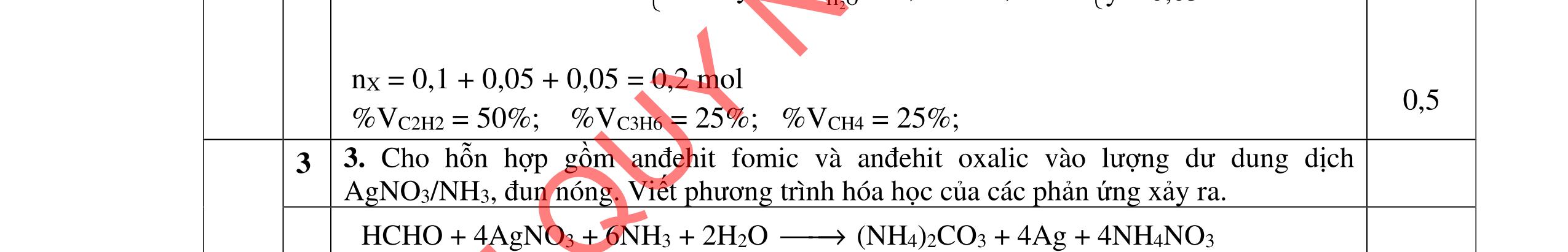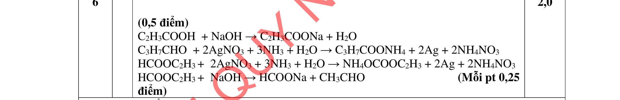 Vì X chỉ chứa một loại nhóm chức, khi đun nóng X với dung dịch HCl thu được 2 chất hữu cơ Y và Z (MY < MZ) đều có phản ứng tráng gương nên công thức cấu tạo của X, Y, Z là: (X): (HCOO)2CH-CH3; (Y): CH3CHO; (Z): HCOOH 0,25 PTHH: (HCOO)2CH-CH3 + H2O ⇄ 2HCOOH + CH3CHO 0,25 CH3CHO + 2AgNO3 + 3NH3 + H2O CH3COONH4 + 2Ag + 2NH4NO3 0,25 HCOOH + 2AgNO3 + 4NH3 + H2O (NH4)2CO3 + 2Ag + 2NH4NO3 0,25 3.3 2,0đ