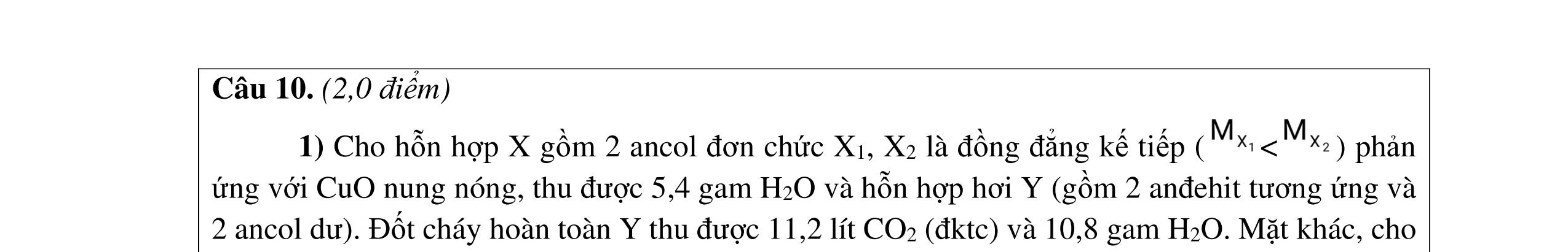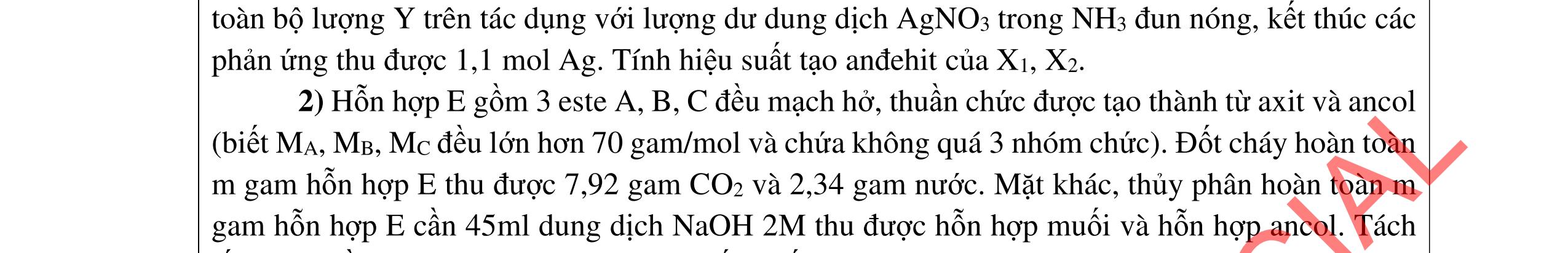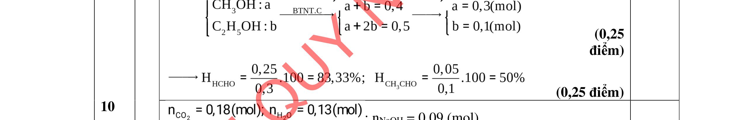 Vì X chỉ chứa một loại nhóm chức, khi đun nóng X với dung dịch HCl thu được 2 chất hữu cơ Y và Z (MY < MZ) đều có phản ứng tráng gương nên công thức cấu tạo của X, Y, Z là: (X): (HCOO)2CH-CH3; (Y): CH3CHO; (Z): HCOOH 0,25 PTHH: (HCOO)2CH-CH3 + H2O ⇄ 2HCOOH + CH3CHO 0,25 CH3CHO + 2AgNO3 + 3NH3 + H2O CH3COONH4 + 2Ag + 2NH4NO3 0,25 HCOOH + 2AgNO3 + 4NH3 + H2O (NH4)2CO3 + 2Ag + 2NH4NO3 0,25 3.3 2,0đ