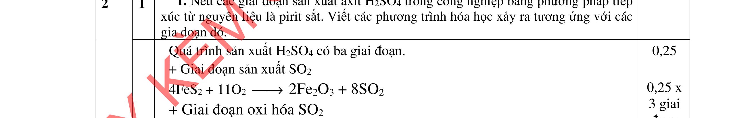a. Phản ứng được dùng để khắc chữ trên thủy tinh. b. Phản ứng dùng dung dịch KI chứng minh O3 hoạt động hơn O2. 3. Từ tinh bột (các chất vô cơ và điều kiện cần thiết có đủ), viết các phương trình Câu 1 HDC Điểm 1 a. 4Cl2 + H2S + 4H2O → 8HCl + H2SO4 4 x Cl2 0 + 2e → 2Cl1 x S-2 → S+6 + 8e 0,5 b. (5x-2y)