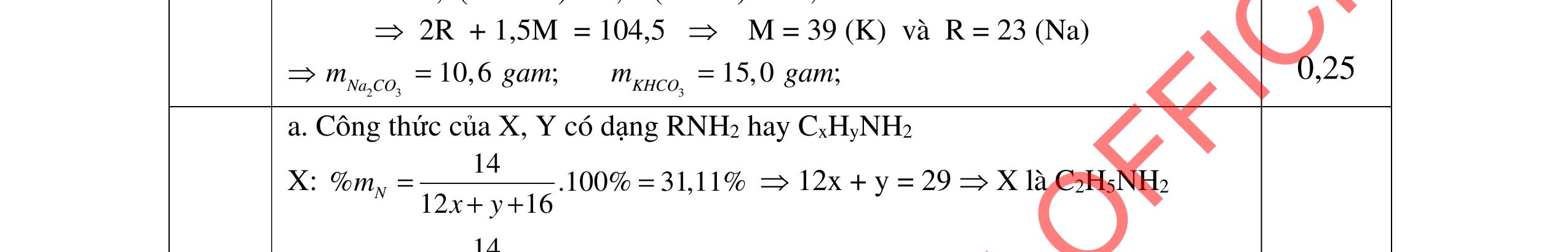 Fe + (18x-6y) HNO3 → (5x-2y) Fe(NO3)3 + 3NxOy + (9x-3y)H2O 2 5 03 3xN +(5-2)e N (5-2)xFe Fe + 3e y x xxyx xy + + + → → 0,5 2 a. SiO2 + 4HF → SiF4 + 2H2O 0,5 b. 2KI + H2O + O3 → 2KOH + O2↑ + I2↓ 0,5 3 (C6H10O5)n + nH2O oH,t + → nC6H12O6 C6H12O6 menruou → 2C2H5OH + 2CO2 C2H5OH 24(dac) 170o HSO C → CH2=CH2 + H2O 1,0 C2H5OH + O2 mengiam → CH3COOH + H2O CH3COOH + C2H5OH 24(d) ac o HSO t → ← CH3COOC2H5 + H2O 1,0 Câu 2 (4,0 điểm) 1. Nêu hiện tượng và viết phương trình hóa học trong các thí nghiệm sau: a. Cho dung dịch BaCl2 vào dung dịch KHSO4. b. Cho dung dịch Fe(NO3)2 vào dung dịch HCl loãng. ĐỀ THI CHÍNH THỨC DẠYKÈMQUYNHƠNOFFICIAL