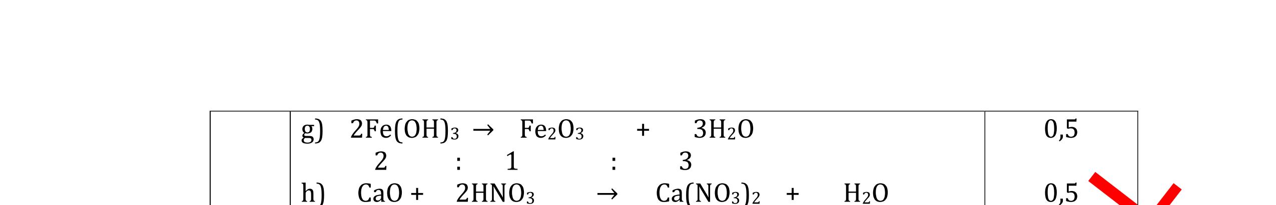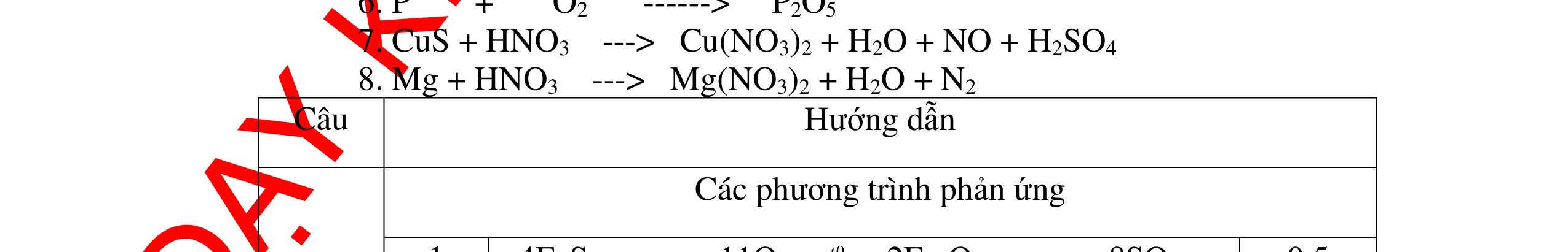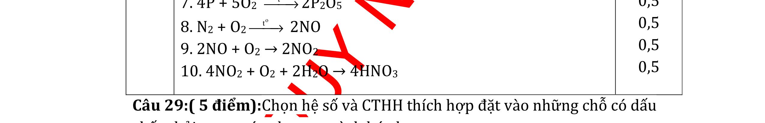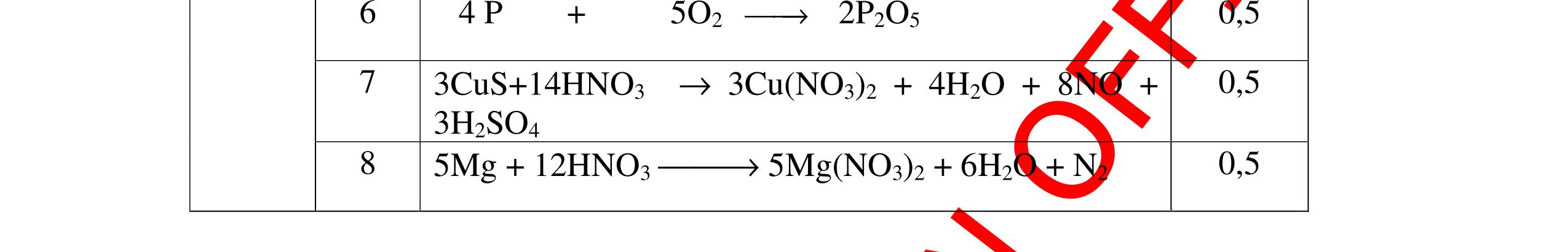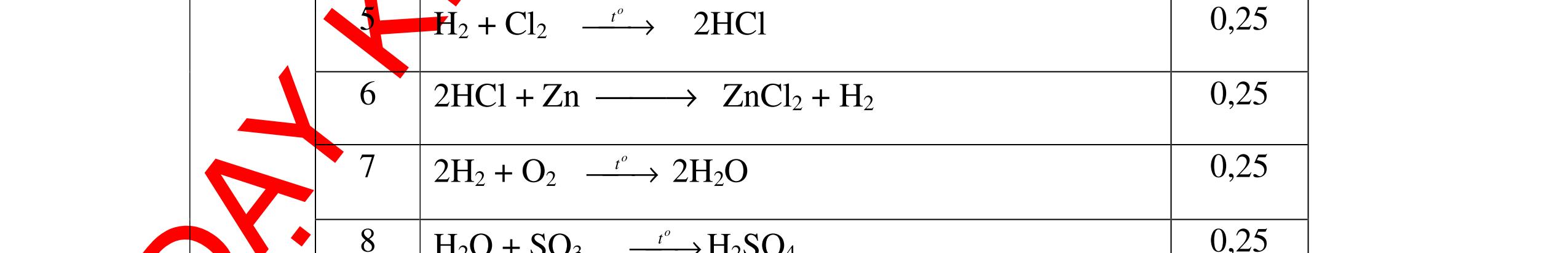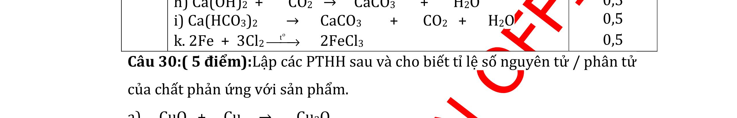 DẠYKÈMQUYNHƠNOFFICIAL Câu Hướng dẫn chấm Điểm 26 a. 4FeS2 + 11O2 0t → 8SO2 + 2Fe2O3 b. 2AgNO3 + CuCl2 → 2AgCl + Cu(NO3)2 c. 2Na + 2H2O → 2NaOH + H2 d. 2Fe3O4 + 8H2 0t → 6Fe + 8H2O e. 2Fe + 3Cl2 0t → 2FeCl3 f. 3Ca + 2H3PO4 → Ca3(PO4)2 + 3H2 g.CaCO3 + HCl → CaCl2 +H2O+CO2↑ h.Mg + HNO3 → Mg(NO3)2 +NO +H2O i.2KMnO4 0t → K2MnO4 +O2 +MnO2 k.2NaOH + CuCl2 → Cu(OH)2 +2NaCl 0,5 0,5 0,5 0,5 0,5 0,5 0,5 0,5 0,5 0,5 Câu27.(5điểm): 1. Phảnứngcủacâyxanhquanghợptạoratinhbộtvàkhíoxiđượcthểhiện bằngsơđồ: CO2 + H2O → ChÊt diÖp lôc ¸nh s¸ng (C6H10O5)n + O2 (khícacbonic) (nước) (tinhbột) (khíoxi) a)Hãylậpphươngtrìnhhoáhọcchosơđồphảnứngtrên. b)Chobiếttỉlệgiữasốphântửkhícacbonic(CO2)vàsốphântửnước. 2. Lậpphươngtrình hoáhọccủaphảnứngtheosơđồsau: a) CaCO3 + HCl → CaCl2 +H2O+CO2↑ b)Mg + HNO3 → Mg(NO3)2 +NO +H2O c)KMnO4 ot → K2MnO4 +O2 +MnO2 Câu Hướng dẫn chấm Điểm 27 1. 6nCO2 + 5nH2O ChÊtdiÖplôc/¸nhs¸ng → (C6H10O5)n +6nO2 Tinh bột -TỉlệsốphântửkhíCO2 vàphântửhơinướclà: 22 COHO n:n6:5 = . 1,0 1,0 2.LậpPTHHđúngcủamỗitrườnghợpcho a) CaCO3 + 2HCl → CaCl2 +H2O+CO2↑ b) 3Mg + 8HNO3 → 3Mg(NO3)2 +2NO +4H2O c) 2KMnO4 ot → K2MnO4 +O2 +MnO2 d) 2NaOH + CuCl2 → Cu(OH)2 +2NaCl 0,75 0,75 0,75 0,75