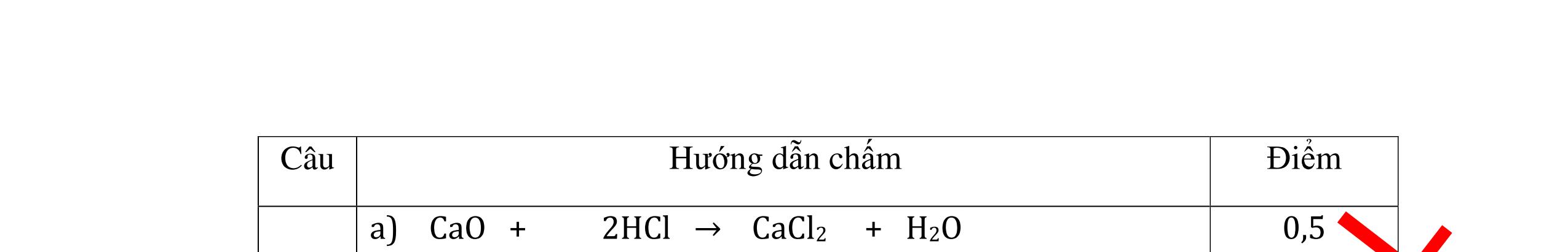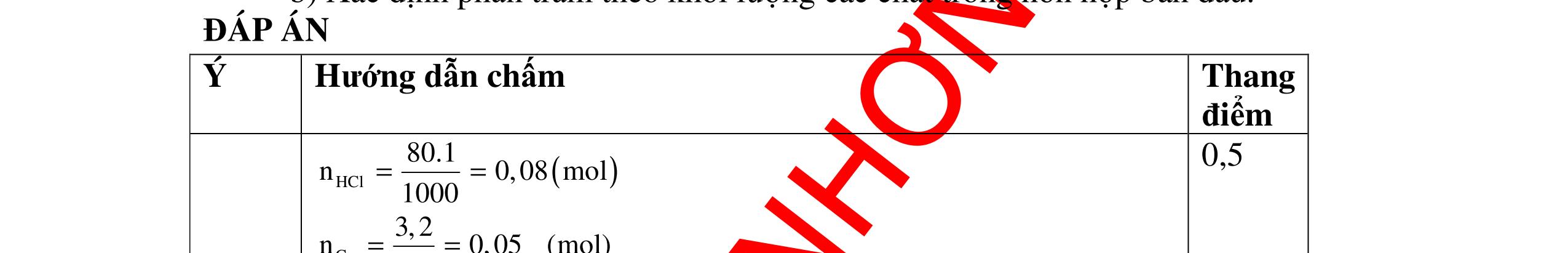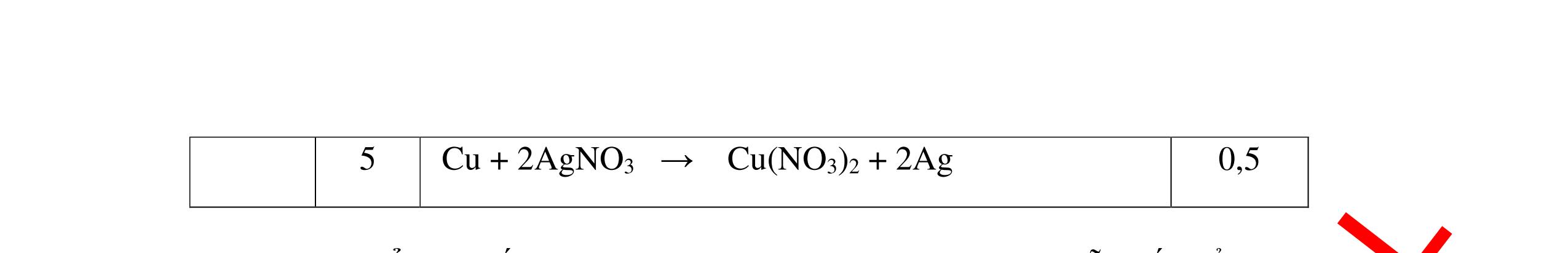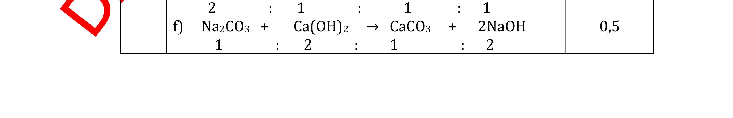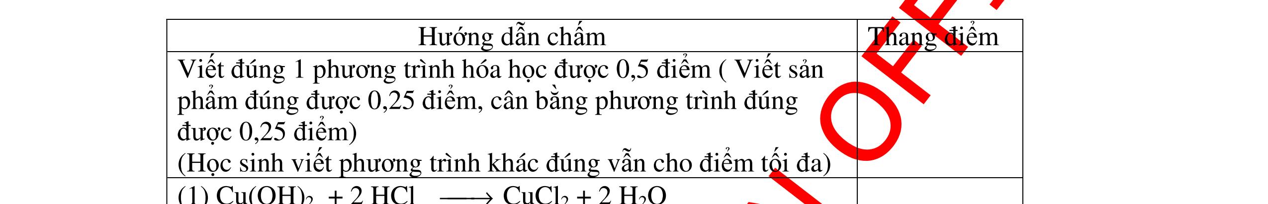 DẠYKÈMQUYNHƠNOFFICIAL Câu Hướng dẫn chấm Điểm 26 a. 4FeS2 + 11O2 0t → 8SO2 + 2Fe2O3 b. 2AgNO3 + CuCl2 → 2AgCl + Cu(NO3)2 c. 2Na + 2H2O → 2NaOH + H2 d. 2Fe3O4 + 8H2 0t → 6Fe + 8H2O e. 2Fe + 3Cl2 0t → 2FeCl3 f. 3Ca + 2H3PO4 → Ca3(PO4)2 + 3H2 g.CaCO3 + HCl → CaCl2 +H2O+CO2↑ h.Mg + HNO3 → Mg(NO3)2 +NO +H2O i.2KMnO4 0t → K2MnO4 +O2 +MnO2 k.2NaOH + CuCl2 → Cu(OH)2 +2NaCl 0,5 0,5 0,5 0,5 0,5 0,5 0,5 0,5 0,5 0,5 Câu27.(5điểm): 1. Phảnứngcủacâyxanhquanghợptạoratinhbộtvàkhíoxiđượcthểhiện bằngsơđồ: CO2 + H2O → ChÊt diÖp lôc ¸nh s¸ng (C6H10O5)n + O2 (khícacbonic) (nước) (tinhbột) (khíoxi) a)Hãylậpphươngtrìnhhoáhọcchosơđồphảnứngtrên. b)Chobiếttỉlệgiữasốphântửkhícacbonic(CO2)vàsốphântửnước. 2. Lậpphươngtrình hoáhọccủaphảnứngtheosơđồsau: a) CaCO3 + HCl → CaCl2 +H2O+CO2↑ b)Mg + HNO3 → Mg(NO3)2 +NO +H2O c)KMnO4 ot → K2MnO4 +O2 +MnO2 Câu Hướng dẫn chấm Điểm 27 1. 6nCO2 + 5nH2O ChÊtdiÖplôc/¸nhs¸ng → (C6H10O5)n +6nO2 Tinh bột -TỉlệsốphântửkhíCO2 vàphântửhơinướclà: 22 COHO n:n6:5 = . 1,0 1,0 2.LậpPTHHđúngcủamỗitrườnghợpcho a) CaCO3 + 2HCl → CaCl2 +H2O+CO2↑ b) 3Mg + 8HNO3 → 3Mg(NO3)2 +2NO +4H2O c) 2KMnO4 ot → K2MnO4 +O2 +MnO2 d) 2NaOH + CuCl2 → Cu(OH)2 +2NaCl 0,75 0,75 0,75 0,75