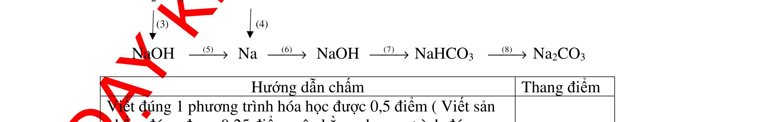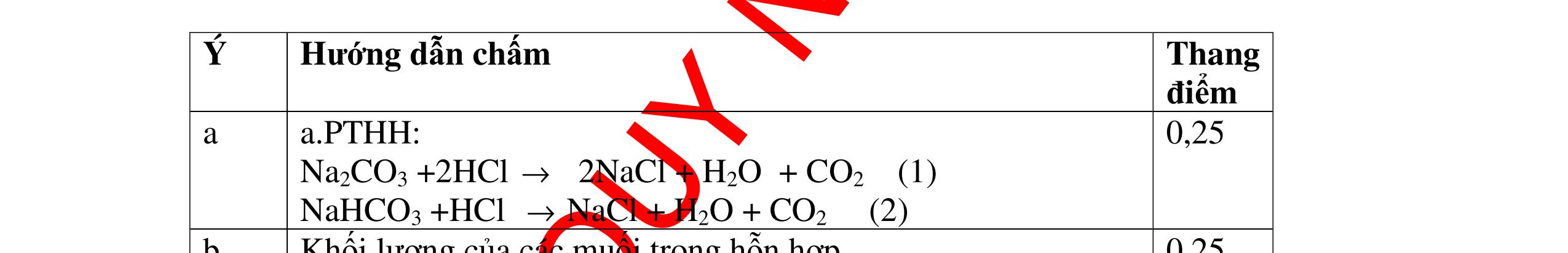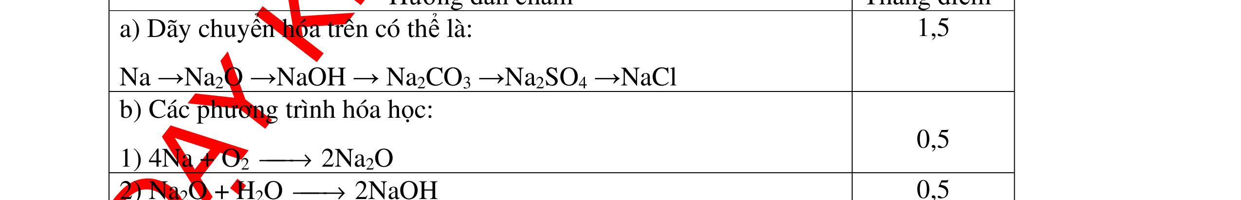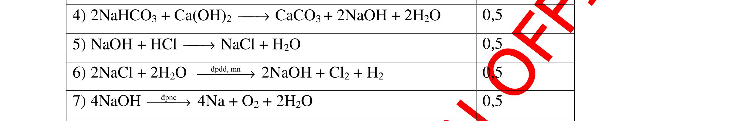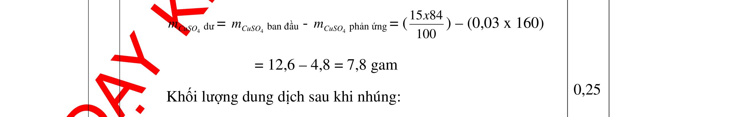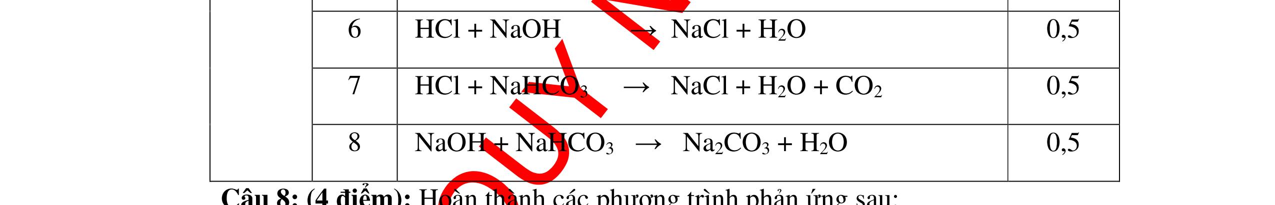 DẠYKÈMQUYNHƠNOFFICIAL Câu Hướng dẫn chấm Điểm 26 a. 4FeS2 + 11O2 0t → 8SO2 + 2Fe2O3 b. 2AgNO3 + CuCl2 → 2AgCl + Cu(NO3)2 c. 2Na + 2H2O → 2NaOH + H2 d. 2Fe3O4 + 8H2 0t → 6Fe + 8H2O e. 2Fe + 3Cl2 0t → 2FeCl3 f. 3Ca + 2H3PO4 → Ca3(PO4)2 + 3H2 g.CaCO3 + HCl → CaCl2 +H2O+CO2↑ h.Mg + HNO3 → Mg(NO3)2 +NO +H2O i.2KMnO4 0t → K2MnO4 +O2 +MnO2 k.2NaOH + CuCl2 → Cu(OH)2 +2NaCl 0,5 0,5 0,5 0,5 0,5 0,5 0,5 0,5 0,5 0,5 Câu27.(5điểm): 1. Phảnứngcủacâyxanhquanghợptạoratinhbộtvàkhíoxiđượcthểhiện bằngsơđồ: CO2 + H2O → ChÊt diÖp lôc ¸nh s¸ng (C6H10O5)n + O2 (khícacbonic) (nước) (tinhbột) (khíoxi) a)Hãylậpphươngtrìnhhoáhọcchosơđồphảnứngtrên. b)Chobiếttỉlệgiữasốphântửkhícacbonic(CO2)vàsốphântửnước. 2. Lậpphươngtrình hoáhọccủaphảnứngtheosơđồsau: a) CaCO3 + HCl → CaCl2 +H2O+CO2↑ b)Mg + HNO3 → Mg(NO3)2 +NO +H2O c)KMnO4 ot → K2MnO4 +O2 +MnO2 Câu Hướng dẫn chấm Điểm 27 1. 6nCO2 + 5nH2O ChÊtdiÖplôc/¸nhs¸ng → (C6H10O5)n +6nO2 Tinh bột -TỉlệsốphântửkhíCO2 vàphântửhơinướclà: 22 COHO n:n6:5 = . 1,0 1,0 2.LậpPTHHđúngcủamỗitrườnghợpcho a) CaCO3 + 2HCl → CaCl2 +H2O+CO2↑ b) 3Mg + 8HNO3 → 3Mg(NO3)2 +2NO +4H2O c) 2KMnO4 ot → K2MnO4 +O2 +MnO2 d) 2NaOH + CuCl2 → Cu(OH)2 +2NaCl 0,75 0,75 0,75 0,75