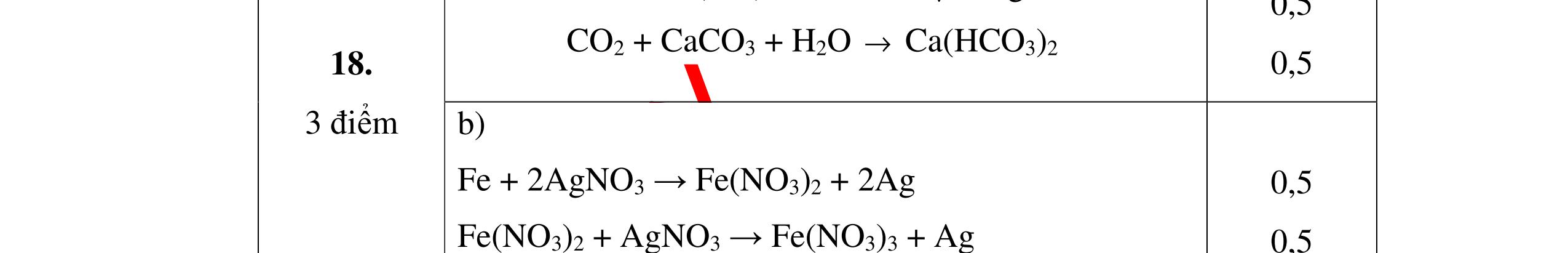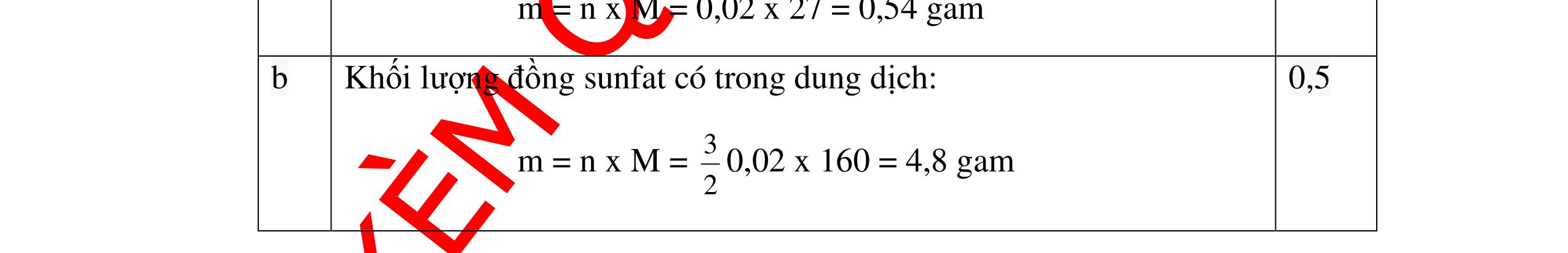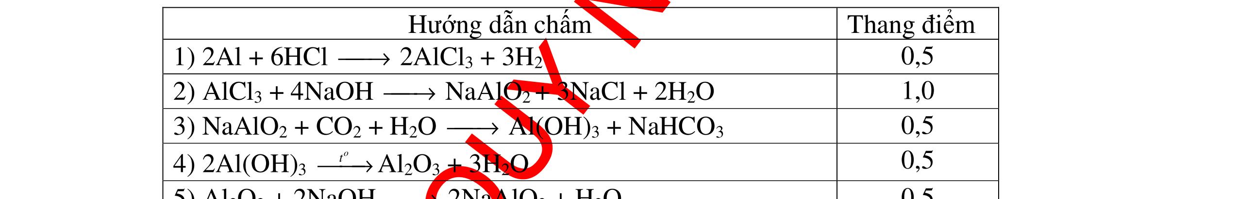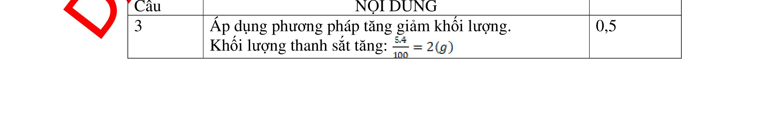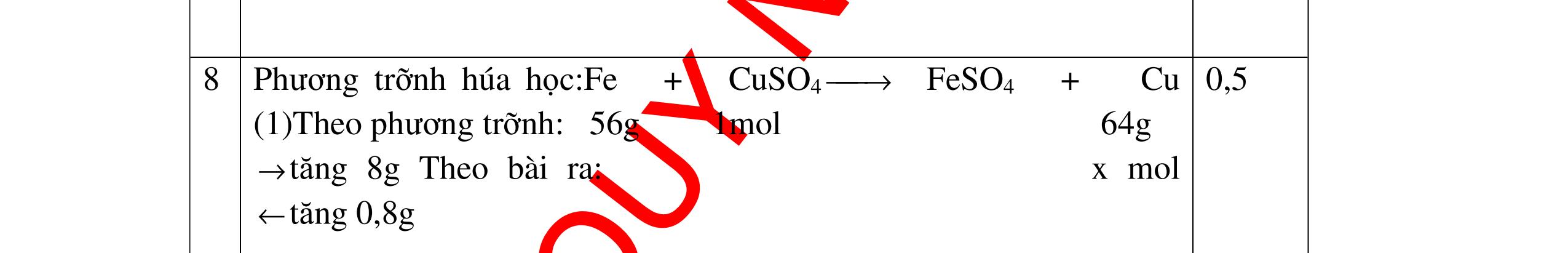 DẠYKÈMQUYNHƠNOFFICIAL Câu Hướng dẫn chấm Điểm 26 a. 4FeS2 + 11O2 0t → 8SO2 + 2Fe2O3 b. 2AgNO3 + CuCl2 → 2AgCl + Cu(NO3)2 c. 2Na + 2H2O → 2NaOH + H2 d. 2Fe3O4 + 8H2 0t → 6Fe + 8H2O e. 2Fe + 3Cl2 0t → 2FeCl3 f. 3Ca + 2H3PO4 → Ca3(PO4)2 + 3H2 g.CaCO3 + HCl → CaCl2 +H2O+CO2↑ h.Mg + HNO3 → Mg(NO3)2 +NO +H2O i.2KMnO4 0t → K2MnO4 +O2 +MnO2 k.2NaOH + CuCl2 → Cu(OH)2 +2NaCl 0,5 0,5 0,5 0,5 0,5 0,5 0,5 0,5 0,5 0,5 Câu27.(5điểm): 1. Phảnứngcủacâyxanhquanghợptạoratinhbộtvàkhíoxiđượcthểhiện bằngsơđồ: CO2 + H2O → ChÊt diÖp lôc ¸nh s¸ng (C6H10O5)n + O2 (khícacbonic) (nước) (tinhbột) (khíoxi) a)Hãylậpphươngtrìnhhoáhọcchosơđồphảnứngtrên. b)Chobiếttỉlệgiữasốphântửkhícacbonic(CO2)vàsốphântửnước. 2. Lậpphươngtrình hoáhọccủaphảnứngtheosơđồsau: a) CaCO3 + HCl → CaCl2 +H2O+CO2↑ b)Mg + HNO3 → Mg(NO3)2 +NO +H2O c)KMnO4 ot → K2MnO4 +O2 +MnO2 Câu Hướng dẫn chấm Điểm 27 1. 6nCO2 + 5nH2O ChÊtdiÖplôc/¸nhs¸ng → (C6H10O5)n +6nO2 Tinh bột -TỉlệsốphântửkhíCO2 vàphântửhơinướclà: 22 COHO n:n6:5 = . 1,0 1,0 2.LậpPTHHđúngcủamỗitrườnghợpcho a) CaCO3 + 2HCl → CaCl2 +H2O+CO2↑ b) 3Mg + 8HNO3 → 3Mg(NO3)2 +2NO +4H2O c) 2KMnO4 ot → K2MnO4 +O2 +MnO2 d) 2NaOH + CuCl2 → Cu(OH)2 +2NaCl 0,75 0,75 0,75 0,75