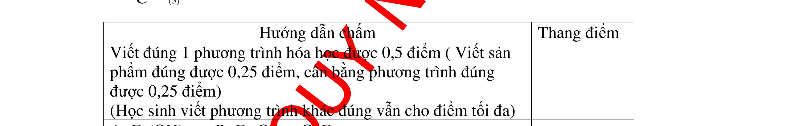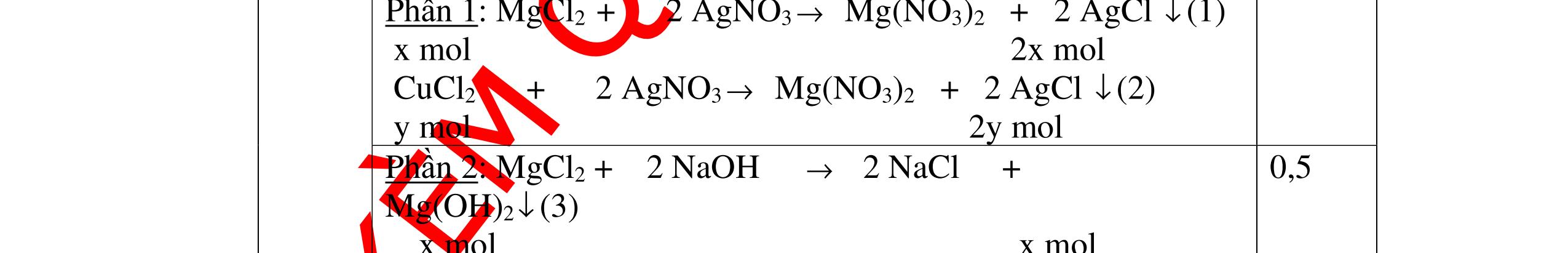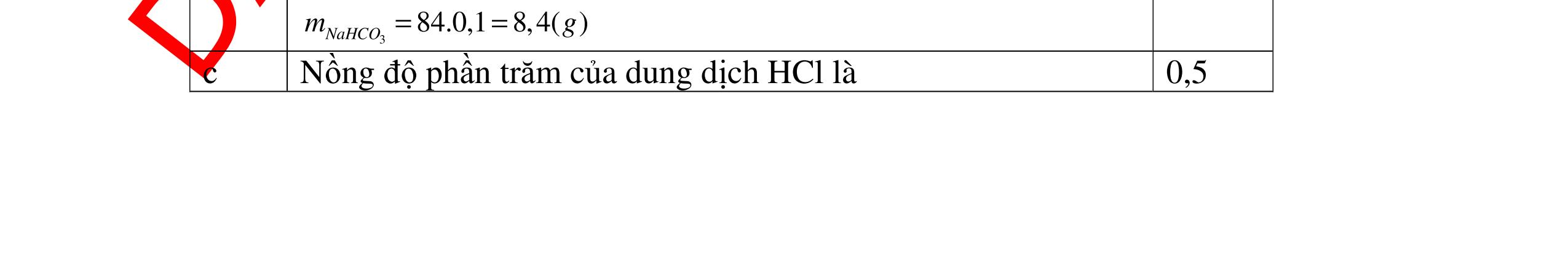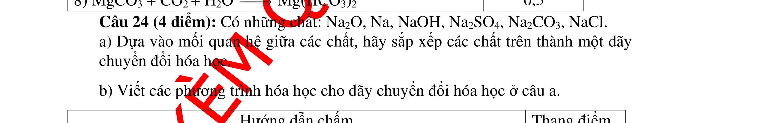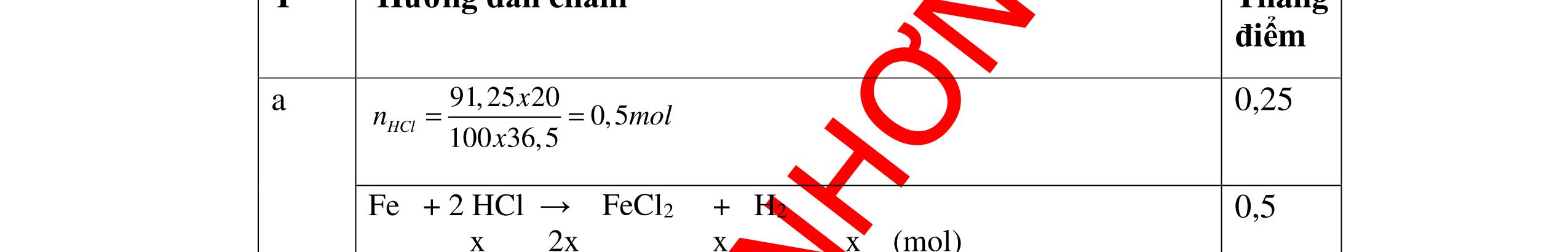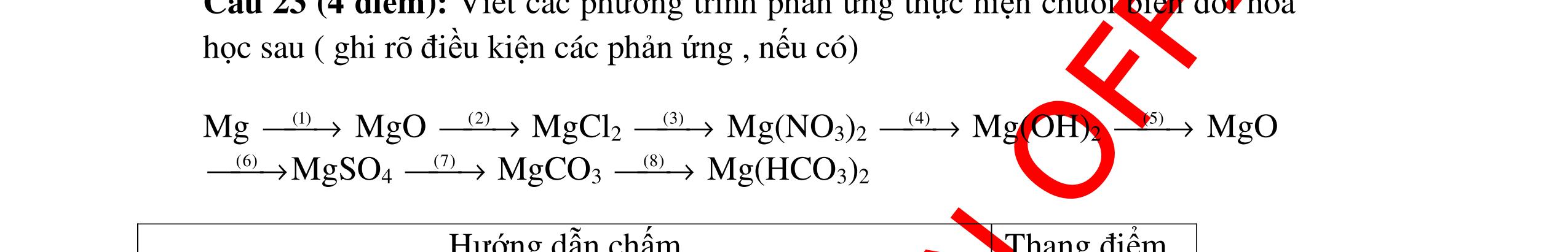 DẠYKÈMQUYNHƠNOFFICIAL Câu Hướng dẫn chấm Điểm 26 a. 4FeS2 + 11O2 0t → 8SO2 + 2Fe2O3 b. 2AgNO3 + CuCl2 → 2AgCl + Cu(NO3)2 c. 2Na + 2H2O → 2NaOH + H2 d. 2Fe3O4 + 8H2 0t → 6Fe + 8H2O e. 2Fe + 3Cl2 0t → 2FeCl3 f. 3Ca + 2H3PO4 → Ca3(PO4)2 + 3H2 g.CaCO3 + HCl → CaCl2 +H2O+CO2↑ h.Mg + HNO3 → Mg(NO3)2 +NO +H2O i.2KMnO4 0t → K2MnO4 +O2 +MnO2 k.2NaOH + CuCl2 → Cu(OH)2 +2NaCl 0,5 0,5 0,5 0,5 0,5 0,5 0,5 0,5 0,5 0,5 Câu27.(5điểm): 1. Phảnứngcủacâyxanhquanghợptạoratinhbộtvàkhíoxiđượcthểhiện bằngsơđồ: CO2 + H2O → ChÊt diÖp lôc ¸nh s¸ng (C6H10O5)n + O2 (khícacbonic) (nước) (tinhbột) (khíoxi) a)Hãylậpphươngtrìnhhoáhọcchosơđồphảnứngtrên. b)Chobiếttỉlệgiữasốphântửkhícacbonic(CO2)vàsốphântửnước. 2. Lậpphươngtrình hoáhọccủaphảnứngtheosơđồsau: a) CaCO3 + HCl → CaCl2 +H2O+CO2↑ b)Mg + HNO3 → Mg(NO3)2 +NO +H2O c)KMnO4 ot → K2MnO4 +O2 +MnO2 Câu Hướng dẫn chấm Điểm 27 1. 6nCO2 + 5nH2O ChÊtdiÖplôc/¸nhs¸ng → (C6H10O5)n +6nO2 Tinh bột -TỉlệsốphântửkhíCO2 vàphântửhơinướclà: 22 COHO n:n6:5 = . 1,0 1,0 2.LậpPTHHđúngcủamỗitrườnghợpcho a) CaCO3 + 2HCl → CaCl2 +H2O+CO2↑ b) 3Mg + 8HNO3 → 3Mg(NO3)2 +2NO +4H2O c) 2KMnO4 ot → K2MnO4 +O2 +MnO2 d) 2NaOH + CuCl2 → Cu(OH)2 +2NaCl 0,75 0,75 0,75 0,75