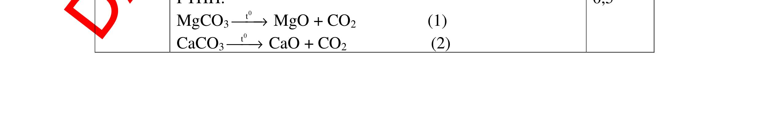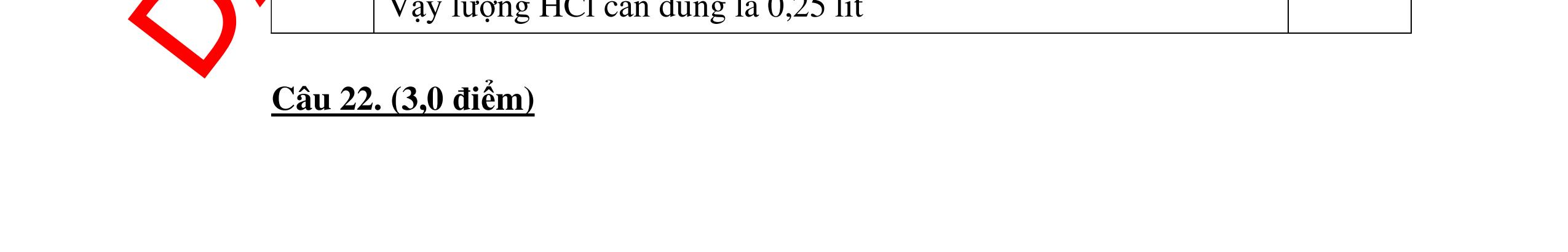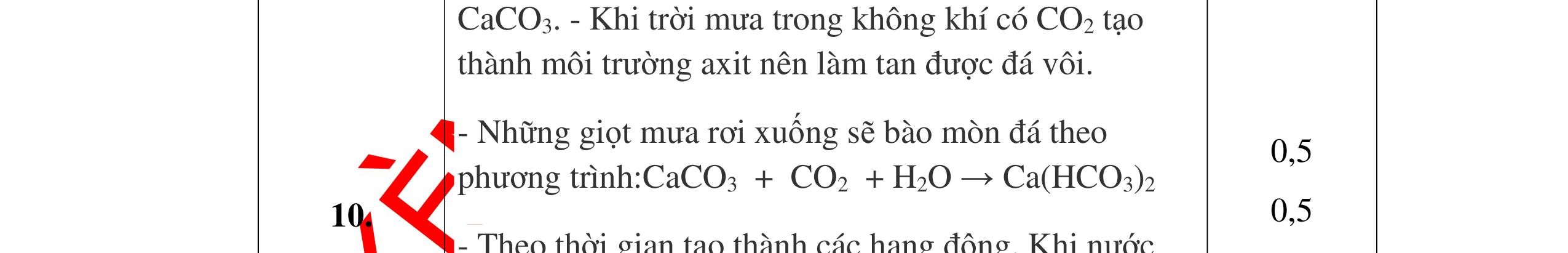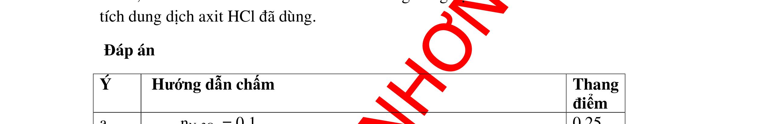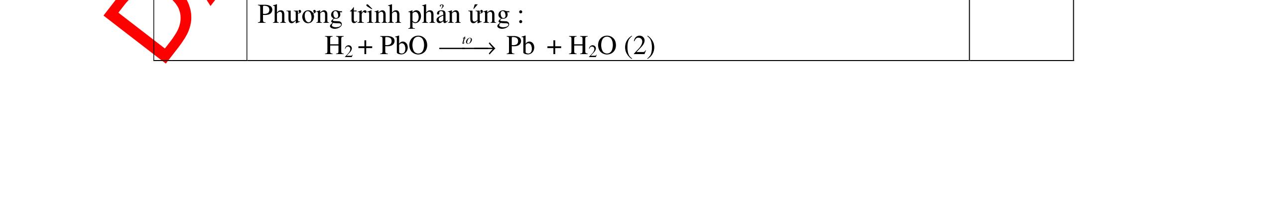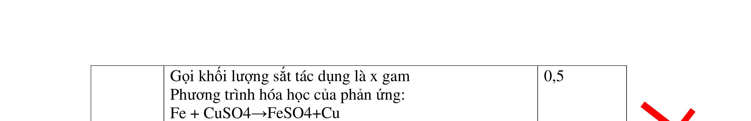 DẠYKÈMQUYNHƠNOFFICIAL Câu Hướng dẫn chấm Điểm 26 a. 4FeS2 + 11O2 0t → 8SO2 + 2Fe2O3 b. 2AgNO3 + CuCl2 → 2AgCl + Cu(NO3)2 c. 2Na + 2H2O → 2NaOH + H2 d. 2Fe3O4 + 8H2 0t → 6Fe + 8H2O e. 2Fe + 3Cl2 0t → 2FeCl3 f. 3Ca + 2H3PO4 → Ca3(PO4)2 + 3H2 g.CaCO3 + HCl → CaCl2 +H2O+CO2↑ h.Mg + HNO3 → Mg(NO3)2 +NO +H2O i.2KMnO4 0t → K2MnO4 +O2 +MnO2 k.2NaOH + CuCl2 → Cu(OH)2 +2NaCl 0,5 0,5 0,5 0,5 0,5 0,5 0,5 0,5 0,5 0,5 Câu27.(5điểm): 1. Phảnứngcủacâyxanhquanghợptạoratinhbộtvàkhíoxiđượcthểhiện bằngsơđồ: CO2 + H2O → ChÊt diÖp lôc ¸nh s¸ng (C6H10O5)n + O2 (khícacbonic) (nước) (tinhbột) (khíoxi) a)Hãylậpphươngtrìnhhoáhọcchosơđồphảnứngtrên. b)Chobiếttỉlệgiữasốphântửkhícacbonic(CO2)vàsốphântửnước. 2. Lậpphươngtrình hoáhọccủaphảnứngtheosơđồsau: a) CaCO3 + HCl → CaCl2 +H2O+CO2↑ b)Mg + HNO3 → Mg(NO3)2 +NO +H2O c)KMnO4 ot → K2MnO4 +O2 +MnO2 Câu Hướng dẫn chấm Điểm 27 1. 6nCO2 + 5nH2O ChÊtdiÖplôc/¸nhs¸ng → (C6H10O5)n +6nO2 Tinh bột -TỉlệsốphântửkhíCO2 vàphântửhơinướclà: 22 COHO n:n6:5 = . 1,0 1,0 2.LậpPTHHđúngcủamỗitrườnghợpcho a) CaCO3 + 2HCl → CaCl2 +H2O+CO2↑ b) 3Mg + 8HNO3 → 3Mg(NO3)2 +2NO +4H2O c) 2KMnO4 ot → K2MnO4 +O2 +MnO2 d) 2NaOH + CuCl2 → Cu(OH)2 +2NaCl 0,75 0,75 0,75 0,75