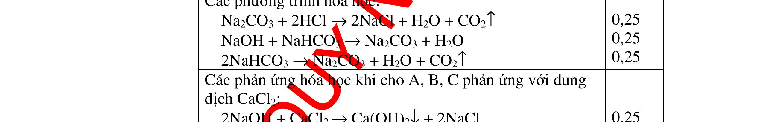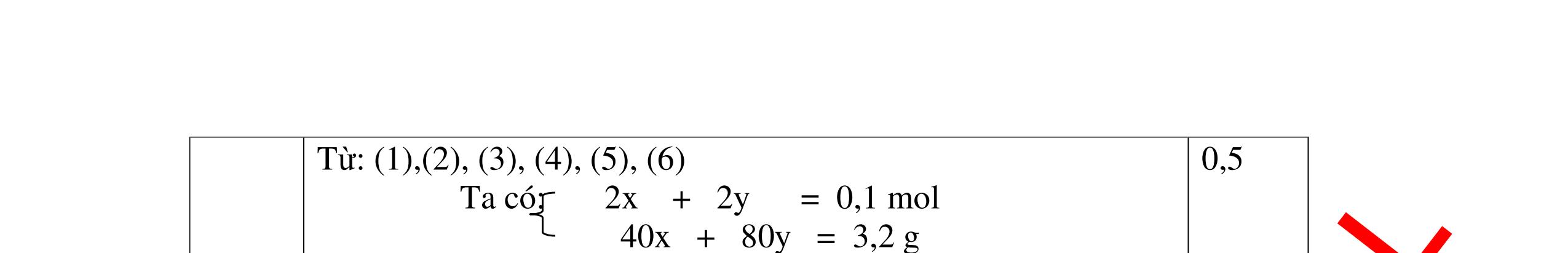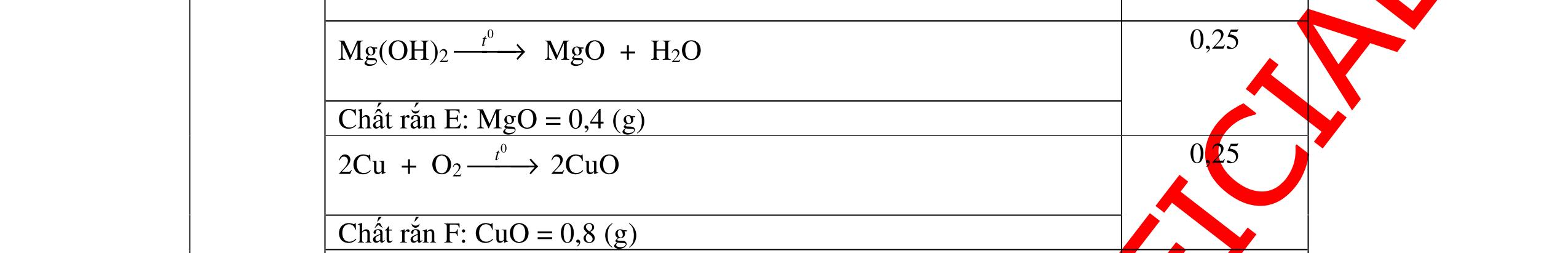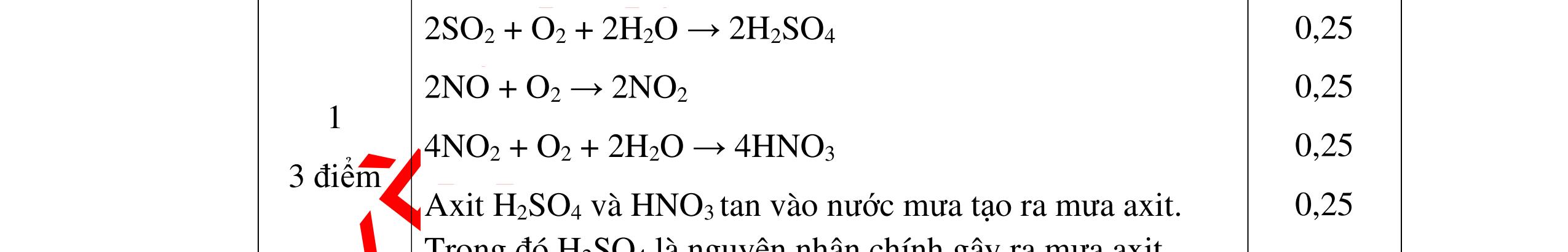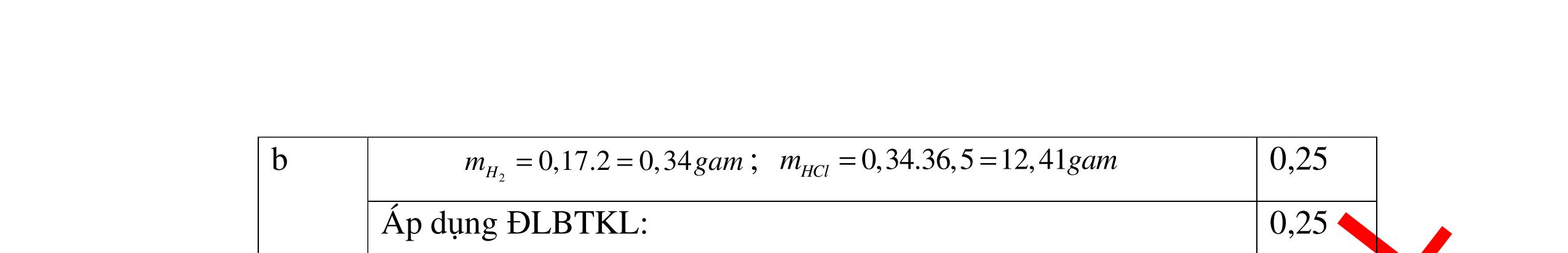 DẠYKÈMQUYNHƠNOFFICIAL Câu Hướng dẫn chấm Điểm 26 a. 4FeS2 + 11O2 0t → 8SO2 + 2Fe2O3 b. 2AgNO3 + CuCl2 → 2AgCl + Cu(NO3)2 c. 2Na + 2H2O → 2NaOH + H2 d. 2Fe3O4 + 8H2 0t → 6Fe + 8H2O e. 2Fe + 3Cl2 0t → 2FeCl3 f. 3Ca + 2H3PO4 → Ca3(PO4)2 + 3H2 g.CaCO3 + HCl → CaCl2 +H2O+CO2↑ h.Mg + HNO3 → Mg(NO3)2 +NO +H2O i.2KMnO4 0t → K2MnO4 +O2 +MnO2 k.2NaOH + CuCl2 → Cu(OH)2 +2NaCl 0,5 0,5 0,5 0,5 0,5 0,5 0,5 0,5 0,5 0,5 Câu27.(5điểm): 1. Phảnứngcủacâyxanhquanghợptạoratinhbộtvàkhíoxiđượcthểhiện bằngsơđồ: CO2 + H2O → ChÊt diÖp lôc ¸nh s¸ng (C6H10O5)n + O2 (khícacbonic) (nước) (tinhbột) (khíoxi) a)Hãylậpphươngtrìnhhoáhọcchosơđồphảnứngtrên. b)Chobiếttỉlệgiữasốphântửkhícacbonic(CO2)vàsốphântửnước. 2. Lậpphươngtrình hoáhọccủaphảnứngtheosơđồsau: a) CaCO3 + HCl → CaCl2 +H2O+CO2↑ b)Mg + HNO3 → Mg(NO3)2 +NO +H2O c)KMnO4 ot → K2MnO4 +O2 +MnO2 Câu Hướng dẫn chấm Điểm 27 1. 6nCO2 + 5nH2O ChÊtdiÖplôc/¸nhs¸ng → (C6H10O5)n +6nO2 Tinh bột -TỉlệsốphântửkhíCO2 vàphântửhơinướclà: 22 COHO n:n6:5 = . 1,0 1,0 2.LậpPTHHđúngcủamỗitrườnghợpcho a) CaCO3 + 2HCl → CaCl2 +H2O+CO2↑ b) 3Mg + 8HNO3 → 3Mg(NO3)2 +2NO +4H2O c) 2KMnO4 ot → K2MnO4 +O2 +MnO2 d) 2NaOH + CuCl2 → Cu(OH)2 +2NaCl 0,75 0,75 0,75 0,75