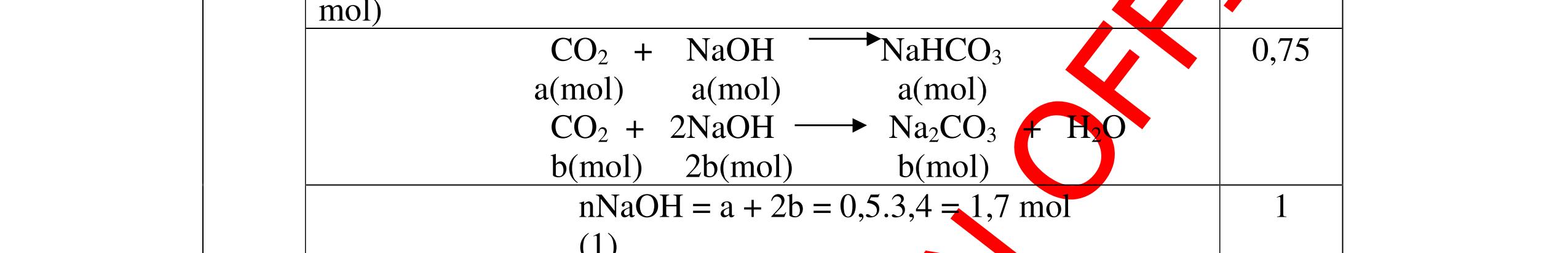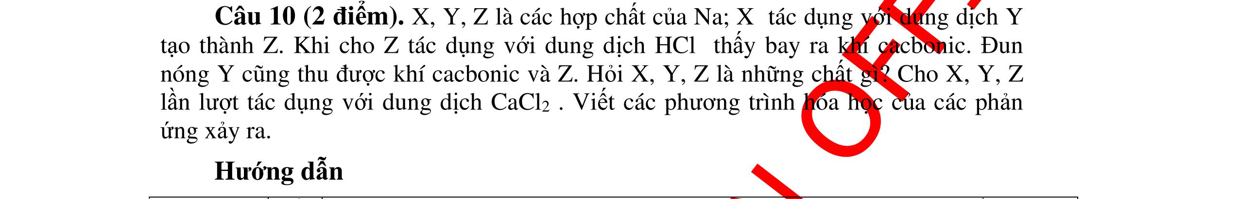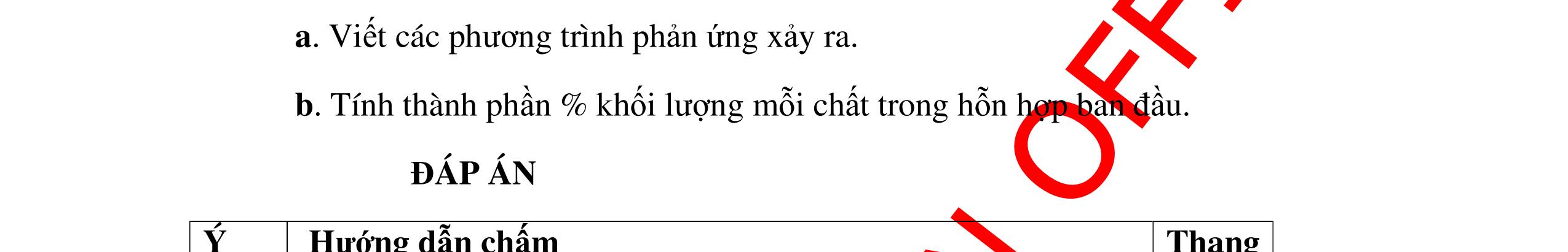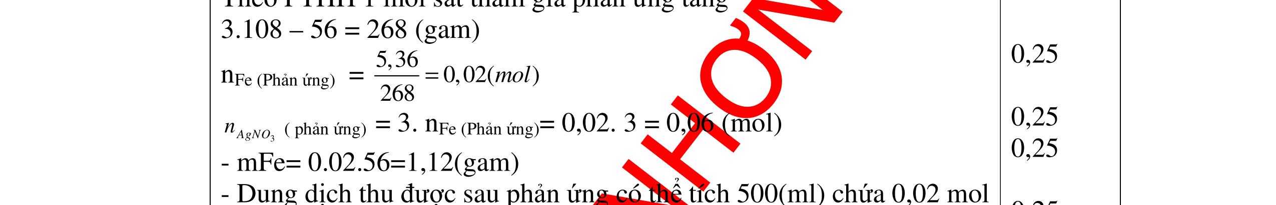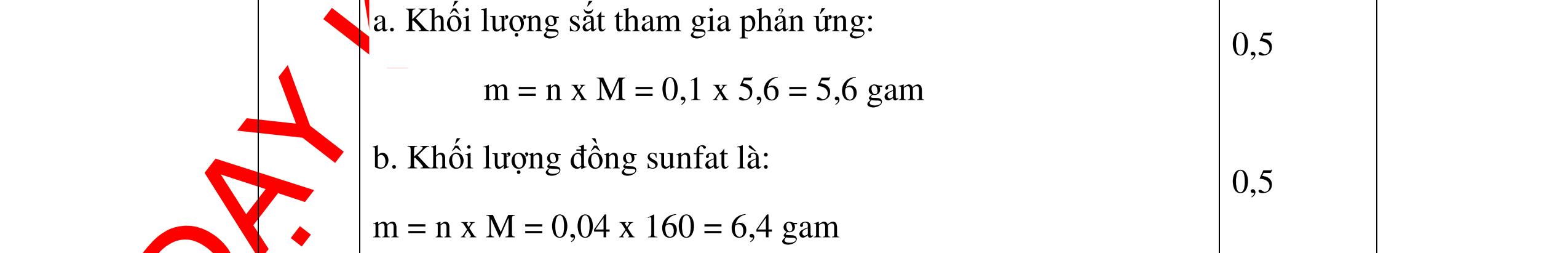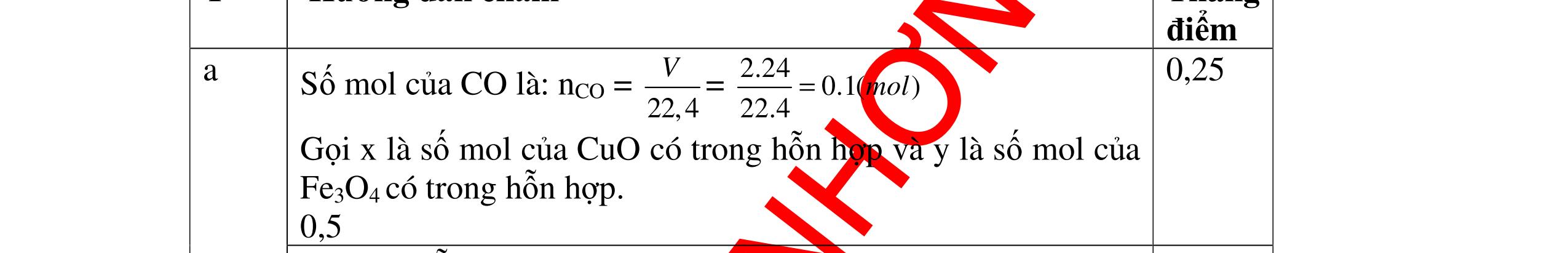 DẠYKÈMQUYNHƠNOFFICIAL Câu Hướng dẫn chấm Điểm 26 a. 4FeS2 + 11O2 0t → 8SO2 + 2Fe2O3 b. 2AgNO3 + CuCl2 → 2AgCl + Cu(NO3)2 c. 2Na + 2H2O → 2NaOH + H2 d. 2Fe3O4 + 8H2 0t → 6Fe + 8H2O e. 2Fe + 3Cl2 0t → 2FeCl3 f. 3Ca + 2H3PO4 → Ca3(PO4)2 + 3H2 g.CaCO3 + HCl → CaCl2 +H2O+CO2↑ h.Mg + HNO3 → Mg(NO3)2 +NO +H2O i.2KMnO4 0t → K2MnO4 +O2 +MnO2 k.2NaOH + CuCl2 → Cu(OH)2 +2NaCl 0,5 0,5 0,5 0,5 0,5 0,5 0,5 0,5 0,5 0,5 Câu27.(5điểm): 1. Phảnứngcủacâyxanhquanghợptạoratinhbộtvàkhíoxiđượcthểhiện bằngsơđồ: CO2 + H2O → ChÊt diÖp lôc ¸nh s¸ng (C6H10O5)n + O2 (khícacbonic) (nước) (tinhbột) (khíoxi) a)Hãylậpphươngtrìnhhoáhọcchosơđồphảnứngtrên. b)Chobiếttỉlệgiữasốphântửkhícacbonic(CO2)vàsốphântửnước. 2. Lậpphươngtrình hoáhọccủaphảnứngtheosơđồsau: a) CaCO3 + HCl → CaCl2 +H2O+CO2↑ b)Mg + HNO3 → Mg(NO3)2 +NO +H2O c)KMnO4 ot → K2MnO4 +O2 +MnO2 Câu Hướng dẫn chấm Điểm 27 1. 6nCO2 + 5nH2O ChÊtdiÖplôc/¸nhs¸ng → (C6H10O5)n +6nO2 Tinh bột -TỉlệsốphântửkhíCO2 vàphântửhơinướclà: 22 COHO n:n6:5 = . 1,0 1,0 2.LậpPTHHđúngcủamỗitrườnghợpcho a) CaCO3 + 2HCl → CaCl2 +H2O+CO2↑ b) 3Mg + 8HNO3 → 3Mg(NO3)2 +2NO +4H2O c) 2KMnO4 ot → K2MnO4 +O2 +MnO2 d) 2NaOH + CuCl2 → Cu(OH)2 +2NaCl 0,75 0,75 0,75 0,75