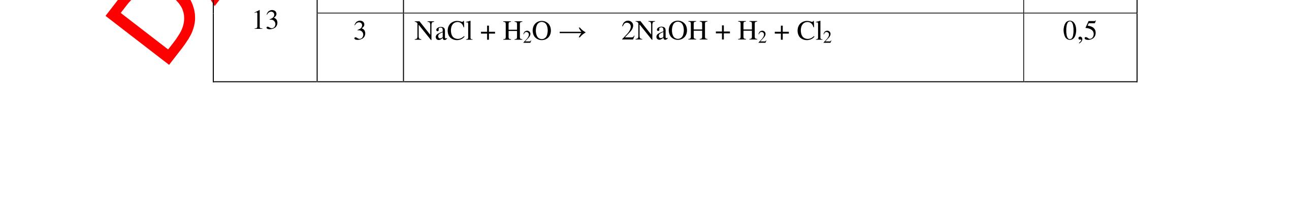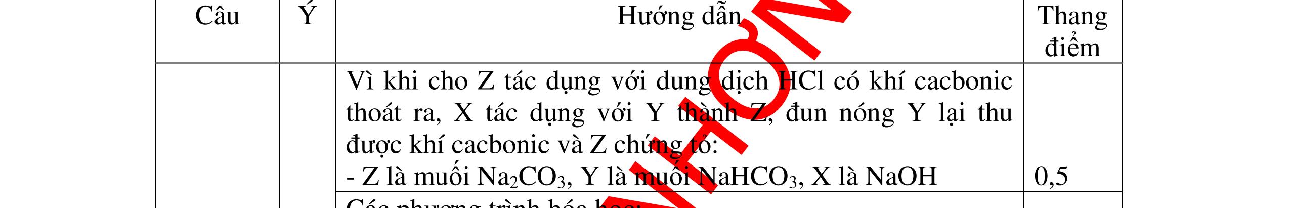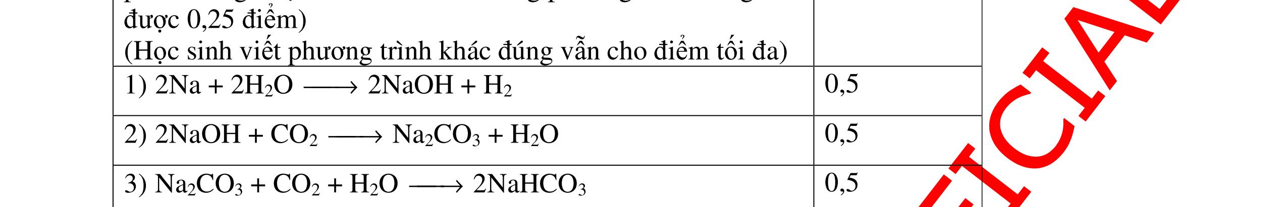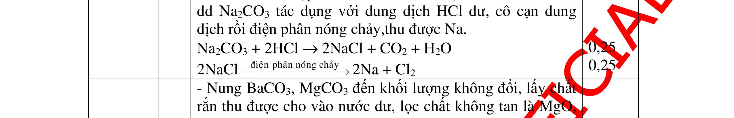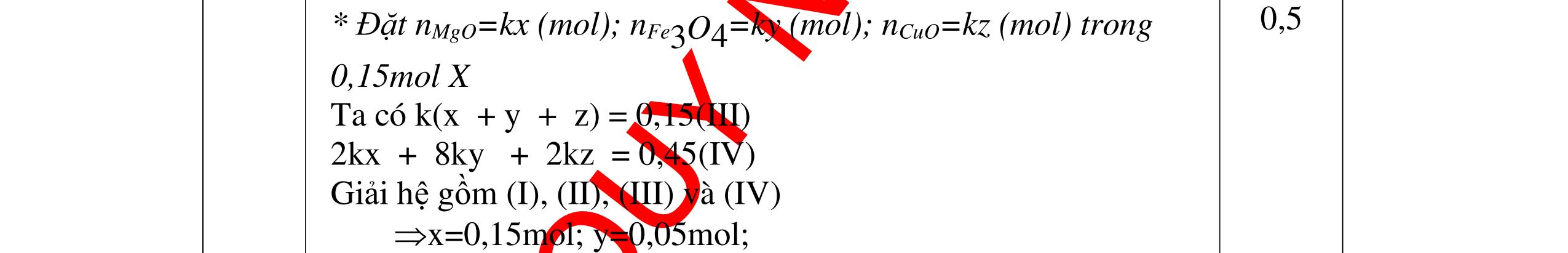 DẠYKÈMQUYNHƠNOFFICIAL Câu Hướng dẫn chấm Điểm 26 a. 4FeS2 + 11O2 0t → 8SO2 + 2Fe2O3 b. 2AgNO3 + CuCl2 → 2AgCl + Cu(NO3)2 c. 2Na + 2H2O → 2NaOH + H2 d. 2Fe3O4 + 8H2 0t → 6Fe + 8H2O e. 2Fe + 3Cl2 0t → 2FeCl3 f. 3Ca + 2H3PO4 → Ca3(PO4)2 + 3H2 g.CaCO3 + HCl → CaCl2 +H2O+CO2↑ h.Mg + HNO3 → Mg(NO3)2 +NO +H2O i.2KMnO4 0t → K2MnO4 +O2 +MnO2 k.2NaOH + CuCl2 → Cu(OH)2 +2NaCl 0,5 0,5 0,5 0,5 0,5 0,5 0,5 0,5 0,5 0,5 Câu27.(5điểm): 1. Phảnứngcủacâyxanhquanghợptạoratinhbộtvàkhíoxiđượcthểhiện bằngsơđồ: CO2 + H2O → ChÊt diÖp lôc ¸nh s¸ng (C6H10O5)n + O2 (khícacbonic) (nước) (tinhbột) (khíoxi) a)Hãylậpphươngtrìnhhoáhọcchosơđồphảnứngtrên. b)Chobiếttỉlệgiữasốphântửkhícacbonic(CO2)vàsốphântửnước. 2. Lậpphươngtrình hoáhọccủaphảnứngtheosơđồsau: a) CaCO3 + HCl → CaCl2 +H2O+CO2↑ b)Mg + HNO3 → Mg(NO3)2 +NO +H2O c)KMnO4 ot → K2MnO4 +O2 +MnO2 Câu Hướng dẫn chấm Điểm 27 1. 6nCO2 + 5nH2O ChÊtdiÖplôc/¸nhs¸ng → (C6H10O5)n +6nO2 Tinh bột -TỉlệsốphântửkhíCO2 vàphântửhơinướclà: 22 COHO n:n6:5 = . 1,0 1,0 2.LậpPTHHđúngcủamỗitrườnghợpcho a) CaCO3 + 2HCl → CaCl2 +H2O+CO2↑ b) 3Mg + 8HNO3 → 3Mg(NO3)2 +2NO +4H2O c) 2KMnO4 ot → K2MnO4 +O2 +MnO2 d) 2NaOH + CuCl2 → Cu(OH)2 +2NaCl 0,75 0,75 0,75 0,75