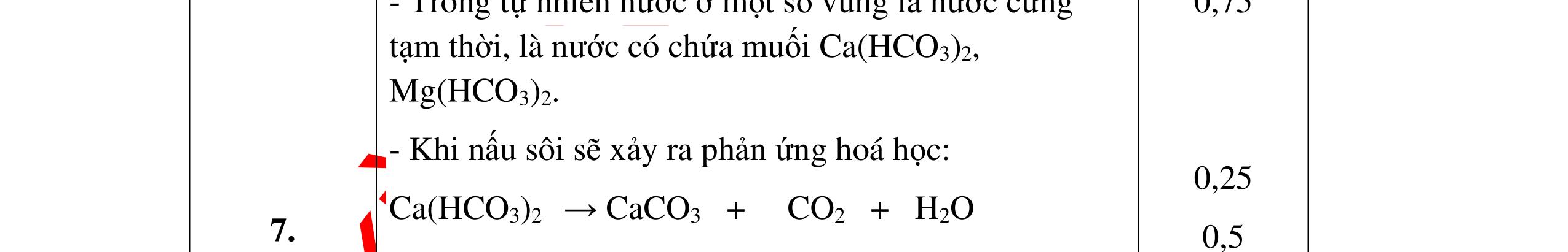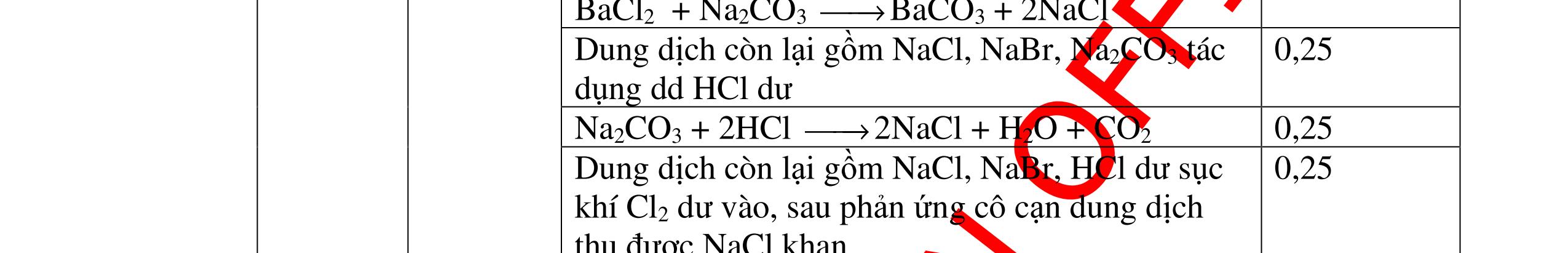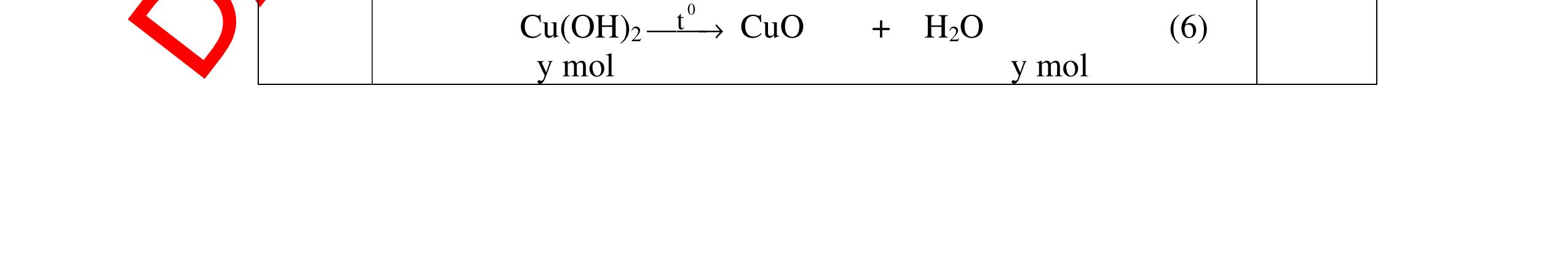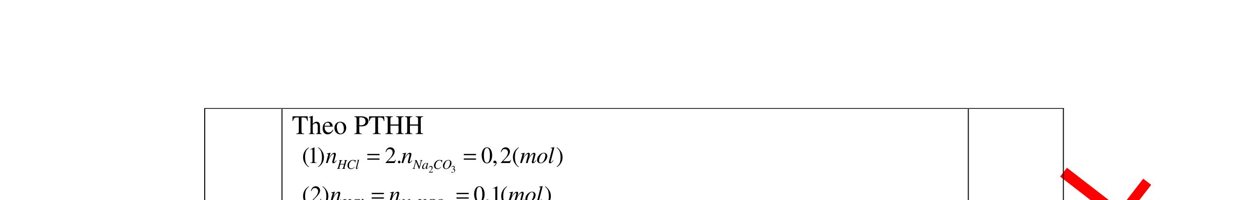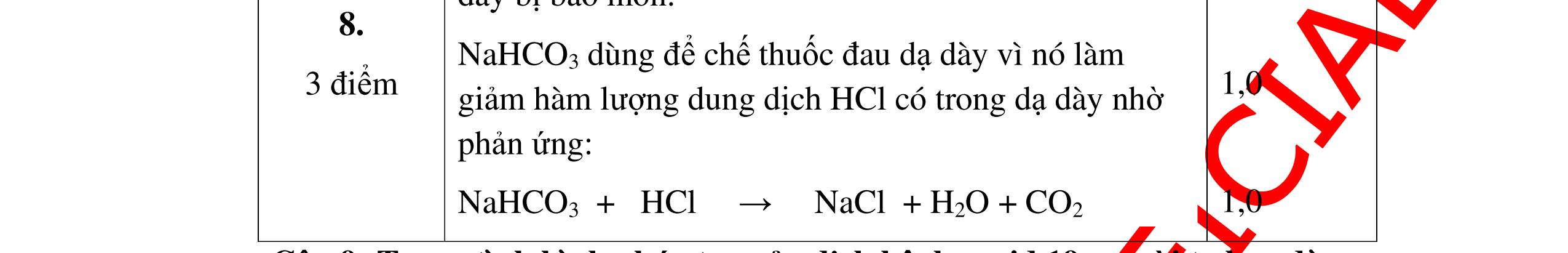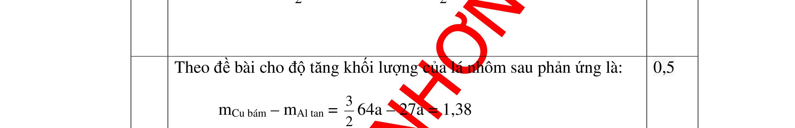 DẠYKÈMQUYNHƠNOFFICIAL Câu Hướng dẫn chấm Điểm 26 a. 4FeS2 + 11O2 0t → 8SO2 + 2Fe2O3 b. 2AgNO3 + CuCl2 → 2AgCl + Cu(NO3)2 c. 2Na + 2H2O → 2NaOH + H2 d. 2Fe3O4 + 8H2 0t → 6Fe + 8H2O e. 2Fe + 3Cl2 0t → 2FeCl3 f. 3Ca + 2H3PO4 → Ca3(PO4)2 + 3H2 g.CaCO3 + HCl → CaCl2 +H2O+CO2↑ h.Mg + HNO3 → Mg(NO3)2 +NO +H2O i.2KMnO4 0t → K2MnO4 +O2 +MnO2 k.2NaOH + CuCl2 → Cu(OH)2 +2NaCl 0,5 0,5 0,5 0,5 0,5 0,5 0,5 0,5 0,5 0,5 Câu27.(5điểm): 1. Phảnứngcủacâyxanhquanghợptạoratinhbộtvàkhíoxiđượcthểhiện bằngsơđồ: CO2 + H2O → ChÊt diÖp lôc ¸nh s¸ng (C6H10O5)n + O2 (khícacbonic) (nước) (tinhbột) (khíoxi) a)Hãylậpphươngtrìnhhoáhọcchosơđồphảnứngtrên. b)Chobiếttỉlệgiữasốphântửkhícacbonic(CO2)vàsốphântửnước. 2. Lậpphươngtrình hoáhọccủaphảnứngtheosơđồsau: a) CaCO3 + HCl → CaCl2 +H2O+CO2↑ b)Mg + HNO3 → Mg(NO3)2 +NO +H2O c)KMnO4 ot → K2MnO4 +O2 +MnO2 Câu Hướng dẫn chấm Điểm 27 1. 6nCO2 + 5nH2O ChÊtdiÖplôc/¸nhs¸ng → (C6H10O5)n +6nO2 Tinh bột -TỉlệsốphântửkhíCO2 vàphântửhơinướclà: 22 COHO n:n6:5 = . 1,0 1,0 2.LậpPTHHđúngcủamỗitrườnghợpcho a) CaCO3 + 2HCl → CaCl2 +H2O+CO2↑ b) 3Mg + 8HNO3 → 3Mg(NO3)2 +2NO +4H2O c) 2KMnO4 ot → K2MnO4 +O2 +MnO2 d) 2NaOH + CuCl2 → Cu(OH)2 +2NaCl 0,75 0,75 0,75 0,75
