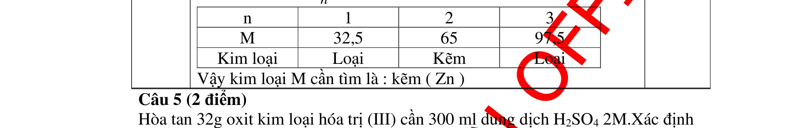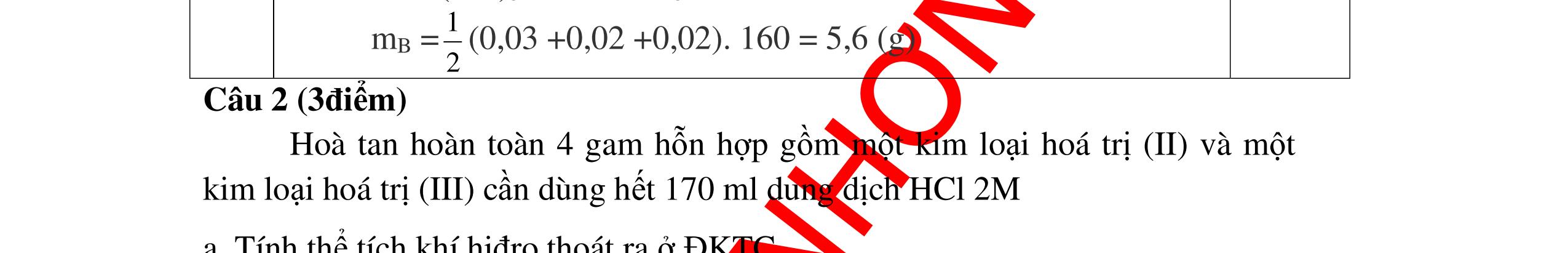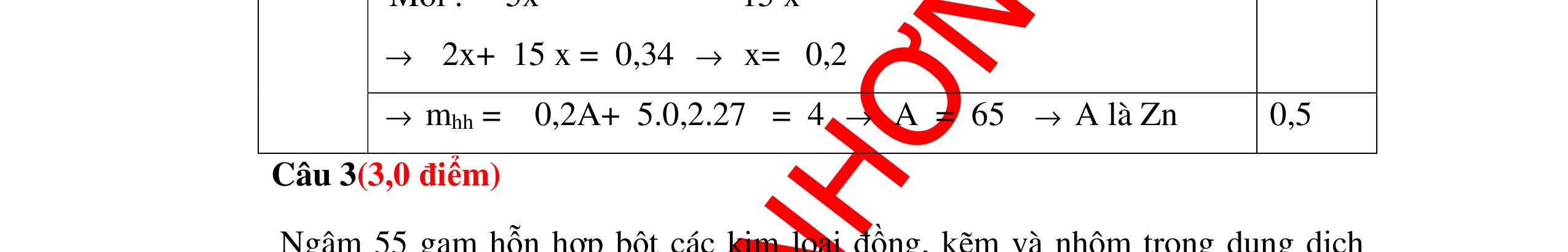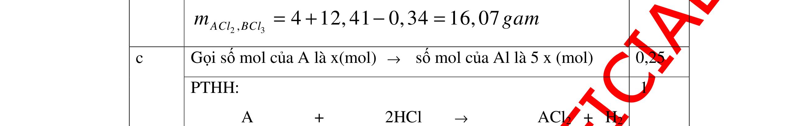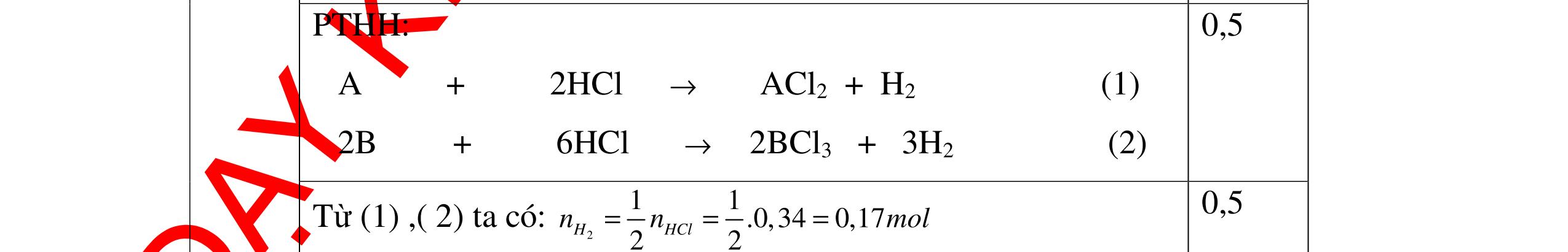 DẠYKÈMQUYNHƠNOFFICIAL Hóa trị của kim loại có thể là: I, II, III, do đó ta xét bảng sau: n 1 2 3 M 32,5 65 9,5 Nhận xét Loại M là kẽm( Zn) Loại 0.5 Trong các kim loại trên thì kẽm = 65 là phù hợp 0,25 Câu 16 ( 2,5 điểm): Để hòa tan hoàn toàn 4 gam hỗn hợp gồm một kim loại hóa trị II và một kim loại hóa trị III phải dùng 12,41gam HCl. Nếu biết kim loại hóa trị III là Al và nó có số mol gấp 5 lần số mol kim loại hóa trị II. Hãy xác định kim loại hóa trị II. 16