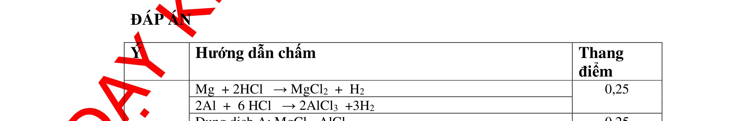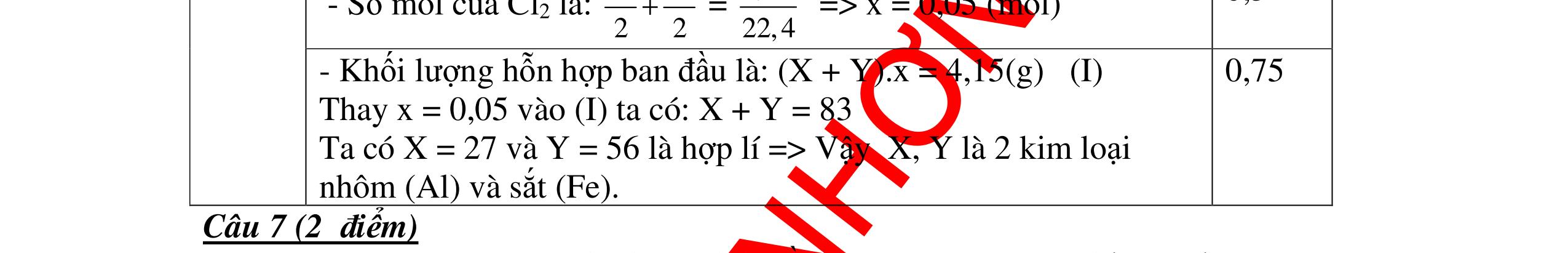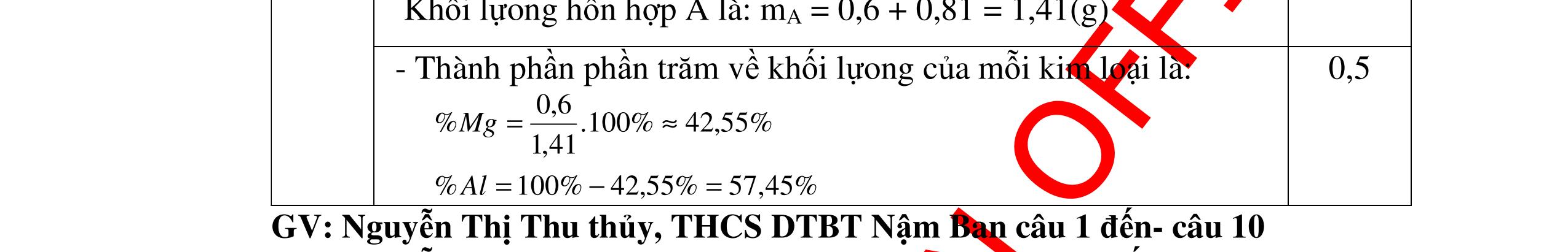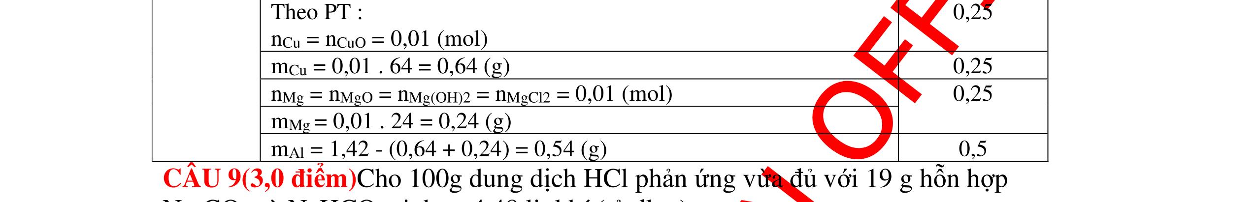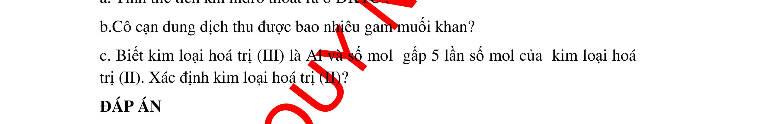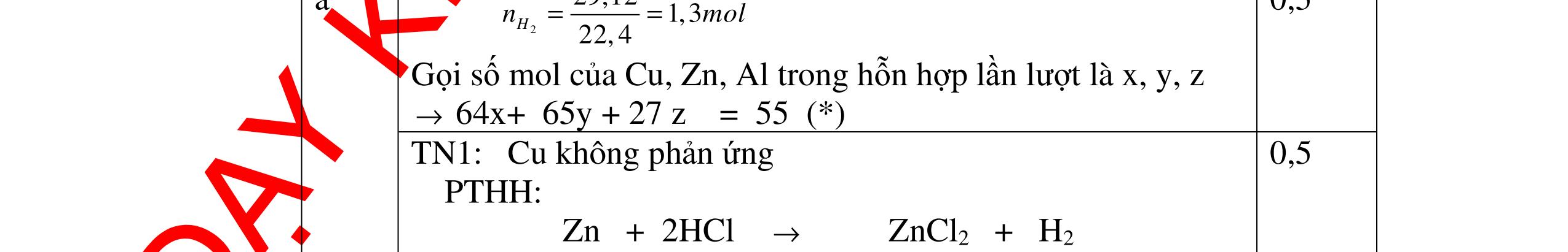 DẠYKÈMQUYNHƠNOFFICIAL Hóa trị của kim loại có thể là: I, II, III, do đó ta xét bảng sau: n 1 2 3 M 32,5 65 9,5 Nhận xét Loại M là kẽm( Zn) Loại 0.5 Trong các kim loại trên thì kẽm = 65 là phù hợp 0,25 Câu 16 ( 2,5 điểm): Để hòa tan hoàn toàn 4 gam hỗn hợp gồm một kim loại hóa trị II và một kim loại hóa trị III phải dùng 12,41gam HCl. Nếu biết kim loại hóa trị III là Al và nó có số mol gấp 5 lần số mol kim loại hóa trị II. Hãy xác định kim loại hóa trị II. 16