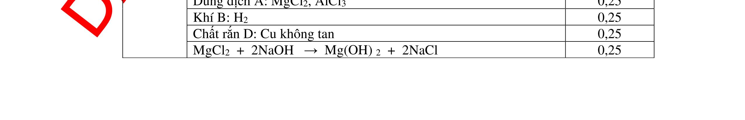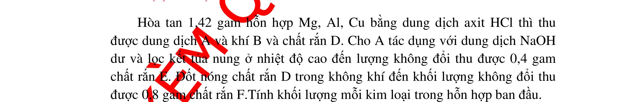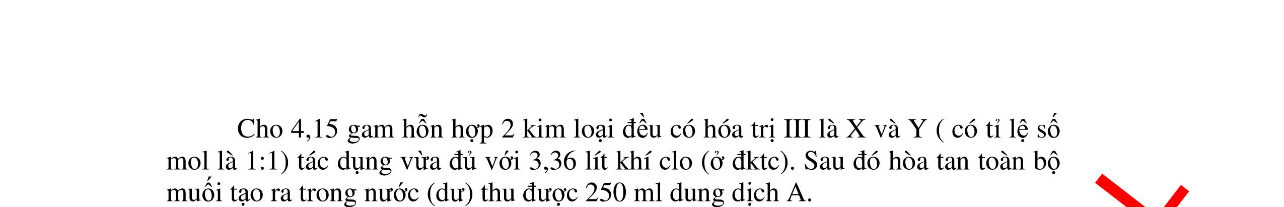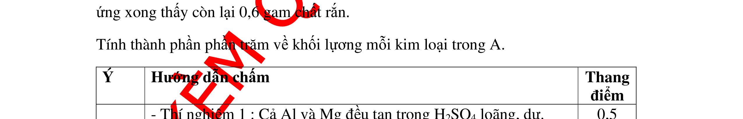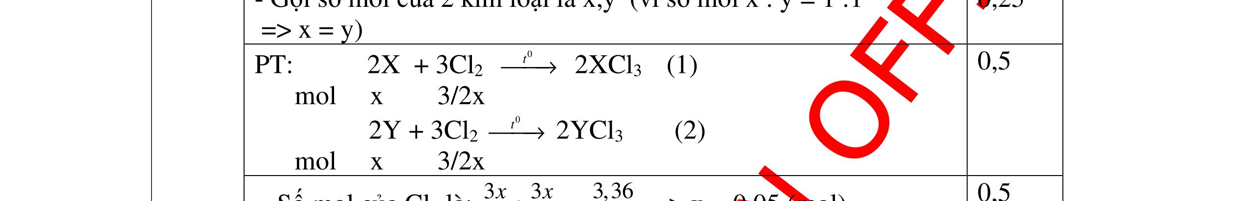 DẠYKÈMQUYNHƠNOFFICIAL Hóa trị của kim loại có thể là: I, II, III, do đó ta xét bảng sau: n 1 2 3 M 32,5 65 9,5 Nhận xét Loại M là kẽm( Zn) Loại 0.5 Trong các kim loại trên thì kẽm = 65 là phù hợp 0,25 Câu 16 ( 2,5 điểm): Để hòa tan hoàn toàn 4 gam hỗn hợp gồm một kim loại hóa trị II và một kim loại hóa trị III phải dùng 12,41gam HCl. Nếu biết kim loại hóa trị III là Al và nó có số mol gấp 5 lần số mol kim loại hóa trị II. Hãy xác định kim loại hóa trị II. 16