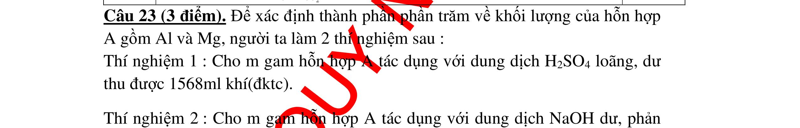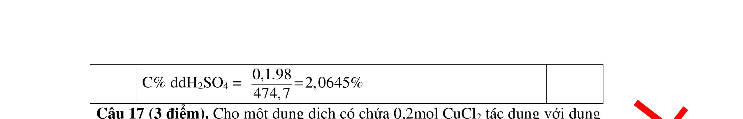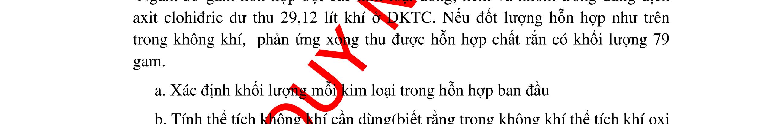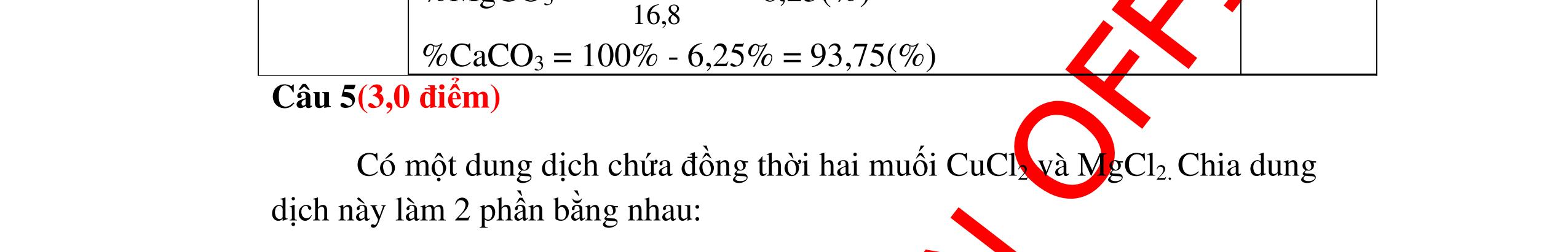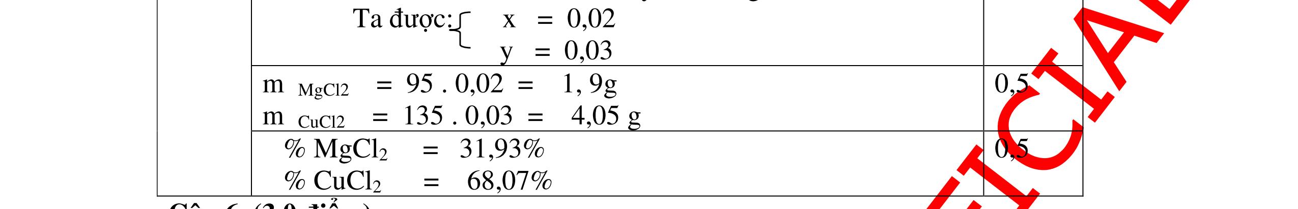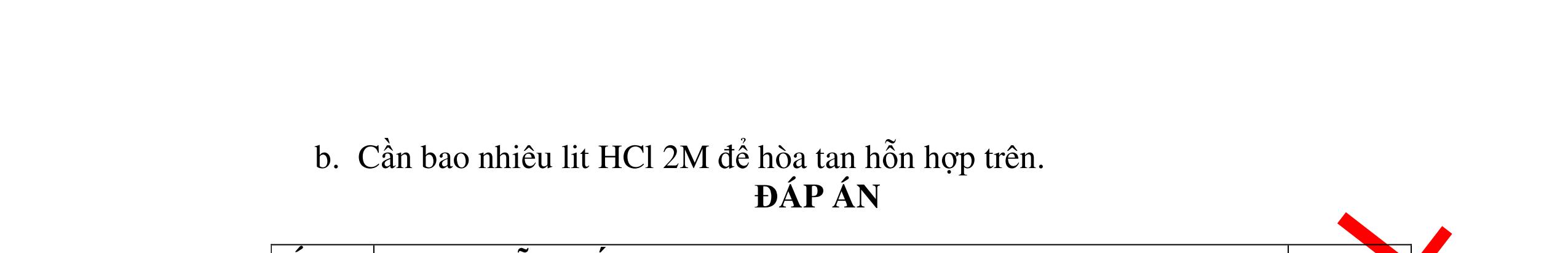 DẠYKÈMQUYNHƠNOFFICIAL Hóa trị của kim loại có thể là: I, II, III, do đó ta xét bảng sau: n 1 2 3 M 32,5 65 9,5 Nhận xét Loại M là kẽm( Zn) Loại 0.5 Trong các kim loại trên thì kẽm = 65 là phù hợp 0,25 Câu 16 ( 2,5 điểm): Để hòa tan hoàn toàn 4 gam hỗn hợp gồm một kim loại hóa trị II và một kim loại hóa trị III phải dùng 12,41gam HCl. Nếu biết kim loại hóa trị III là Al và nó có số mol gấp 5 lần số mol kim loại hóa trị II. Hãy xác định kim loại hóa trị II. 16