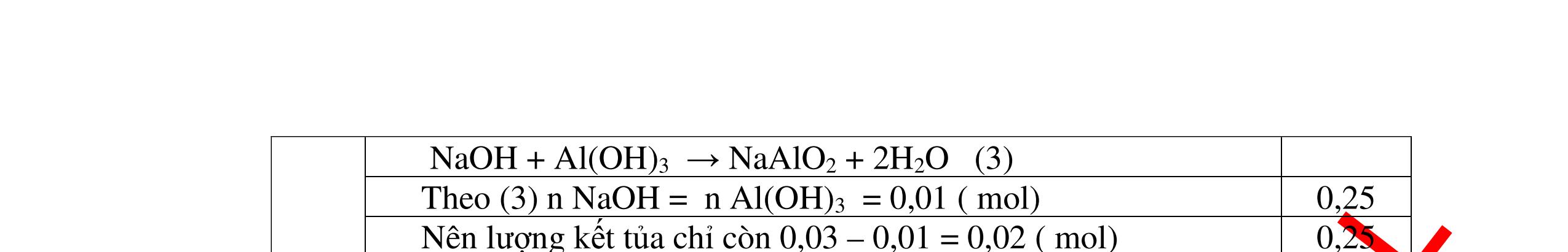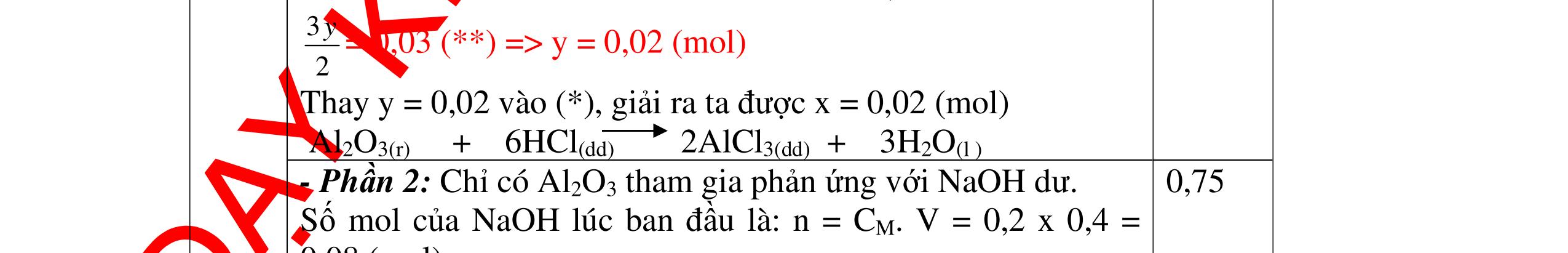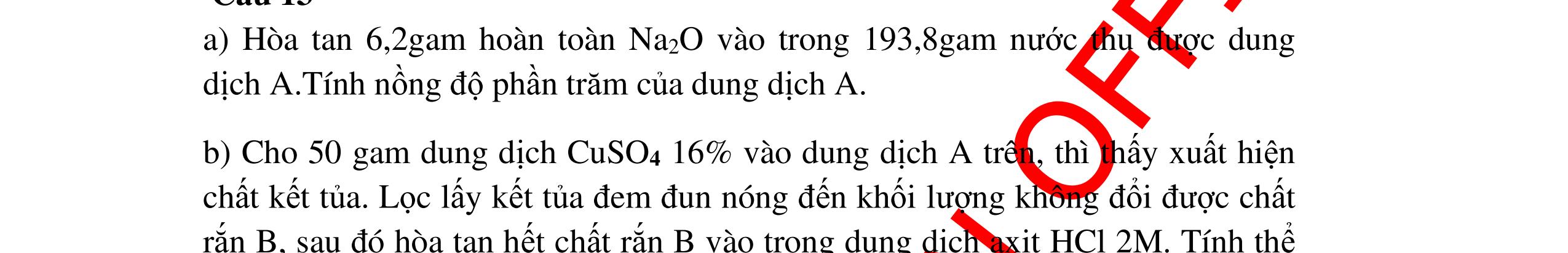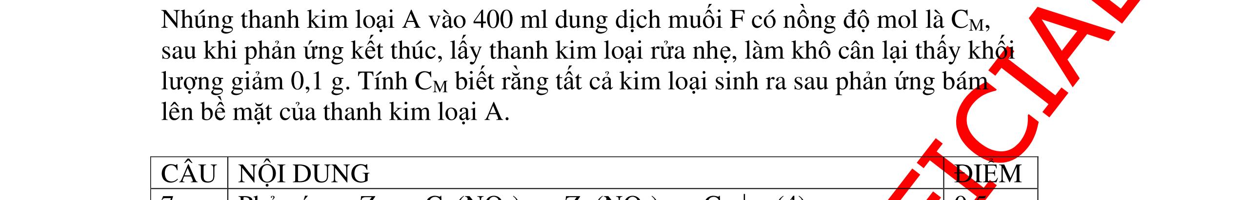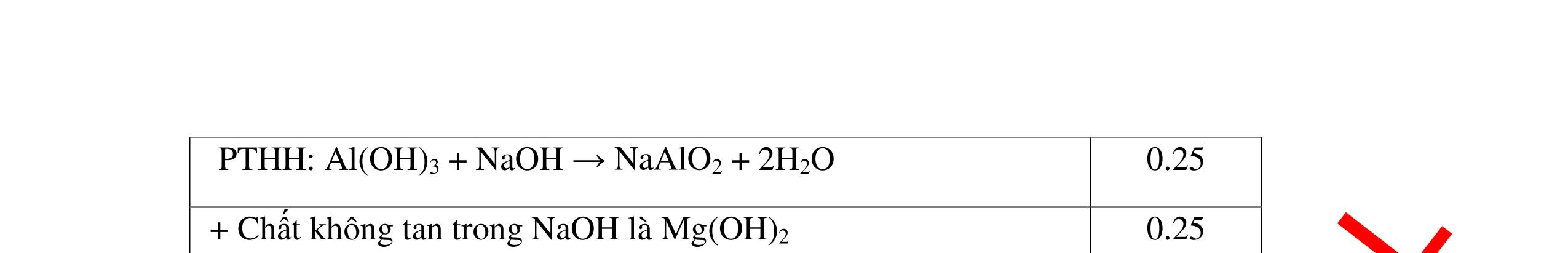 DẠYKÈMQUYNHƠNOFFICIAL Hóa trị của kim loại có thể là: I, II, III, do đó ta xét bảng sau: n 1 2 3 M 32,5 65 9,5 Nhận xét Loại M là kẽm( Zn) Loại 0.5 Trong các kim loại trên thì kẽm = 65 là phù hợp 0,25 Câu 16 ( 2,5 điểm): Để hòa tan hoàn toàn 4 gam hỗn hợp gồm một kim loại hóa trị II và một kim loại hóa trị III phải dùng 12,41gam HCl. Nếu biết kim loại hóa trị III là Al và nó có số mol gấp 5 lần số mol kim loại hóa trị II. Hãy xác định kim loại hóa trị II. 16
