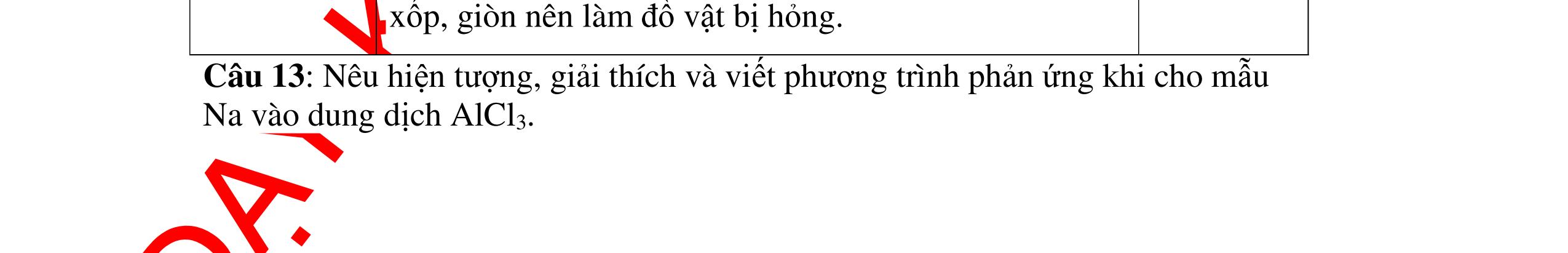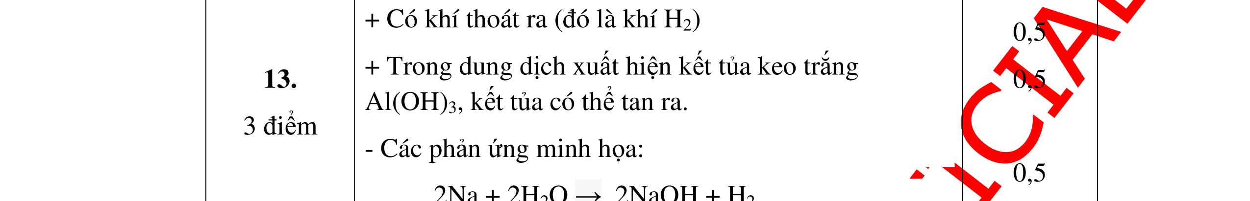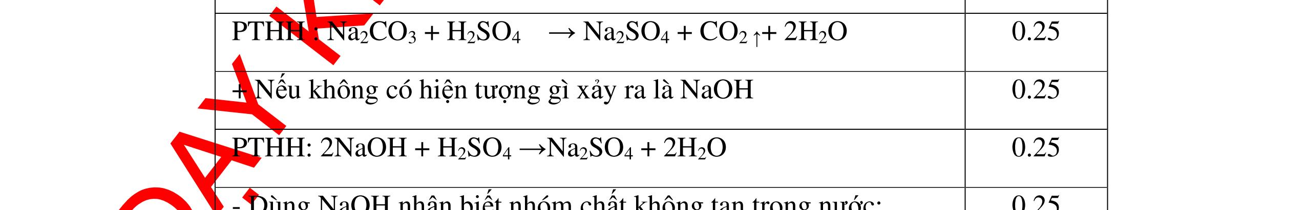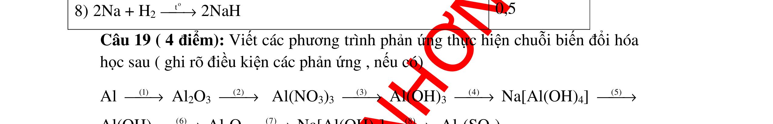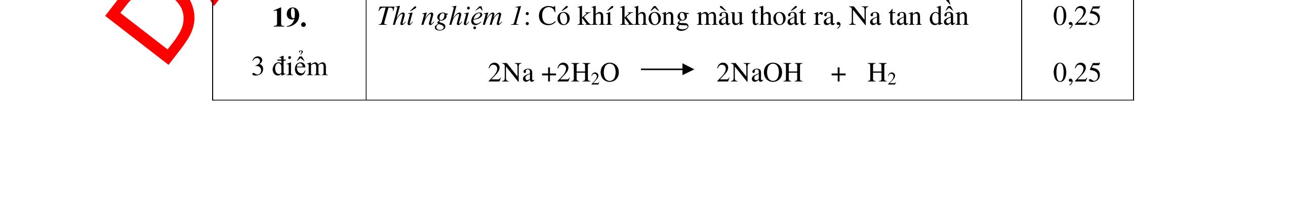 DẠYKÈMQUYNHƠNOFFICIAL + PTHH: 2Na + 2H2O → 2NaOH + H2 2H2 + O2 ot → 2H2O 0,25 0,25 b) Xuất hiện kết tủa trắng. Na2CO3 + Ca(OH)2 → CaCO3 + 2NaOH 0,5 0,5 Câu 4: Nêu hiện tượng và viết phương trình hóa học xảy ra khi: a) Cho một mẩu natri nhỏ vào cốc đựng nước có bỏ sẵn một mẩu giấy quỳ tím. b) Cho một lá nhôm vào ống nghiệm đựng dung dịch axit clohidric. 4. 2 điểm a) Natri nóng chảy thành giọt tròn chuyển động nhanh trên mặt nước, mẩu Natri tan dần, có khí không màu thoát ra, quỳ tím chuyển dần sang màu xanh. 2Na + 2H2O → 2NaOH + H2 b) Nhôm tan dần a) Nhỏ dung dịch Na2SO4 vào dung dị