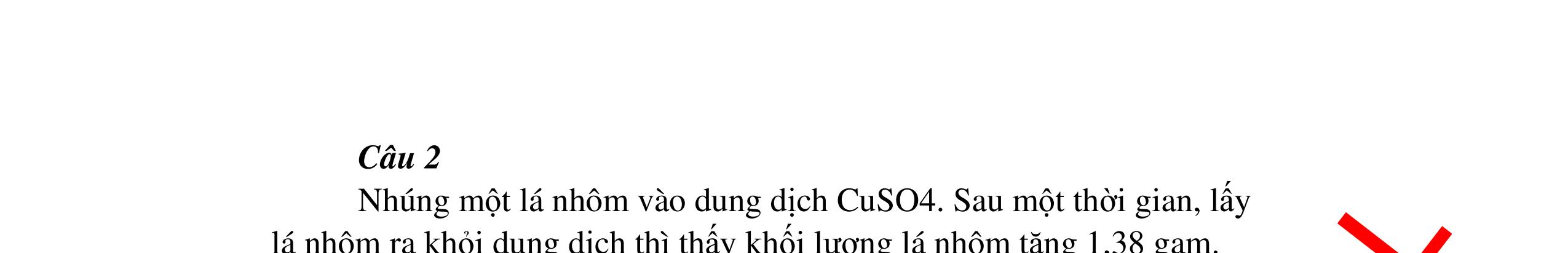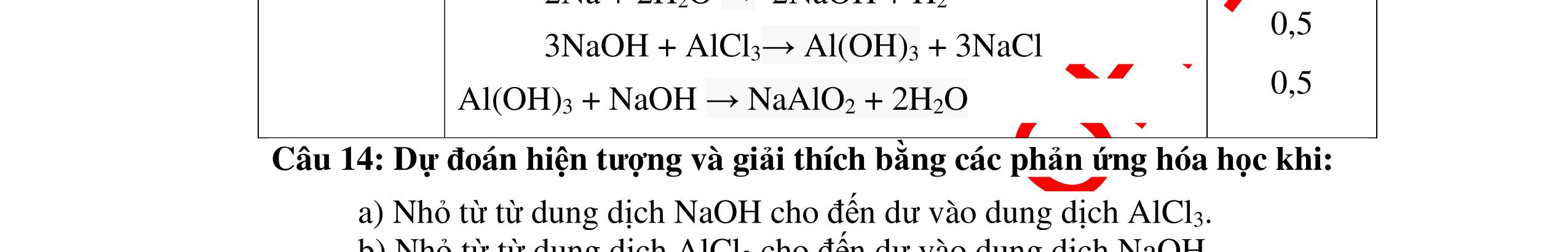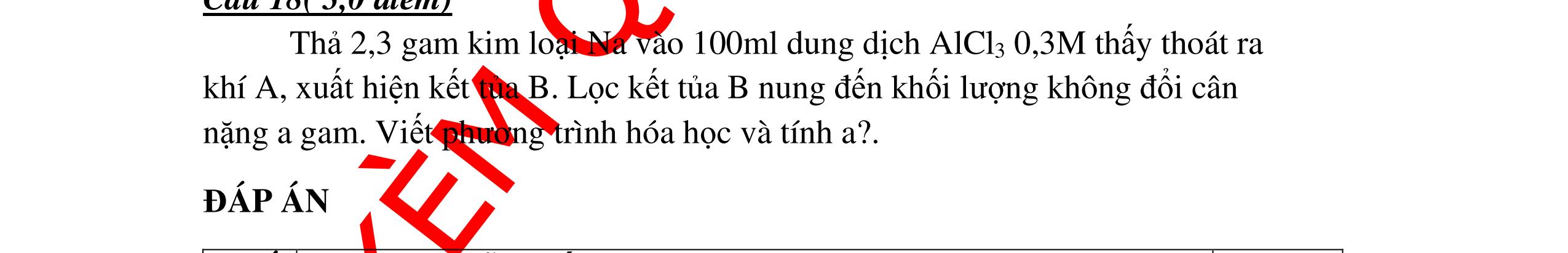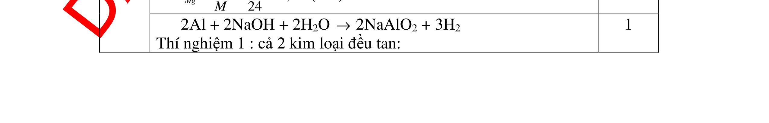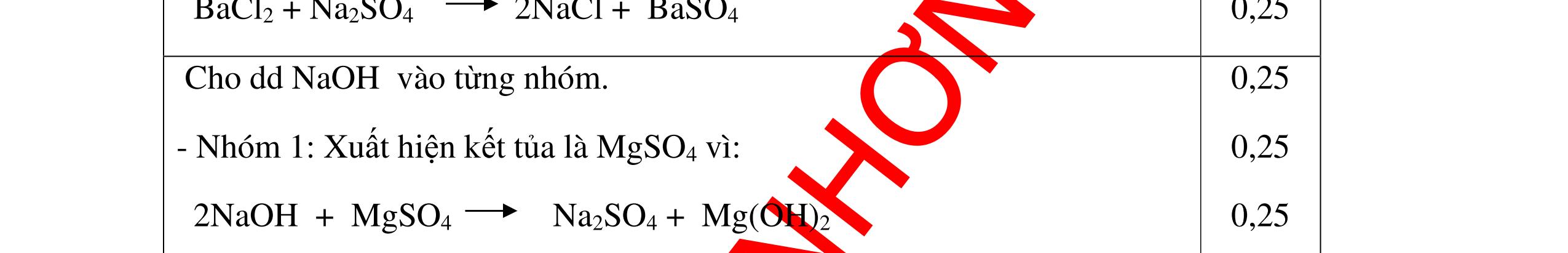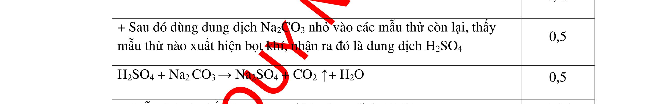 DẠYKÈMQUYNHƠNOFFICIAL + PTHH: 2Na + 2H2O → 2NaOH + H2 2H2 + O2 ot → 2H2O 0,25 0,25 b) Xuất hiện kết tủa trắng. Na2CO3 + Ca(OH)2 → CaCO3 + 2NaOH 0,5 0,5 Câu 4: Nêu hiện tượng và viết phương trình hóa học xảy ra khi: a) Cho một mẩu natri nhỏ vào cốc đựng nước có bỏ sẵn một mẩu giấy quỳ tím. b) Cho một lá nhôm vào ống nghiệm đựng dung dịch axit clohidric. 4. 2 điểm a) Natri nóng chảy thành giọt tròn chuyển động nhanh trên mặt nước, mẩu Natri tan dần, có khí không màu thoát ra, quỳ tím chuyển dần sang màu xanh. 2Na + 2H2O → 2NaOH + H2 b) Nhôm tan dần a) Nhỏ dung dịch Na2SO4 vào dung dị